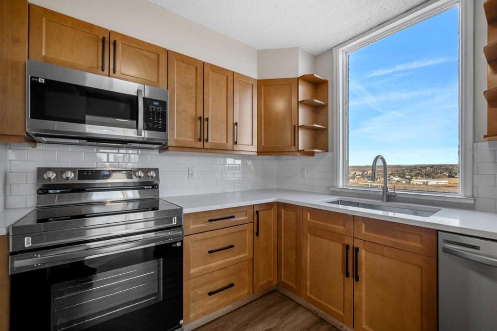 Inside, the bright and open layout has been freshly painted, creating a functional and inviting space perfect for everyday living and entertaining. Thoughtful updates include wide neutral luxury vinyl plank flooring throughout, a beautifully renovated kitchen with solid wood cabinetry featuring dovetail drawers, imported quartz countertops, a tiled backsplash, and brand-new stainless steel appliances. Natural light fills the space, highlighting the modern finishes and expansive views.