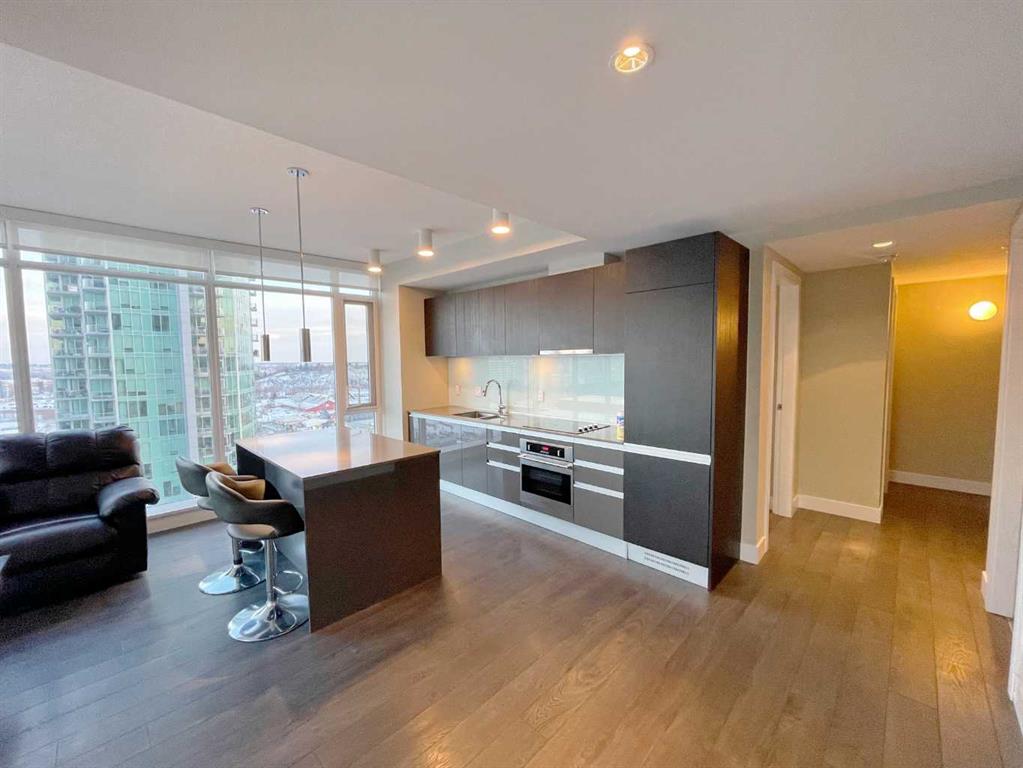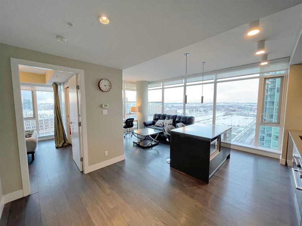 Welcome to The Guardian, Calgary’s tallest and one of its most sophisticated residential towers, where contemporary design meets vibrant urban living. This stunning corner unit offers 2 bedrooms and 2 bathrooms with a smart split-bedroom layout that maximizes privacy, along with floor-to-ceiling windows that frame breathtaking panoramic views of downtown, the river, East Village, and Stampede Park—often extending all the way to the mountains on a clear day. The open-concept living area is anchored by a sleek modern kitchen featuring quartz countertops, a large island with breakfast-bar seating, high-end stainless-steel appliances including an integrated refrigerator and concealed hood fan, and streamlined European-inspired cabinetry. The spacious primary bedroom includes a serene, spa-like ensuite, while the second bedroom enjoys its own private location at the front corner of the home—ideal for guests, roommates, or a home office. Everyday convenience is enhanced by in-suite laundry, titled underground parking, and a separate storage locker. Residents also enjoy exceptional building amenities including a fully equipped fitness centre, yoga studio, concierge service, social lounge, workshop, and a beautiful garden terrace with BBQ areas—perfect for relaxing or entertaining. Ideally located in the heart of historic Victoria Park, you’re just steps from the Saddledome, Stampede Park, Studio Bell, the Central Library, C-Train access, river pathways, restaurants, cafés, and the city’s best entertainment. This is elevated urban living at its finest.