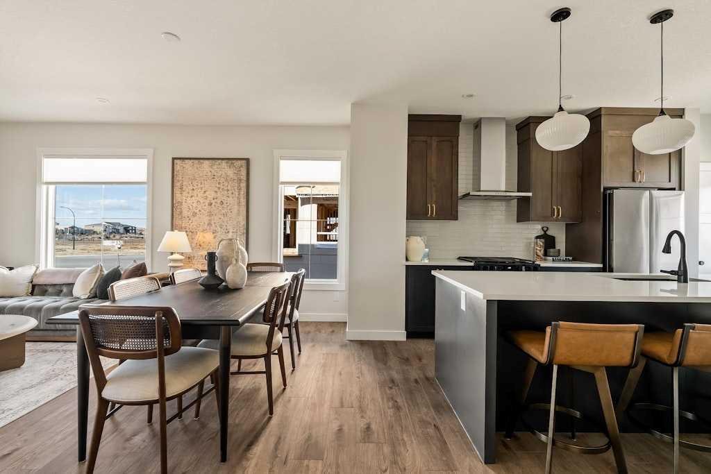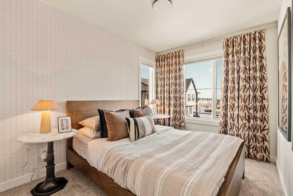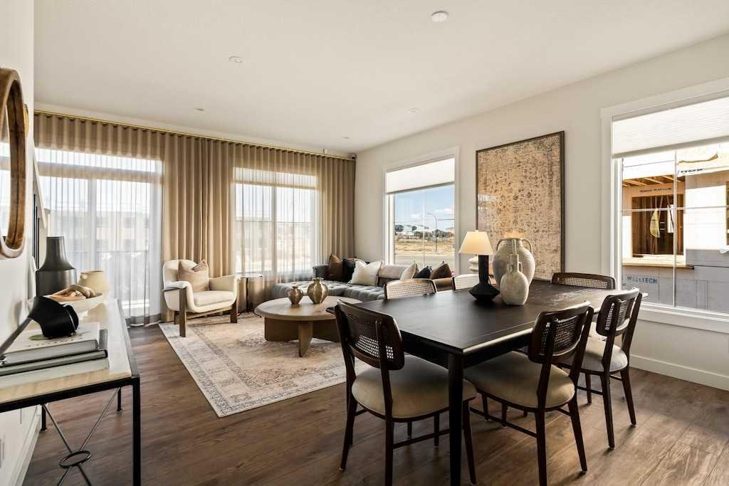 The brand new ‘Holiday’ model by Brookfield Residential is now available in the vibrant community of Livingston! This brand-new END-UNIT townhome blends contemporary design with everyday functionality, offering over 1,400 sqft, 3 bedrooms, 2.5 bathrooms, a ground-floor flex/office space, and a private double attached garage – all in one of north Calgary’s most desirable master-planned neighbourhoods. The open-concept main floor showcases a timeless kitchen featuring full-height cabinetry, elegant quartz countertops, a built-in hood fan and microwave, and a premium stainless-steel appliance package. The oversized island with pendant lighting provides the perfect place for casual dining or entertaining. The kitchen flows seamlessly into the bright living and dining areas, highlighted by a wall of windows that flood the space with natural light. Enjoy extra windows and additional natural light – a perk of owning the end-unit townhome! Step out onto your private West-facing balcony – ideal for summer BBQs or a morning coffee while providing optimal sunshine all year long. A large laundry room with additional storage and a convenient 2-piece powder room complete the main level. The upper level features a spacious ~11’ x 12’ primary suite which includes a walk-in closet and a private ensuite with walk-in shower, offering a relaxing retreat at the end of the day. Two additional bedrooms and a full bathroom complete the upper floor, providing plenty of room for family, guests, or a home office. On the lower level, a versatile den off the entryway and private double attached garage offers endless flexibility – the perfect space for a home office, gym, or creative space. The private double attached garage keeps your vehicles warm and secure all year long. This home includes numerous upgrades such as central A/C rough-in, a BBQ gas line + gas line to the kitchen range, 42” upper cabinets, and an enhanced interior selections package. Backed by both Brookfield’s comprehensive builder warranty and Alberta New Home Warranty, this property offers complete peace of mind. Set in Livingston, a dynamic north Calgary community known for its impressive Homeowners Association, state-of-the-art Hub facility, parks, playgrounds, and convenient access to major routes – this is the perfect place to call home. If you’re looking for a low-maintenance townhome that combines style, functionality, and quality craftsmanship – welcome to the Holiday by Brookfield Residential in Livingston. *Please note: Photos are for representation purposes only and exact finishes may vary.