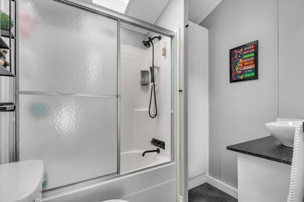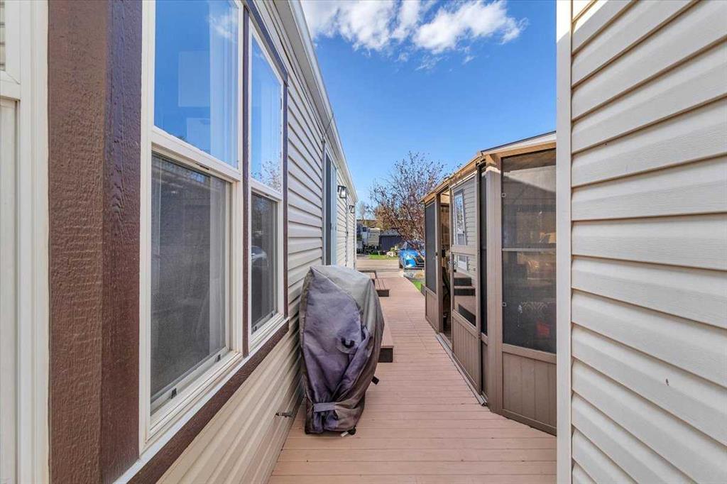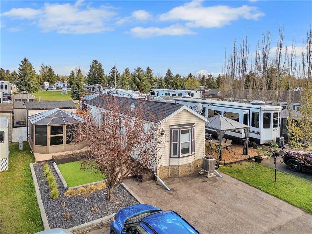 Welcome to Country Lane Estates, a neat RV community alongside the Sheep River and just outside of Okotoks, with close proximity to Calgary! This park has a sense of pride of ownership throughout the community and is seasonal-open from April 1st to October 31st. You will absolutely ENJOY this renovated park model which comes fully furnished with all the furniture inside and out except for the master bed, mattress, office chair and barbeque! You will love the bright, new kitchen, including newer appliances and a pantry in the hallway cabinets (which double up as an entry closet with extra storage), plus the bright cozy dining area with table and chairs. The living room features a newer sofa which doubles up as a hide-a-bed, the 40″ smart TV and a new electric fireplace for those chilly evenings in Alberta. The 4 pc bath comes with a large shower, new vanity and toilet. The laundry area has enough space for the desk which is included and the primary bedroom features a new wall unit as well as extra storage above the bed. This whole unit has been freshly painted and comes with hardwood in the main living area, newer carpet in the bedroom and new flooring in the rest of the home. You have the advantage of a maintenance free yard which is freshly manicured with some green turf, perennials, a large 3 season solarium which includes the furniture and lots of deck area. You will love the 12×12 storage shed which has recently been converted into a bedroom and comes with all the furniture-so convenient for family or guests that come. The Clubhouse at the entrance to the park boasts a fitness gym, an outdoor pool, hot tub, laundry facility, BBQs, meeting spaces and a lounge with pool table, games, books and an auditorium with a stocked kitchenette for larger events that you may want to host. Being that it’s right alongside the river you can enjoy fishing, walks along the river or the walking path in the park so you can stop to chat with neighbors AND your kids will enjoy the playground and the dog park. This is a very friendly RV park that definitely has a great sense of community. This is a bare land condo and the power meters will be installed on each individual lot this June bringing the condo fees down to $188. per month.