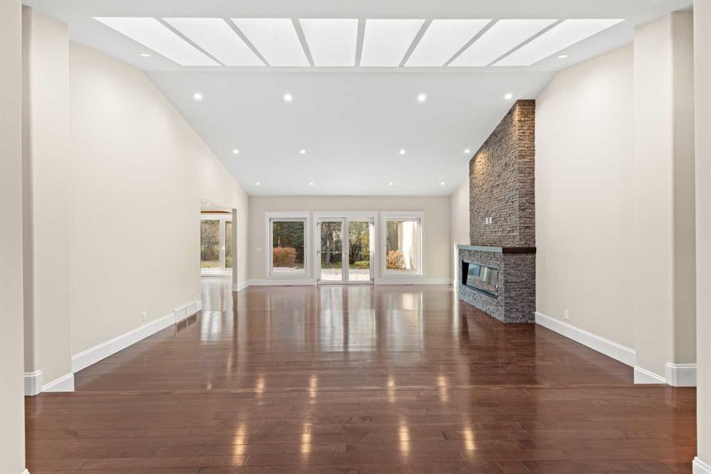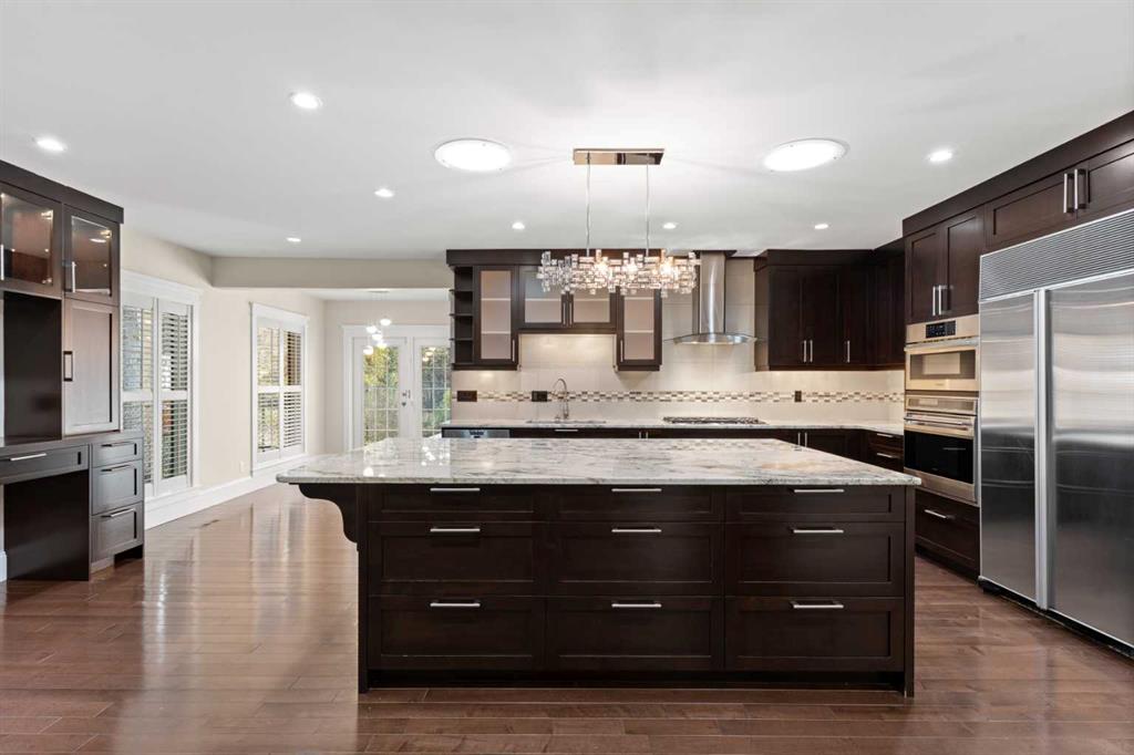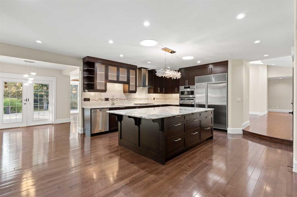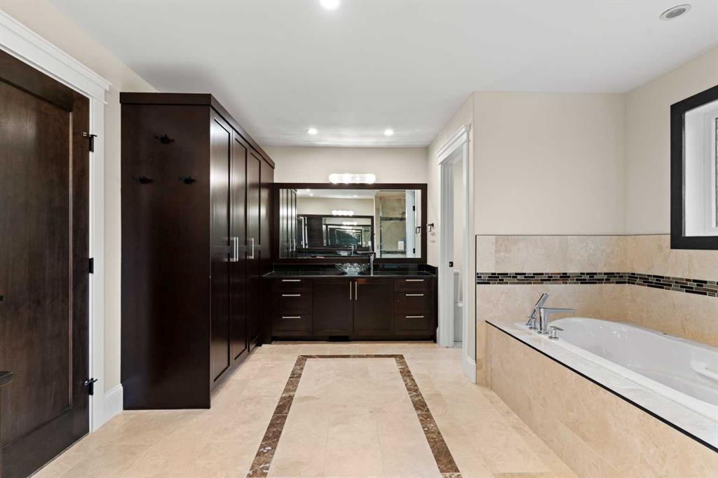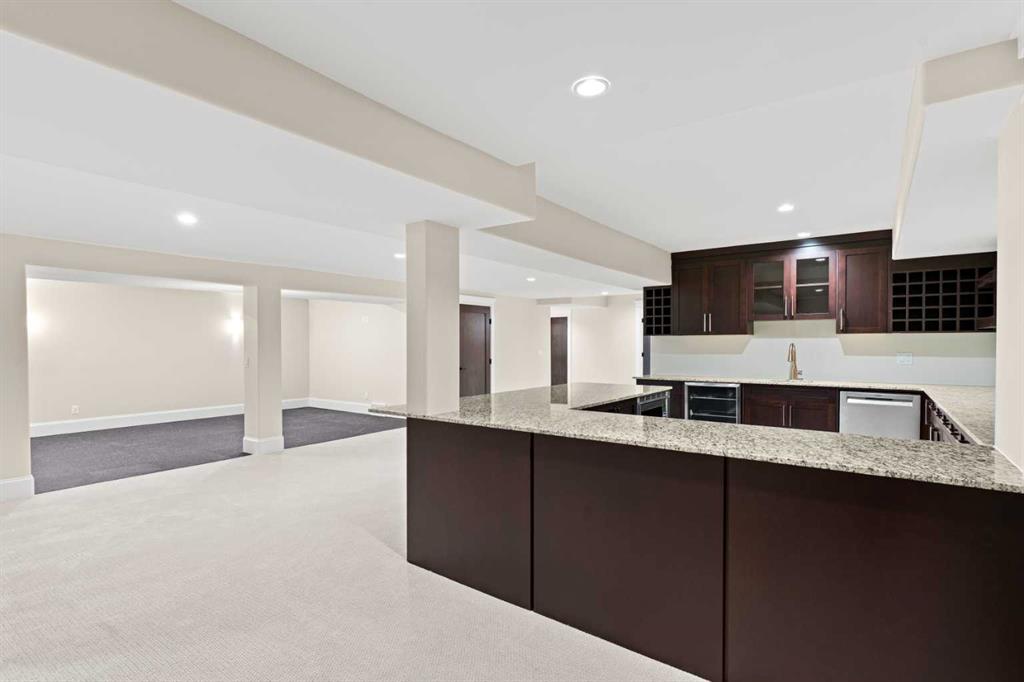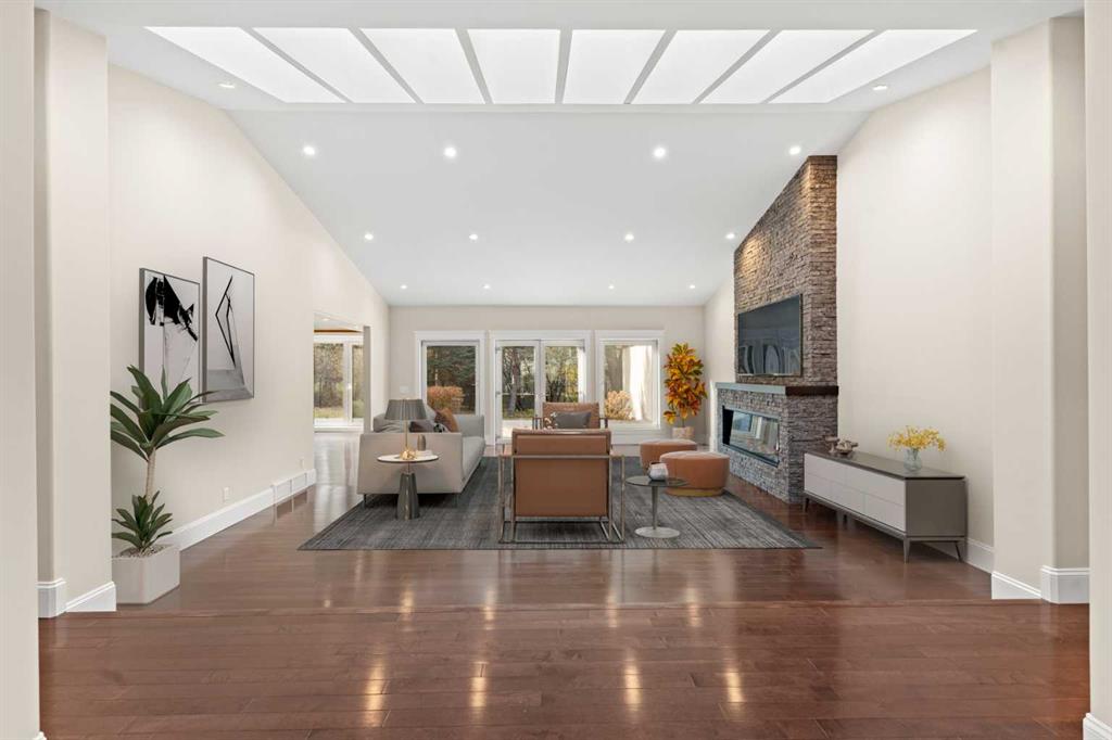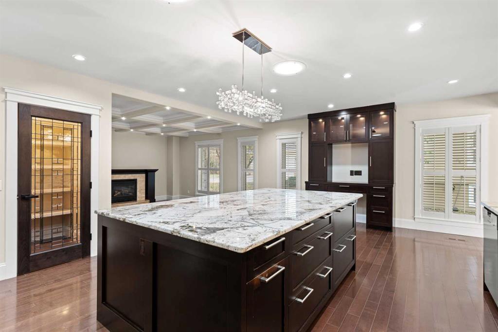 Welcome to 151 Pump Valley Court SW, a one-of-a-kind 3,500+ sq. ft. luxury bungalow offering over 6,500 sq. ft. of total living space on a 12,850 sq. ft. lot in the prestigious community of Pump Hill; steps from Glenmore Reservoir, Rockyview Hospital, and some of Calgary’s finest schools. Offering four bedrooms plus an office and five and a half bathrooms, this home blends elegance with modern comfort. From its grand 11-foot-wide travertine-tiled foyer and eight skylights to its soaring vaulted ceilings with beautifully framed openings, every detail exudes timeless sophistication. The main floor primary suite offers a tranquil retreat with French-door entry, patio access, dual custom walk-in closets, and a spa-inspired five-piece ensuite finished in imported Turkish travertine, granite countertops, crystal vessel sinks, Hansgrohe fixtures, heated floors, and a 5’x5’ glass shower. The main floor bedroom and office share a stylish Jack and Jill three-piece ensuite featuring a 4’x4’ glass shower with bench seating, while each lower-level bedroom enjoys its own private ensuite and walk-in closet. Throughout the main floor, you’ll find new high-pile carpet, solid-core shaker doors, designer mouldings, and European Innotech tilt-and-turn windows that blend craftsmanship with comfort. A dramatic 8’x12’ floor-to-ceiling faux-stone Napoleon fireplace anchors the formal living room, complemented by French doors to the back patio and eight skylights flooding the space with natural light. The coffered-ceiling dining room and adjoining breakfast nook flow seamlessly to the family room, providing an elegant setting for entertaining. The chef’s kitchen is a showpiece with a massive granite island illuminated by sun-tunnel skylights, premium Wolf and Sub-Zero appliances, a Bosch microwave, a Blanco Silgranit sink, and a walk-in pantry with a glass door. Completing the main floor is a designer powder room, a travertine-tiled laundry/mudroom, and an insulated triple-car garage. Outside, enjoy a partial wraparound deck, a fully updated exterior with new stucco, Hardie Board casings, a new roof with enhanced ventilation, a gas BBQ hookup, a Stobag electronic awning, and a professionally landscaped yard with underground sprinklers. The newly renovated lower level extends the home’s luxury with a travertine and granite bar featuring Bosch and Frigidaire appliances, a tiered theatre, mirrored gym with premium rubber flooring, two guest bedrooms with new four-piece ensuites and walk-in closets, and an additional five-piece spa bathroom with a programmable glass steam shower, Hansgrohe fixtures, and a soaking tub. Modern comfort continues with dual-zone heating, two new A/C units, Kinetico water filtration and softener systems, a new sump pump and central vacuum. Blending meticulous craftsmanship with an unbeatable location, this exceptional residence embodies sophistication, comfort, and timeless design; an unparalleled opportunity to own a distinctive home in sought-after Pump Hill.