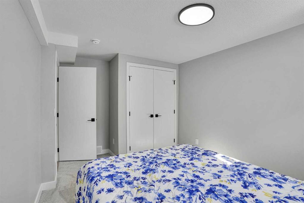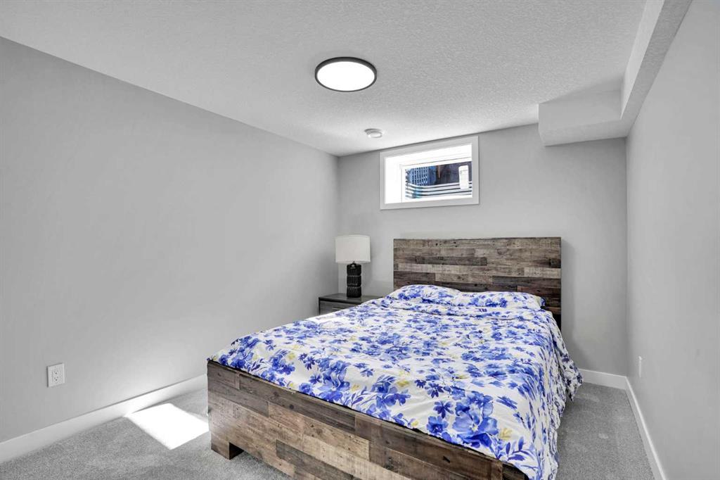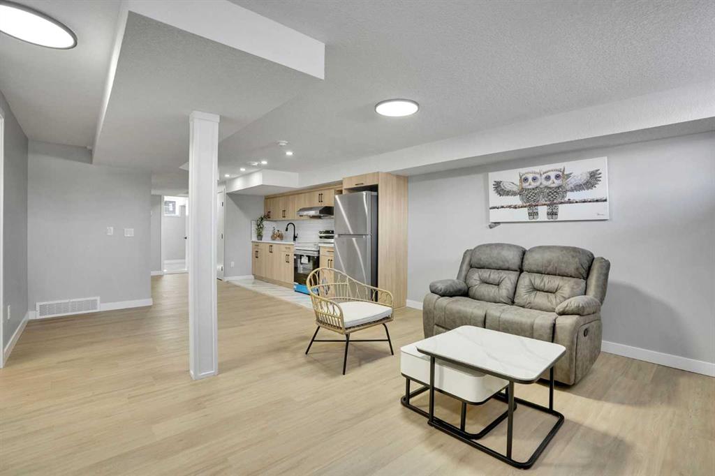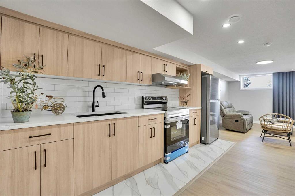 The fully finished basement legal suite features a separate entrance, two spacious bedrooms, a modern kitchen with stainless steel appliances, a 4-piece bathroom, and a large recreation/living area with large windows, offering excellent functionality and income potential.