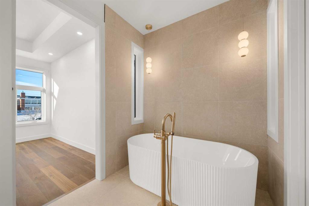 The entire top floor is dedicated to a private primary retreat. Enjoy an expansive bedroom complete with its own fireplace, creating a warm and sophisticated ambiance. The luxurious four-piece ensuite features double vanities and a soaker tub, complemented by a large walk-in closet and a private balcony. With no neighbours directly in front, you’ll appreciate both privacy and unobstructed views.