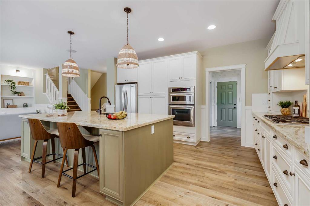 Presenting 153 Cranridge Terrace SE, a beautifully updated two-storey home offering 2,520.83 sq ft above grade and located across from a green space and park in the highly desirable community of Cranston. The attractive stucco exterior and inviting front entrance lead into a bright open-concept main floor featuring 9-foot ceilings, elegant wainscoting throughout, and durable luxury vinyl plank flooring. The heart of the home is the updated kitchen, showcasing a massive island with built-in appliances, abundant cabinetry, and plenty of prep space—perfect for both everyday living and entertaining. The spacious living room is anchored by a beautiful stone gas fireplace with a mantle, creating a warm and inviting focal point for relaxing evenings or gathering with family and friends. The dining and living areas flow seamlessly together, while a main floor home office offers a quiet and functional workspace. Upstairs you’ll find three generously sized bedrooms and two full bathrooms, including a spacious primary retreat featuring a practical 5-piece ensuite. A large bonus room with vaulted ceilings provides an ideal space for a family lounge, media room, or play area, and the convenience of an upstairs laundry room makes day-to-day living even easier. The fully finished basement expands the living space with an additional bedroom, full bathroom, den, and a large recreation room, offering excellent flexibility for guests, extended family, or additional entertainment space. Comfort is further enhanced with air conditioning and luxury vinyl plank flooring continuing into the basement. Outside, the private low maintenance backyard is designed for low-maintenance enjoyment and features a pergola, fire pit area, and hot tub—perfect for relaxing or hosting gatherings. The home also includes an oversized heated garage complete with durable epoxy flooring, providing plenty of space for vehicles, storage, or a workshop. Located near schools, shopping amenities, Stoney Trail, and the South Health Campus Hospital, this property also offers quick access to Cranston’s extensive walking paths and the scenic Bow River ridge. Combining generous living space, thoughtful upgrades, and a prime location in one of Calgary’s most sought-after family communities, this home is an exceptional opportunity.