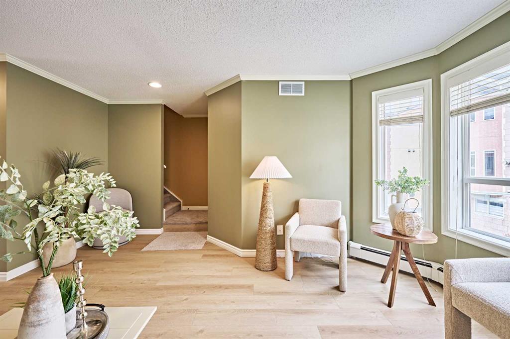 Experience the perfect blend of style and convenience in this stunning townhouse at The Terrace, ideally located in Calgary’s vibrant Beltline. With its dual primary bedroom layout, extensive upgrades, and a sun-drenched south balcony backing directly onto a park and playground, this home is a true urban retreat. // Main Level Charm: The spacious living room features a large bay window and a cozy free-standing gas fireplace. The open kitchen offers abundant counter space, sleek new countertops, and a generous breakfast nook—ideal for both everyday living and entertaining. //Private south-facing balcony: Step outside to oversized balcony with peaceful park views. This rare inner-city outdoor space is perfect for morning coffee, evening relaxation or chatting with friends. //Dual Master Retreats: Upstairs you’ll find two large bedrooms, each with its own ensuite bath—designed for comfort and privacy. A convenient laundry room completes the upper level. // Recent Upgrades & Peace of Mind: 1. Brand new premium STC-74 rated vinyl floors in the main floor 2. Plush new carpet throughout upstairs 3. Updated kitchen countertops & Moen bathroom faucets 4. Freshly painted walls & baseboards 5. Brand new hot water tank 6. Professionally upgraded boiler system (eliminates annual backflow inspection fee) // Unbeatable Location: With over 1,200 sqft of stylish living space, this home is steps from 17th Avenue’s shops, restaurants, and groceries, and just a short walk to downtown. One secure underground parking stall is included. // School Zone Advantage · Investment Potential:This property is located in the highly desirable Western Canada High School and Mount Royal School catchment area—and is within walking distance to both schools. Whether you are looking for a stylish home for your family or considering a smart investment in a top school district, this is an opportunity not to be missed. // Come to see this one-of-a-kind townhouse offering modern comfort, low-maintenance living, and an exceptional inner-city lifestyle.