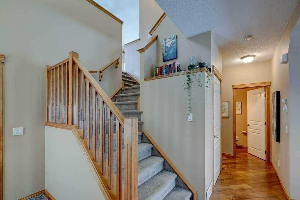 LOCATION, LOCATION, LOCATION! One giant step for mankind, and about 400 steps to the elementary school, field, and playground. Welcome to this spacious family home in the premier lake community of Lake Chaparral, offering over 2,300 sq.ft. of total developed living space, 4 bedrooms, and 2.5 baths. A bright, oversized vaulted foyer welcomes you in with plenty of space. The diagonal hardwood is a standout upgrade that adds warmth, character, and visual interest. The open main floor offers excellent flow for everyday living and entertaining. The kitchen features maple cabinetry, a corner pantry, ample prep space, and a central island with breakfast bar, with large windows overlooking the backyard. A cozy corner gas fireplace anchors the living room, while main floor laundry, mudroom, and a powder room complete this level. Upstairs, enjoy a massive bonus room set apart from the bedrooms, plus 3 bedrooms and the main bath, highlighted by a spacious primary bedroom with walk-in closet and ensuite featuring a deep soaker tub and separate shower. The fully developed basement adds a large recreation space, an oversized fourth bedroom, a bathroom rough-in for future completion, and excellent storage. Quiet street, not on a main road, with easy access in and out of the community, and walking distance to schools, the lake, transit, and shopping. Enjoy Lake Chaparral’s year-round lifestyle with beach, pathways, playgrounds, courts, clubhouse events, and more, plus Fish Creek Park, Wolf Willow Dog Park, and Blue Devil Golf Course nearby. A solid home with a smart layout, ready for your personal style. They don’t build them like this anymore: real space, inside and out.