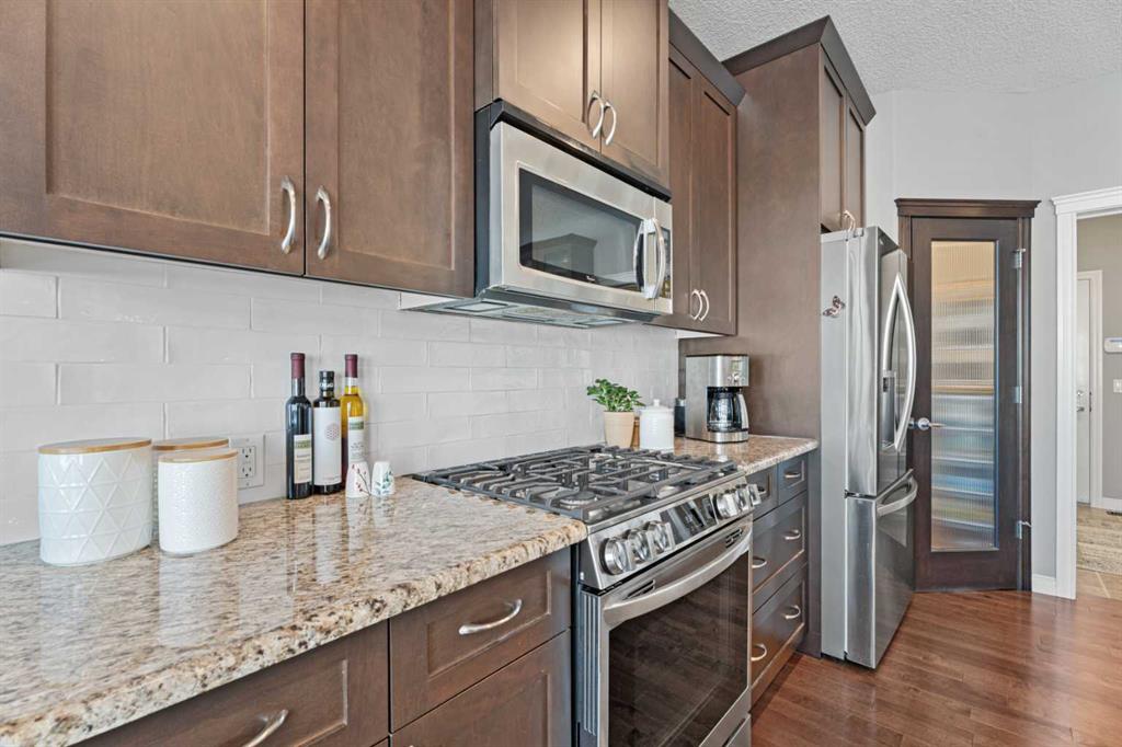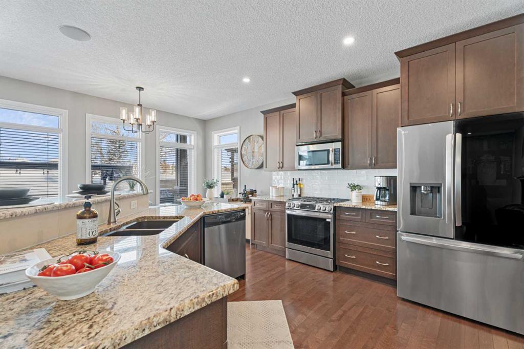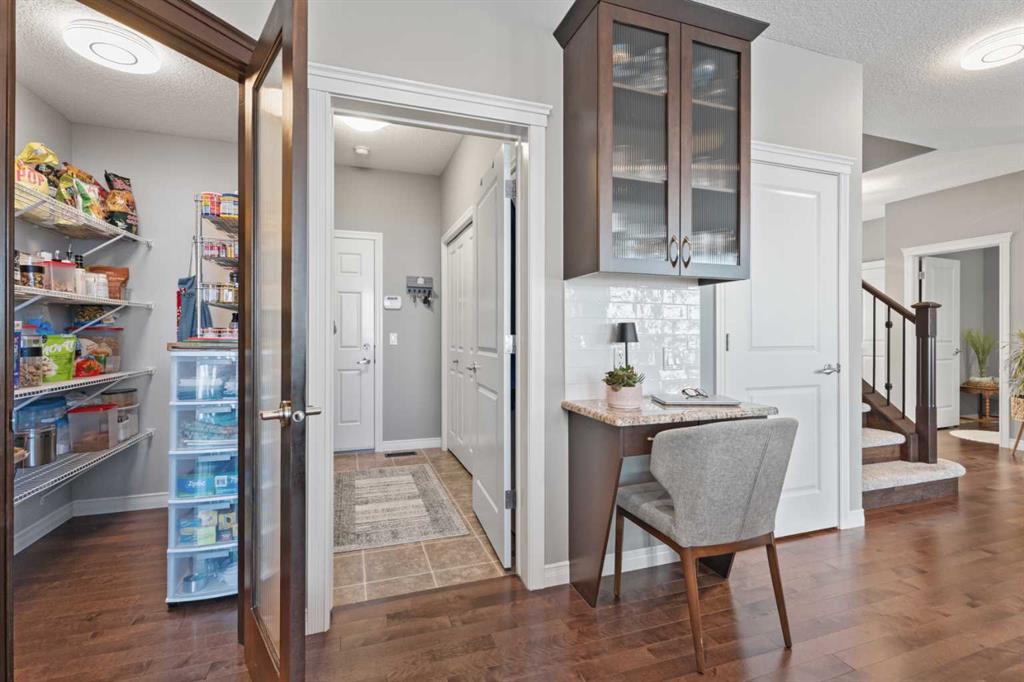 The landscaping has been beautifully redone, while inside you’ll find new flooring throughout the upper level and stairs, updated lighting and the added comfort of central air conditioning. The heated and insulated double car garage is another feature—perfect for Alberta winters, whether you’re parking, storing, or working on projects year-round.