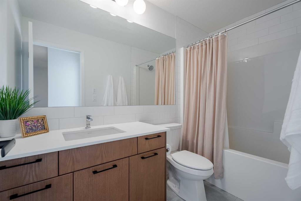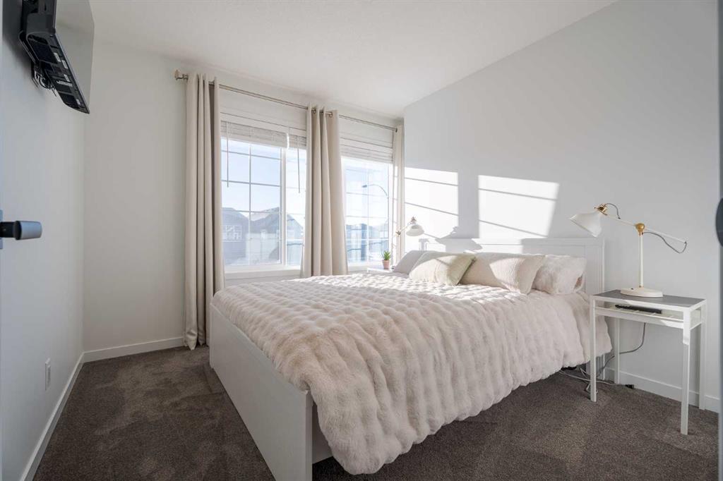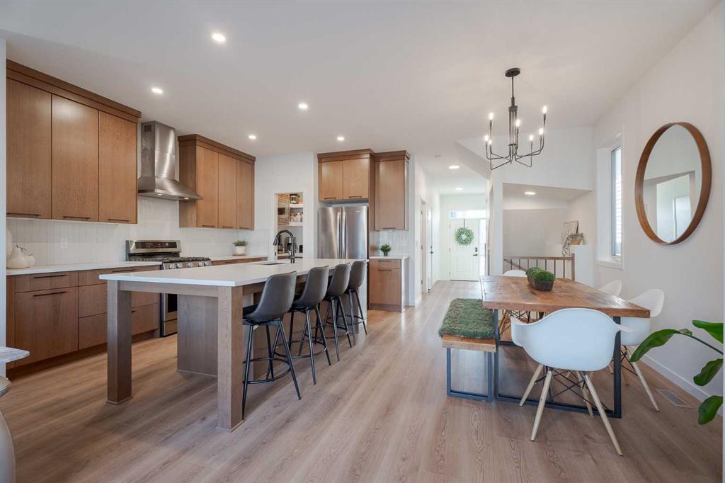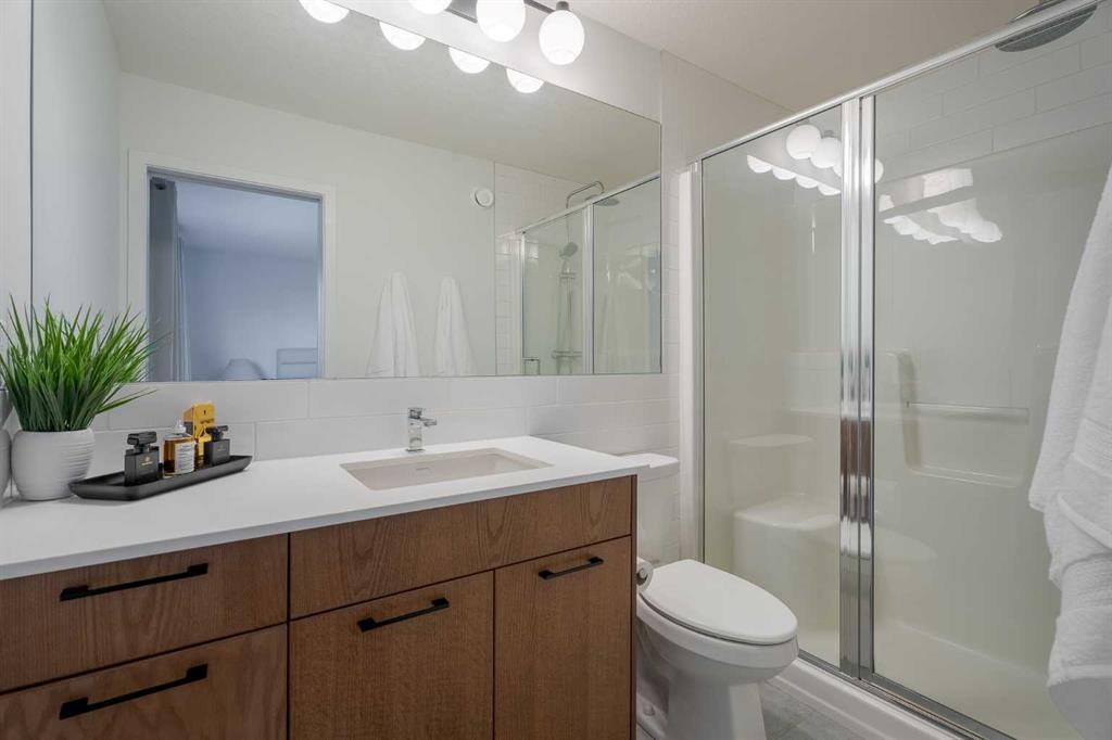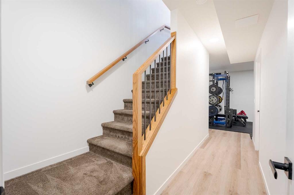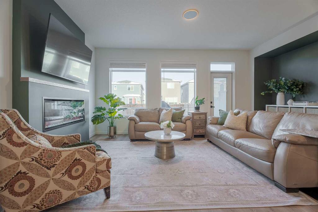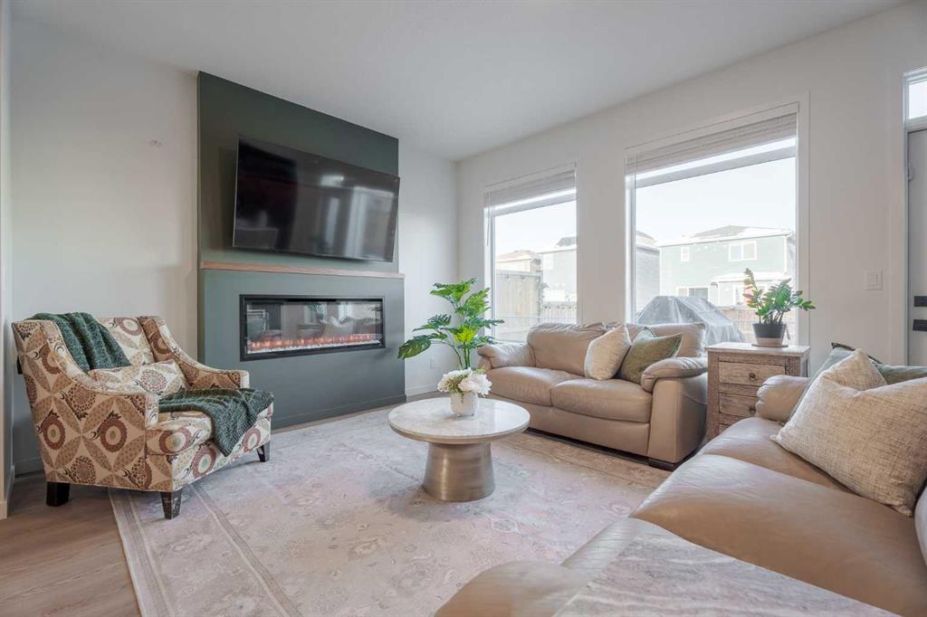Welcome to an extraordinary residence in the prestigious southwest community of Belmont, where refined design and modern luxury converge. This newer, custom-built home is a masterclass in sophisticated living, thoughtfully curated with impeccable upgrades and meticulous attention to detail throughout, offering a truly elevated lifestyle. Upon entry, you are welcomed by an elegant, on-trend palette that beautifully complements the home’s timeless, earthy aesthetic. The stunning great room is anchored by upgraded wide-plank flooring and a striking 50-inch linear electric fireplace, complete with a bespoke oak mantel—an inviting focal point for intimate evenings and refined entertaining alike. The kitchen is nothing short of exceptional, designed to inspire both form and function. Highlights include a generous walk-in pantry with additional counter space, a show-stopping oversized island adorned with upgraded quartz countertops, and a custom designer backsplash. Floor-to-ceiling oak cabinetry, enhanced with additional drawers and storage, pairs seamlessly with premium appliances, including a gas range and counter-depth refrigerator, showcasing craftsmanship of enduring beauty. The main level is completed by a discreet and stylish powder room, ideal for guests. Upstairs, the private primary retreat is bathed in natural light and features a spacious walk-in closet and a spa-inspired ensuite with an oversized shower. Two additional well-appointed bedrooms share a beautifully designed family bathroom, offering comfort and elegance for family members or guests. The upper-level laundry room elevates everyday living with full-length hanging space and solid shelving, transforming routine tasks into a refined experience. The professionally designed lower level extends the home’s versatility, featuring a spacious family room—currently staged as a private gym—along with a four-piece bathroom and a fourth bedroom, perfect for guests or extended family. Thoughtfully upgraded lighting throughout the home creates a warm, inviting ambiance, enhancing every space. Outside, the fully landscaped yard adds exceptional curb appeal and provides a welcoming outdoor setting ideal for entertaining and relaxation. Set within the sought-after Belmont community, this home offers an unparalleled lifestyle defined by contemporary design, functional elegance, and a strong sense of community. Residents enjoy scenic pathways, playgrounds, a forthcoming outdoor shopping centre, future recreation facilities, a library, and convenient access to major roadways including Macleod Trail and Stoney Trail—ensuring effortless travel to downtown Calgary and the Rocky Mountains. This is a rare opportunity to claim a truly luxurious haven in one of Calgary’s most exciting new communities.