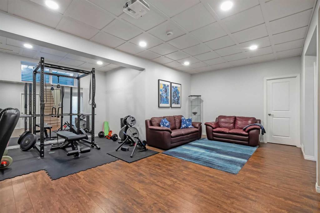 The Second Floor is reached by the breathtaking custom hardwood and marble staircase (2025). This level offers year-round comfort with dedicated air conditioning installed (2023) due to its sunny exposure. The Primary Bedroom is the size of some apartments, a spacious sanctuary featuring a large walk-in closet and a luxurious 5-piece ensuite. The ensuite boasts dual his and hers sinks, a deep soaker tub, a separate shower with a private water closet, and a stunning custom barn door (2023) entry. The secondary bedrooms are also abnormally large for the home’s vintage, providing excellent space and storage. A new set of laundry cabinets was added in 2025 to your main level laundry with two doors to stay hidden. The double garage is oversized 21’3″ x 23’7″ has a workbench and lots of room for cars and storage fitting a SUV and car now. Finished Basement maximizes the home’s leisure potential, offering an ideal entertainment zone with a built-in projector setup for movie nights. This lower level includes a lovely full bathroom, a spacious guest/teen bedroom with a massive walk-in closet or storage area. Dedicated built in storage space in the utility room, ensuring the main areas remain clutter-free. Outdoors had a comprehensive exterior renewal: NEW siding, roof, gutters, and eavestrough were installed in November 2024, along with new back exterior lights (2025). Additional exterior appeal includes a freshly painted deck, fence, front door, and garage door (Aug 2025), a beautifully landscaped yard featuring mature Aspen trees and a variety of perennials (2022). Car lovers will enjoy an oversized driveway, and an oversized garage with custom cabinetry (2023). This meticulously upgraded home is a must-see for the discerning buyer seeking luxury, space, and a fantastic location with all major improvements completed.