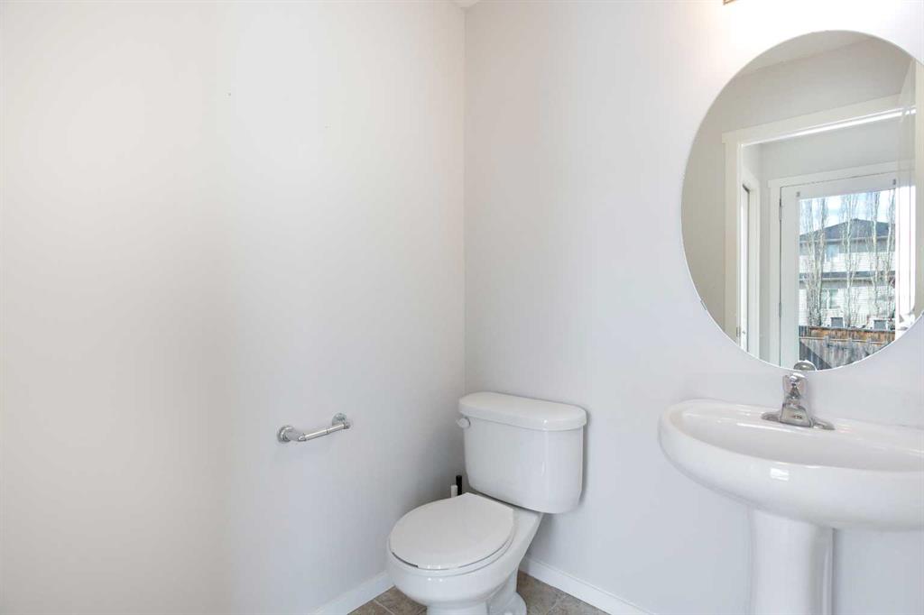 The main floor is designed for everyday living and effortless entertaining, featuring a spacious living room with a large front window, a generous dining area, and a well-appointed kitchen complete with stainless steel appliances, a raised breakfast bar island, and ample rich cabinetry. A convenient powder room completes the main level.