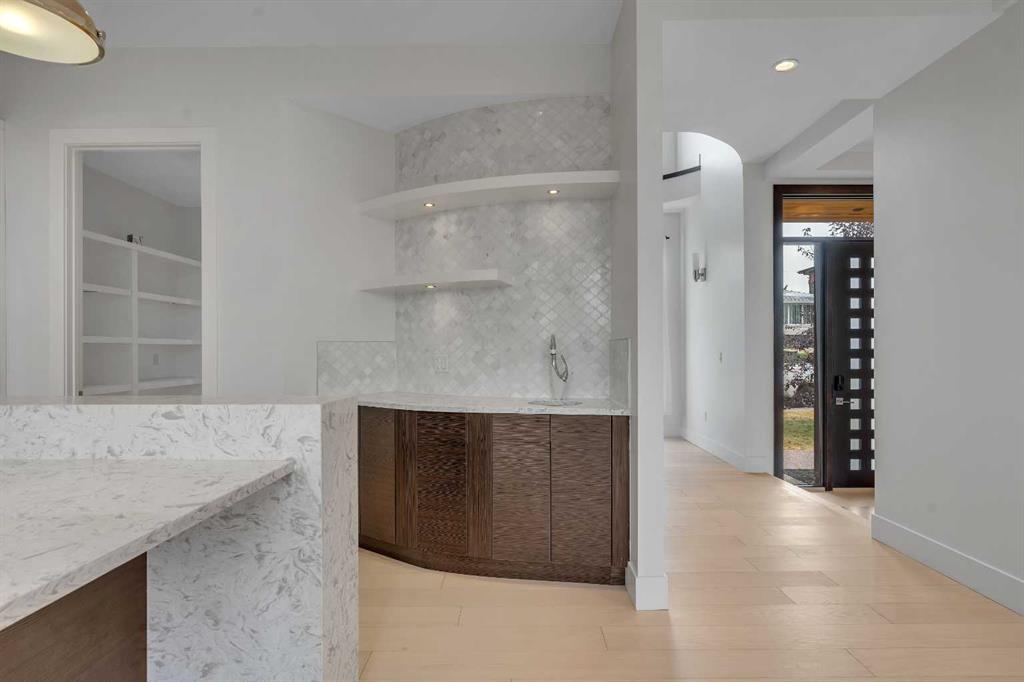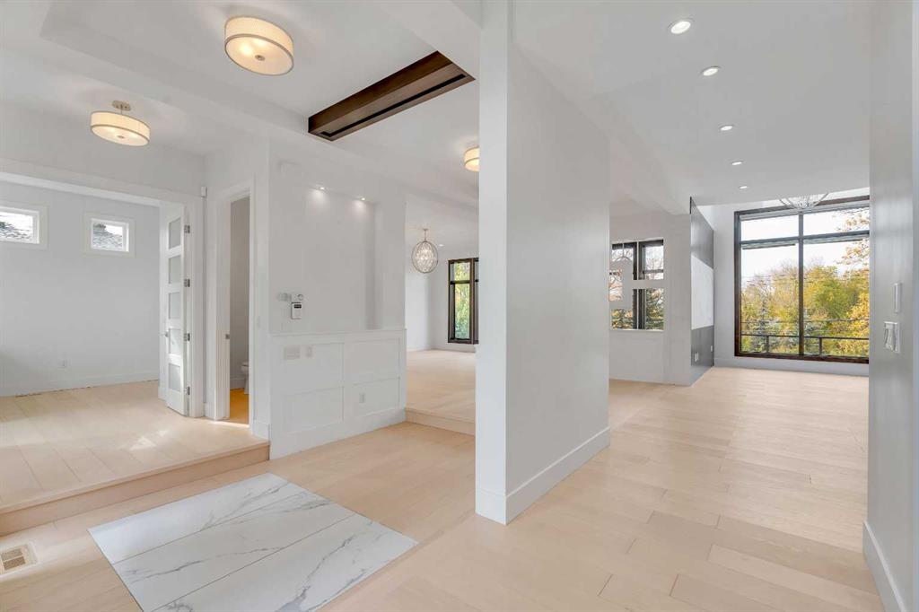 Recently renovated to achieve the perfect harmony of sophistication, light & function, this luxurious inner-city residence offers over 4,800 sq. ft. of refined living space backing west amid treetop outlooks & glowing sunset skies. A dramatic entry sets the tone with wide plank hardwood & a marble inlay, leading to soaring ceilings framed by custom millwork, exposed beams & black-clad windows that capture every nuance of daylight. French doors open to a private office detailed with built-ins, creating an ideal work-from-home sanctuary. The heart of the home is an exquisite designer kitchen that balances modern minimalism with warmth, showcasing pristine white cabinetry contrasted by rich wood accents, a waterfall-edge granite island & professional-grade Wolf appliances including a 6-burner gas range, steam oven & built-in espresso system. A curved wet bar & walk-through butler’s pantry enhance the home’s entertaining flow. Beyond, the dining room’s double-height ceiling, sculptural chandelier & wall of glass doors invite connection between indoors & out, while an automated awning provides shade over the upper deck for sunset dinners. The adjoining living room blends quiet luxury with comfort around a sleek linear fireplace wrapped in full-height marble, its ambiance carried by soft recessed lighting & serene west views. Ascend the glamourous curved staircase illuminated by a cascading crystal chandelier to the upper level. French doors lead to a sumptuous primary retreat where a private balcony, spa-inspired ensuite with steam shower & soaker tub, and a custom dressing room create a boutique-hotel experience. 2 additional bedrooms, each with its own ensuite, complete this level. The fully finished walkout lower level continues the home’s refined aesthetic, offering a seamless blend of comfort & sophistication. Heated epoxy floors provide quiet warmth underfoot, while a sleek wet bar invites easy entertaining & relaxed evenings with friends. The spacious recreation area is ideal for movie nights or game-day gatherings, complemented by a well-appointed fourth bedroom & a stylish full bath for guests. A versatile den adds flexibility for a gym, yoga studio or private theatre, & dual stairwells connect this level effortlessly to the rest of the home for exceptional flow. Outside, the fenced west yard offers ample green space for relaxation or play, with a detached double garage featuring its own electrical panel, drive-through door & additional RV parking. Thoughtful upgrades include remote blinds, smart thermostats, tankless water heating, central air conditioning, in-floor boiler heat, sump pump & central vacuum. Perfectly positioned within Hounsfield Heights/Briar Hill, this exceptional property offers unmatched access to parks, top schools, SAIT, Kensington, the Bow River pathway system, North Hill Centre, hospitals, downtown & the mountains beyond—all wrapped in elevated design & timeless luxury!