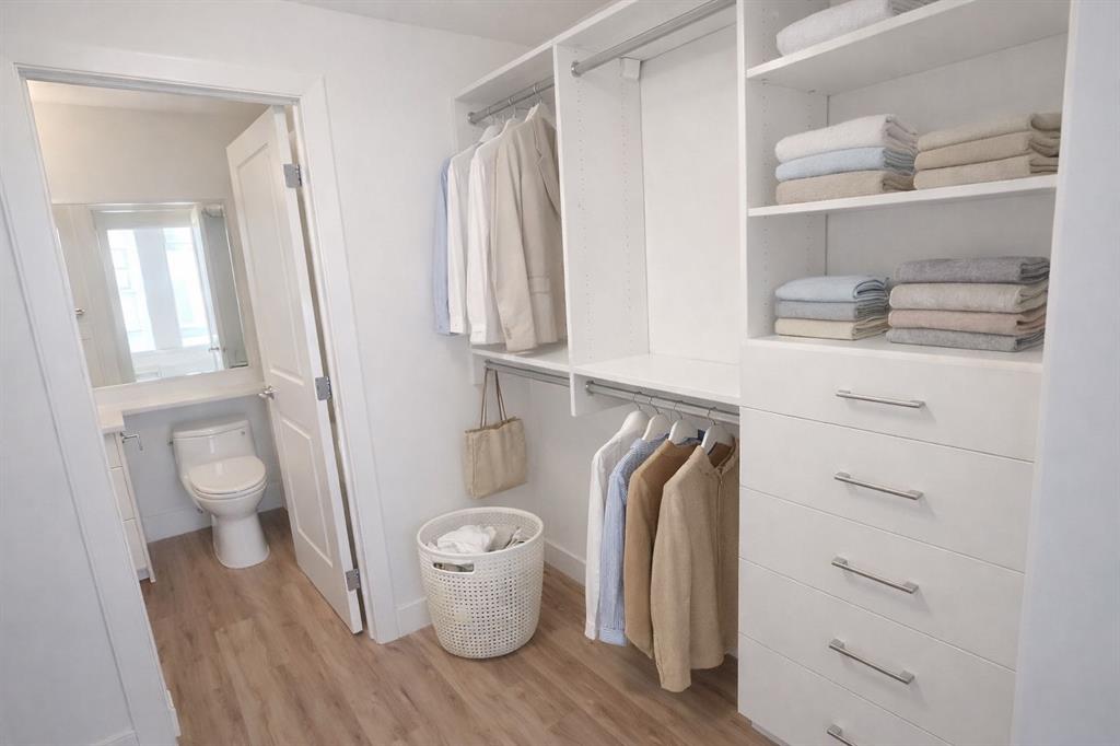 The spacious primary bedroom offers a relaxing retreat with a walk-through closet customized by California Closets and a private, spa-inspired ensuite complete with a deep soaker tub. A second well-sized bedroom and a full bathroom with a walk-in shower provide flexibility for guests, family, or a home office. The convenience of in-suite laundry adds to the ease of everyday living.