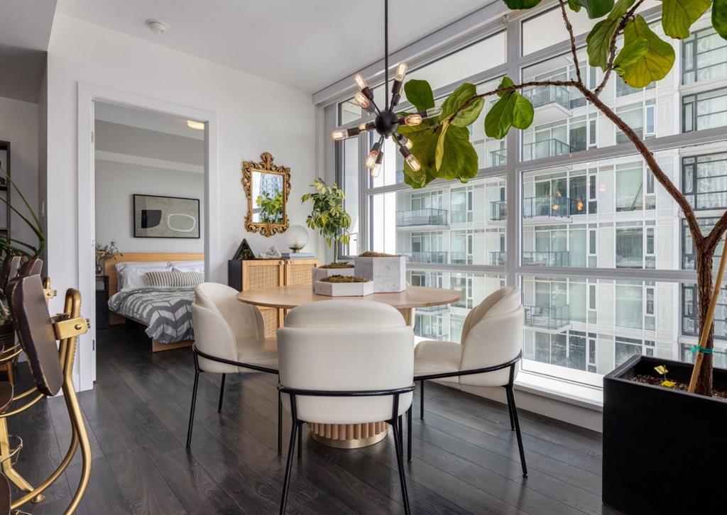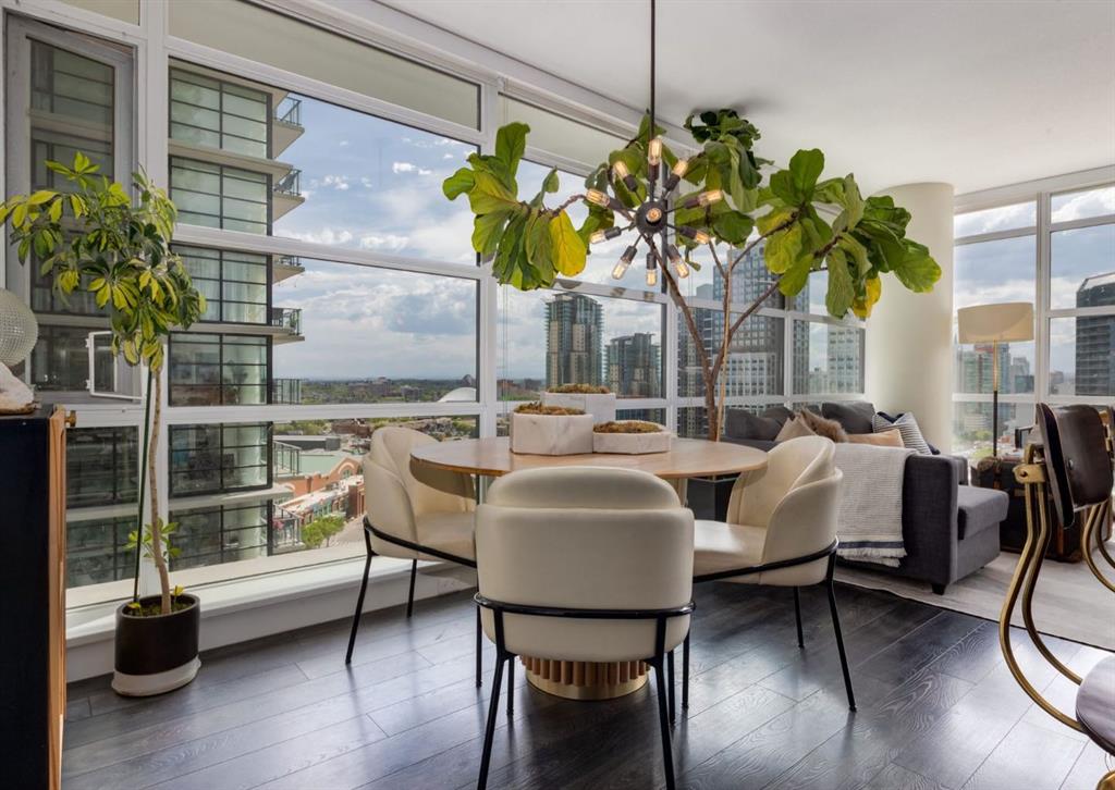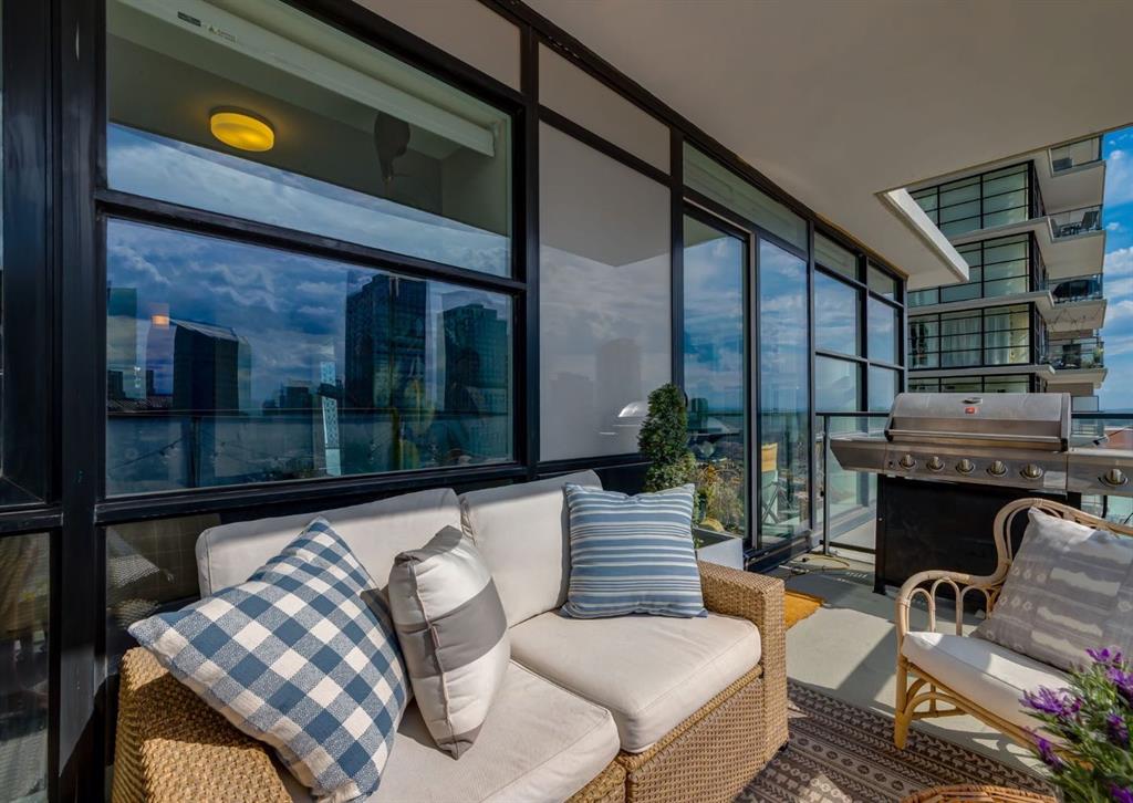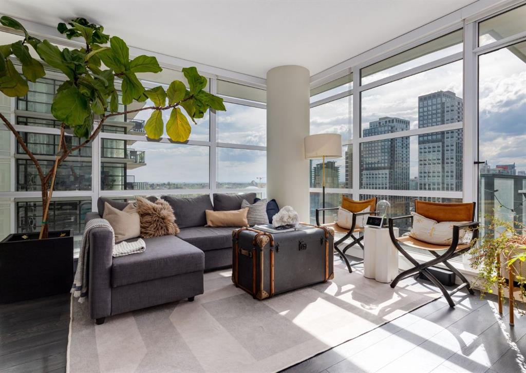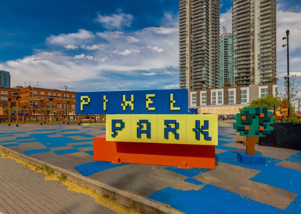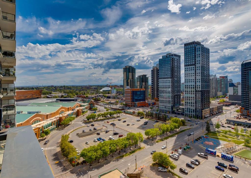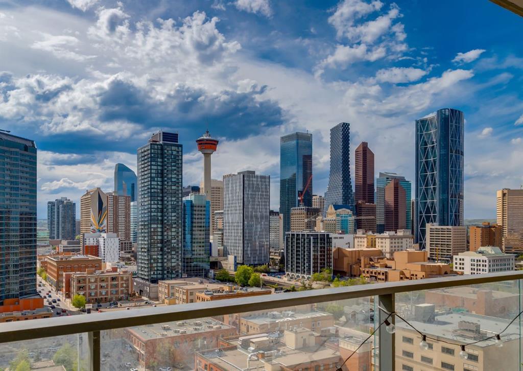 CITY & MOUNTAIN VIEWS from this stunning southwest corner unit! This bright and welcoming open-concept home is filled with natural light and offers 2 bedrooms, 2 full bathrooms, tandem titled parking for two vehicles, and a large balcony with breathtaking views you’ll enjoy every day. The modern kitchen features sleek cabinetry, stainless steel appliances including panelled refrigeration, quartz countertops, and plenty of storage. The primary bedroom easily fits a king-size bed and includes a walk-through closet with custom built-ins leading to a contemporary ensuite. The second bedroom is conveniently located next to a full 3-piece bathroom—perfect for guests, roommates, or a home office. Enjoy the perks of this executive concrete building, which offers concierge service, a fitness centre, party room, rooftop terrace, workshop, air conditioning, high-speed elevators, visitor parking, and a separate assigned storage locker. Impeccably maintained by its original owners, this move-in-ready home is also pet friendly (with board approval) and ideally located—just steps from Pixel Park, river pathways, the LRT, Stampede Grounds, Central Library, restaurants, cafes, shops, and groceries. Floor plans and a 3D tour are readily available, providing a glimpse into this stylish condo!