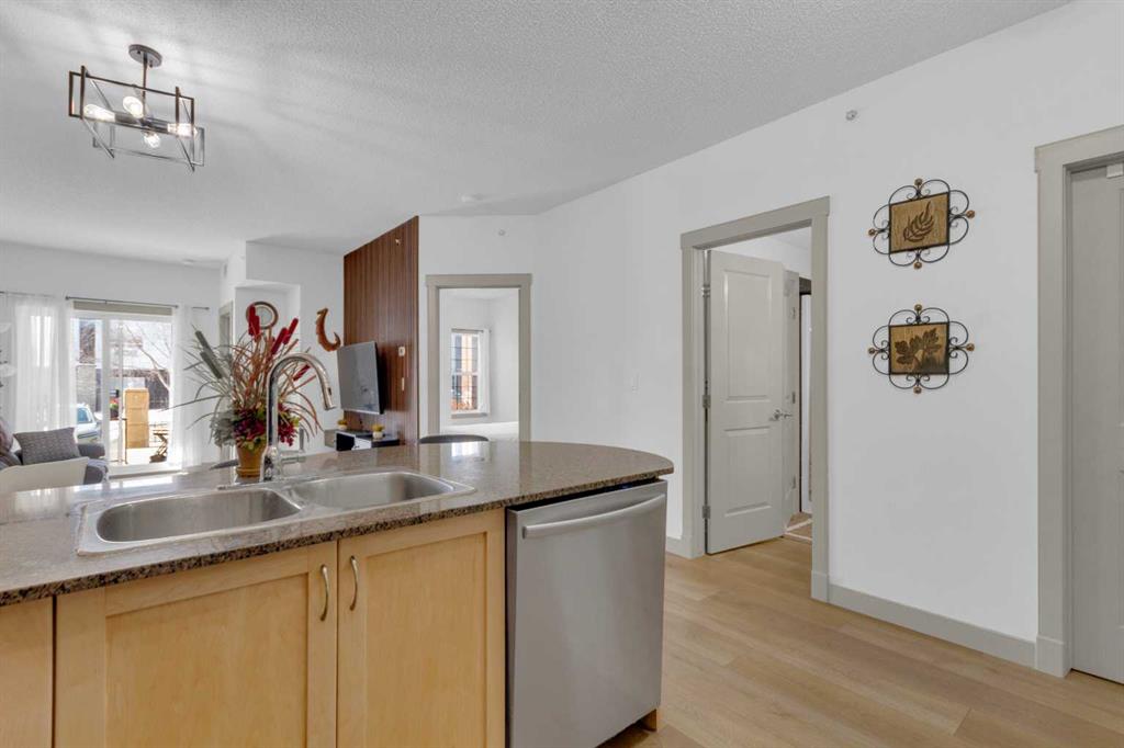 2 BEDROOM | 1 BATHROOM | 2 TITLED UNDERGROUND PARKING STALLS | CONCRETE BUILDING | SOUTH-FACING MAIN FLOOR UNIT Welcome to this beautifully maintained, currently owner-occupied 2-bedroom main floor unit in the highly desirable Gateway South Centre, awarded as the Southern Alberta’s top condo community in 2025. This home offers an exceptional blend of comfort, style, and convenience, making it ideal for first-time buyers, downsizers, or investors. Enjoy the benefits of a south-facing exposure, filling the home with natural light and creating a bright, airy atmosphere throughout the day. Freshly painted in elegant White Dove, the space feels clean, modern, and inviting. Newly installed light-toned vinyl flooring adds a warm, wood-inspired look while offering durability and easy maintenance. Upgraded light fixtures and pride of ownership are evident throughout. The kitchen is both functional and stylish, featuring recently restored cabinetry with ample storage, along with newer appliances including a dishwasher, stove, and microwave, all replaced within the last two years. The welcoming living area is enhanced by a wood-accent TV feature wall with a sleek floating stand, creating a cozy yet contemporary space to relax or entertain. The spacious primary bedroom offers excellent comfort, while the second bedroom is ideal for guests, a home office, or a small family. In-suite laundry adds everyday convenience. Step outside to your private ground-floor patio with direct access, perfect for those seeking stair-free living. The patio also includes a natural gas hookup, ideal for BBQs and outdoor enjoyment. This unit includes two titled heated underground parking stalls, one featuring additional storage amenities. There is also great income potential, one stall is currently rented for over $100/month, with the option to continue through a handshake agreement. Ample visitor parking is available. Located in an unbeatable area, you’re within walking distance to shopping, public transit, Avenida Village, Avenida Medical Centre, and many other essential services, along with easy access to South Centre Mall and major roadways. This pet-friendly, noise proof-concrete building is well-managed and financially sound, with strong reserve funds, offering long-term peace of mind. Residents enjoy geothermal heating and cooling (including A/C) and access to excellent amenities, including a fitness centre, yoga studio, two recreation rooms, and guest suites. Condo fees include heat, water, electricity, and more, delivering outstanding value. A fantastic opportunity to own a bright, stylish, and low-maintenance home in a prime location.