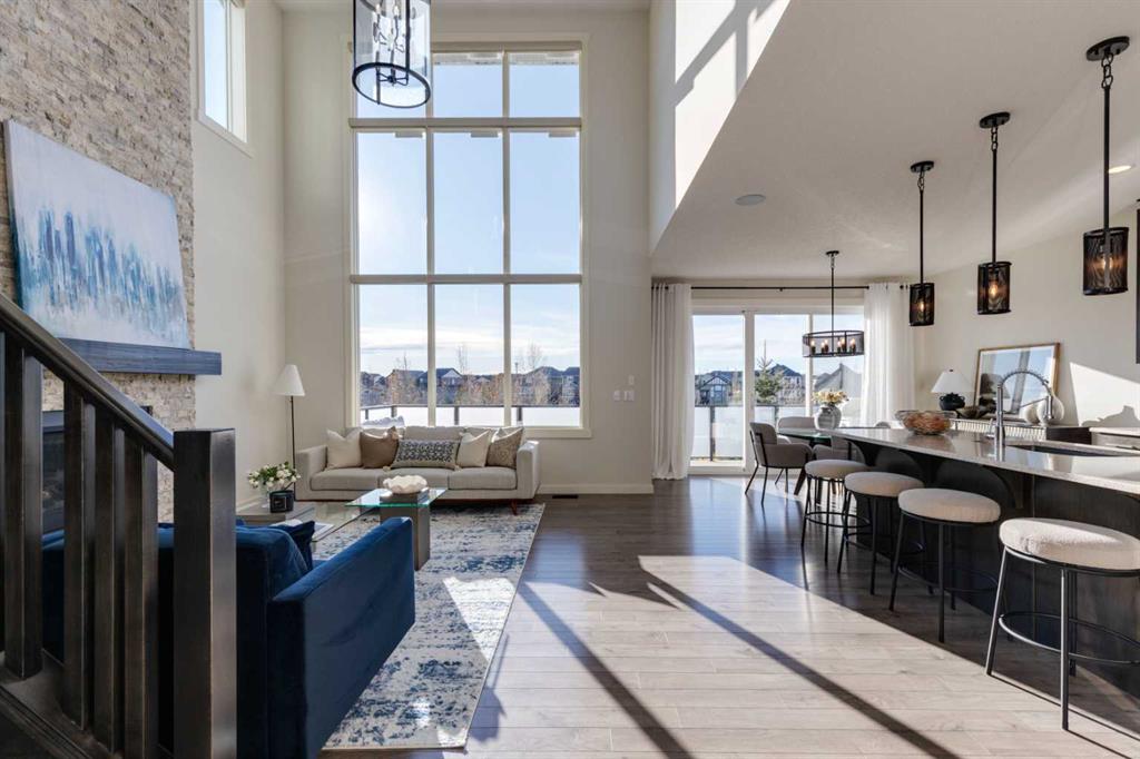 Welcome to 161 Kingsmere Cove SE, where thoughtful design meets refined living. Nestled in a quiet cul-de-sac, on an pie shaped lot just shy of 9,000 sq. ft., this pristine walkout home backs onto a tranquil pond and walking path. Offering picturesque views, privacy and a safe family-friendly connection to nature; this home captivates as you enter. Inside, a soaring 22’ ceiling frames the striking stone surround gas fireplace, filling the open concept layout with warmth and natural light through the expansive windows. The chef-inspired kitchen features granite countertops, soft-close cabinetry, a walk-through pantry, and a large island overlooking the dining area; perfect for cooking, conversation, and connection. The thoughtful layout lets you flow from inside to the balcony, which is complete with two gas lines. Here you can unwind with southwest-facing sunset views over the water. Upstairs, you’ll find three generous bedrooms including the primary, a bright bonus room and laundry. The primary oasis offers vaulted ceilings, a spa-like 5-pc ensuite with heated floors, soaker tub, six jet shower, dual sinks, and walk-in closet. The upper laundry adds convenience with its sink, shelving, and countertop workspace. The finished walkout basement expands living to 3,168 sq. ft., ideal for a 4th bedroom, gym, or office space, and includes a 3-pc bath featuring heated floors and a large recreational room for board games or watching your favourite sports team! Outside, you’ll love the covered patio, a show stopper for entertaining and lounging alike! This outdoor sanctuary is fully equipped with sprinklers, privacy walls, a gas line, hot tub rough-in that opens to a fully fenced yard including a dog run, a custom shed to match the home, a fully manicured lawn with mature trees, and your own private gate to the pathway for evening strolls in the fall. You can also enjoy skating with your family and neighbours on the pond in winter! This home has received over $160,000 in upgrades since 2019; including new roof, shelving & organizers in the heated triple garage with space for a lift, furnace, A/C, powered shades with solar charging, smart security, composite siding, 6-zone built-in speakers & so much more. No detail was missed in this stunning masterpiece. It blends sophistication, comfort, and lifestyle in perfect harmony! All of this comes with easy access to great schools, parks, playgrounds, shopping & the new HWY 2 intersection at 40th Avenue.