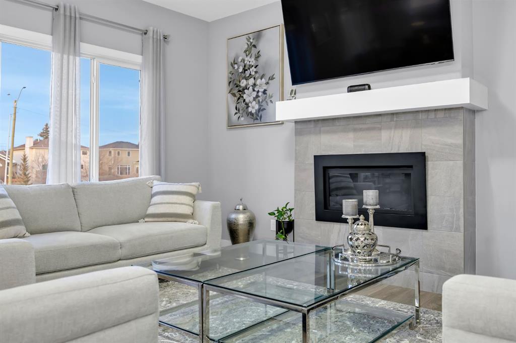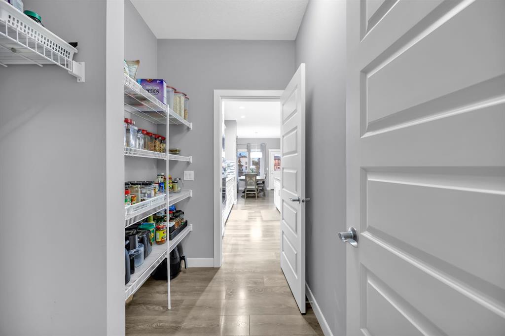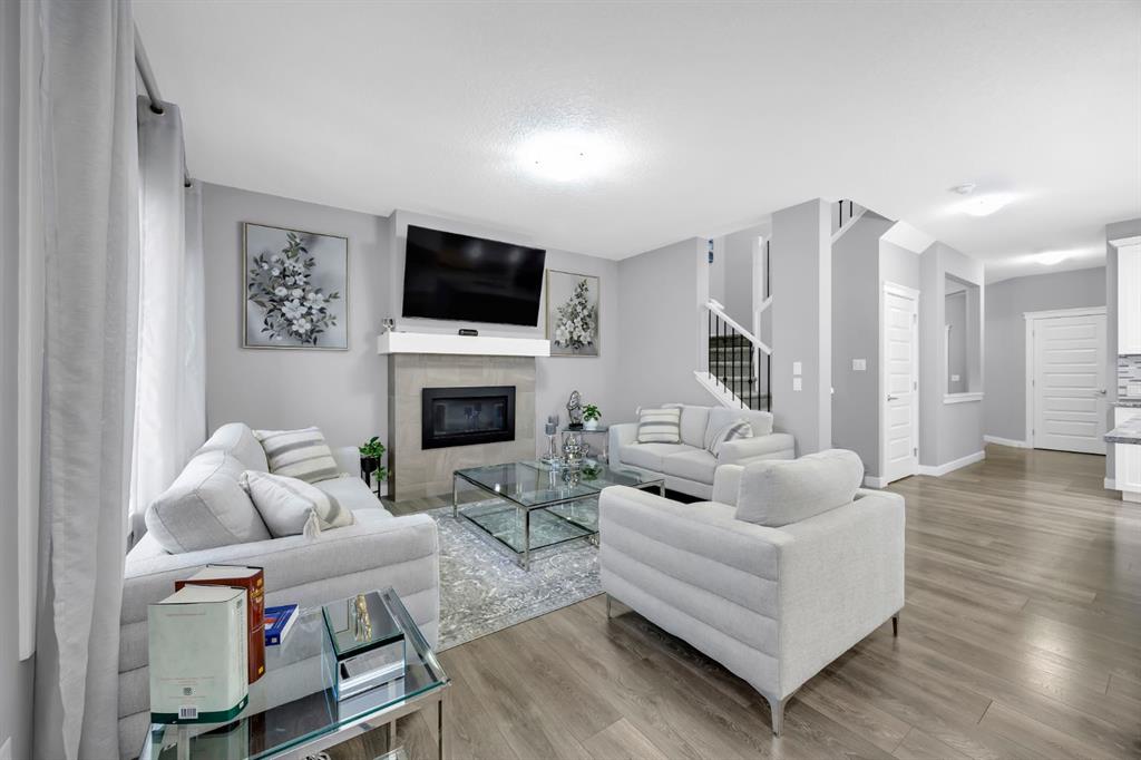 The main floor is both functional and stylish, showcasing durable vinyl plank flooring throughout. A versatile front office/den provides the ideal space for a home office, library, or study. The open-concept design flows seamlessly into the heart of the home — the chef’s kitchen, complete with stainless steel appliances, quartz countertops, a gas cooktop, built-in oven and microwave, and a large central island perfect for entertaining. A convenient walkthrough pantry connects directly to the kitchen, and a 2-piece bathroom completes the main level. The inviting living room is anchored by a cozy gas fireplace, creating the perfect gathering space.