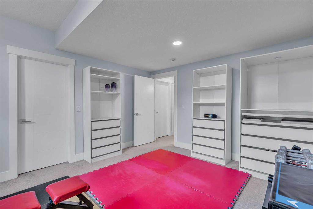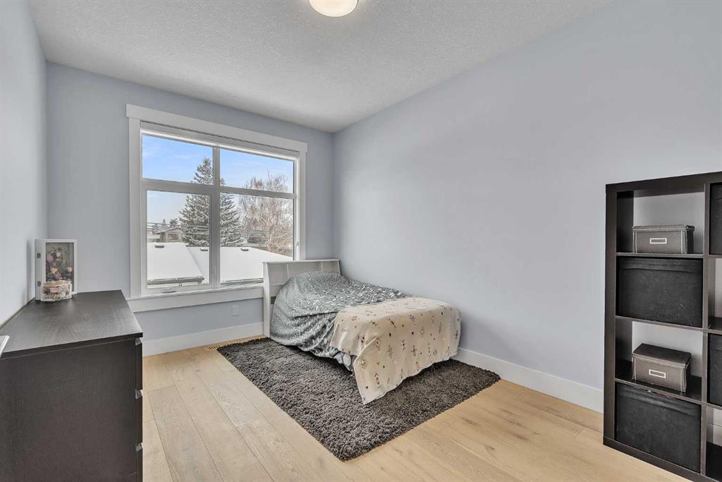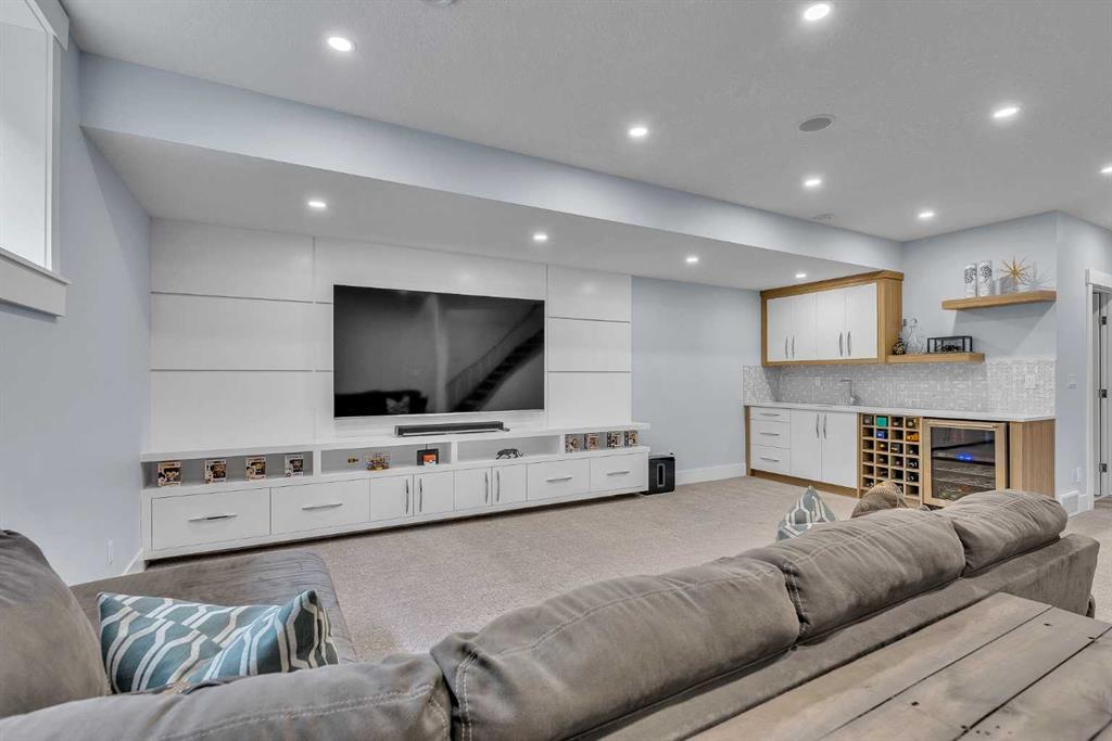 The fully developed basement is ideal for entertaining, featuring a large media room with custom built-ins, a wet bar, a fourth bedroom, and a full bathroom, along with hydronic heated floors.