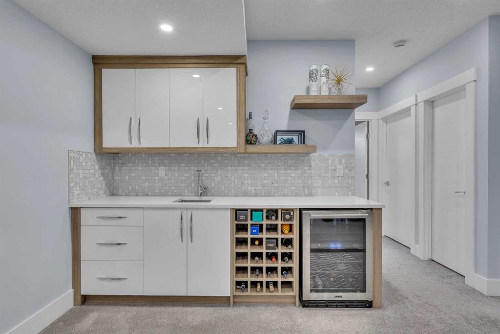The upper level offers 9’ ceilings throughout, anchored by a luxurious primary retreat with vaulted ceilings, a beautifully appointed ensuite featuring heated floors, and a walk-in closet. Two generously sized secondary bedrooms, a full bathroom, and an upper laundry room with ample cabinetry, counter space, and a utility sink complete this level.