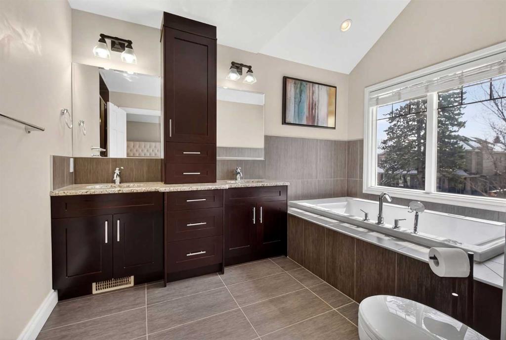 The sunken backyard offers added privacy and is beautifully landscaped with patio pavers, a natural gas fire pit, and a hot tub, creating an ideal outdoor space.