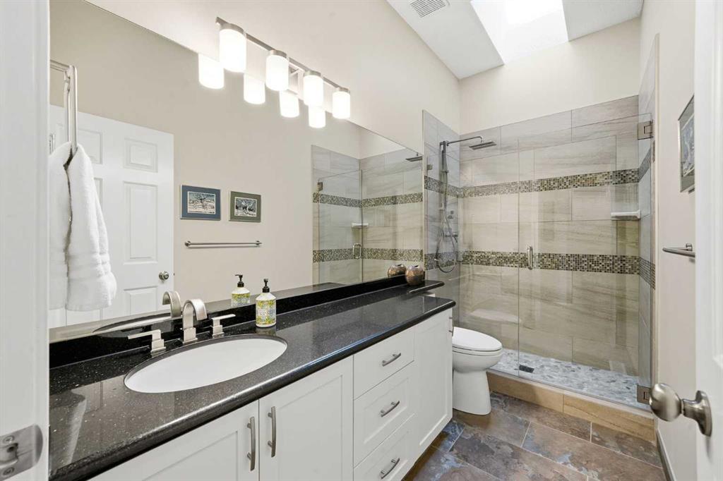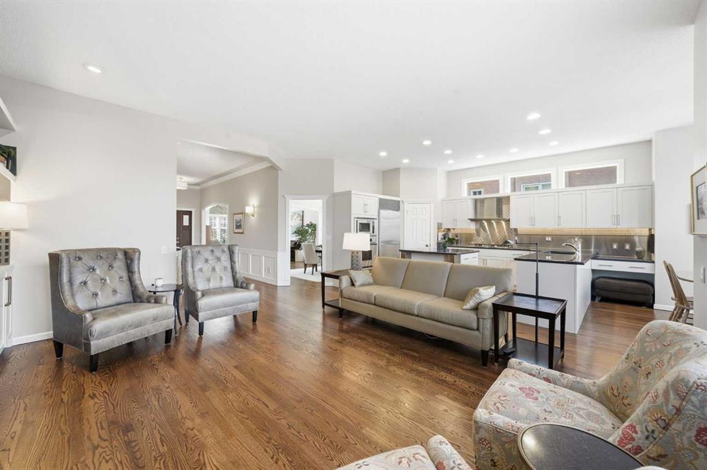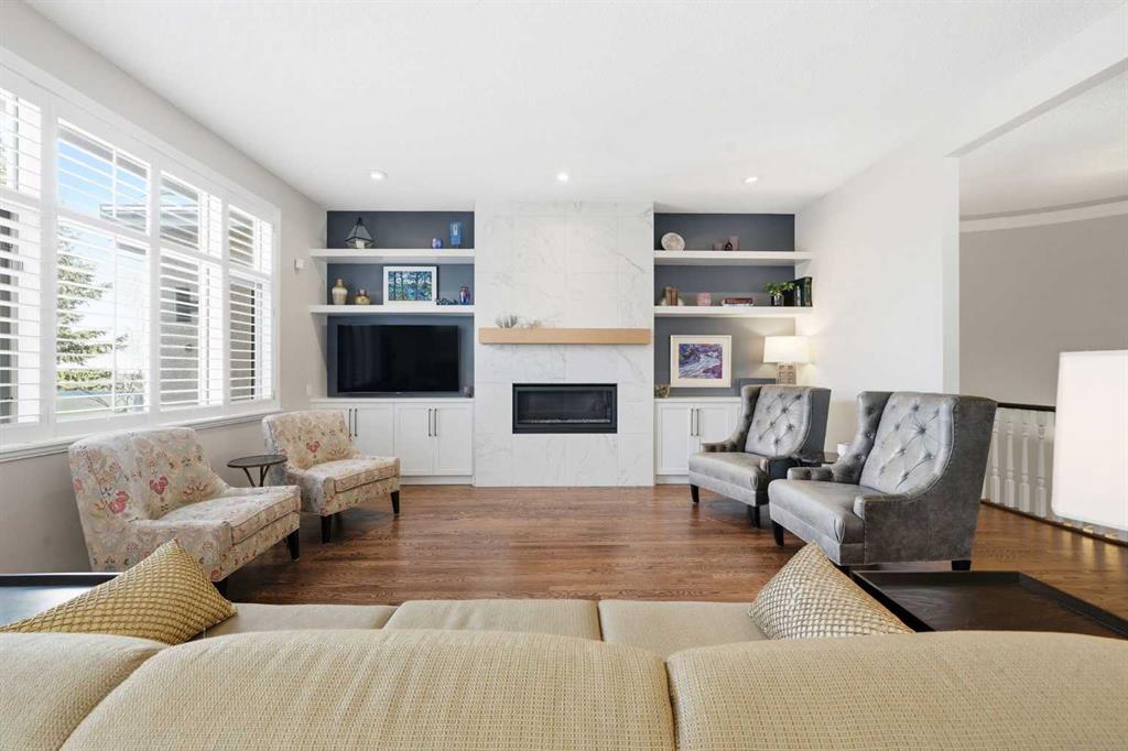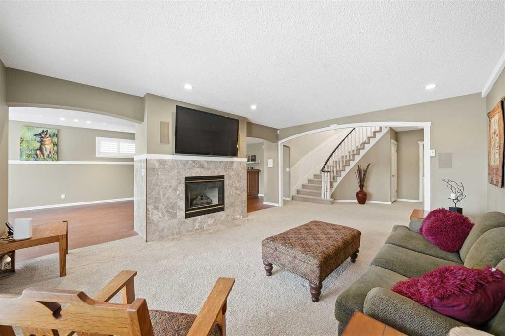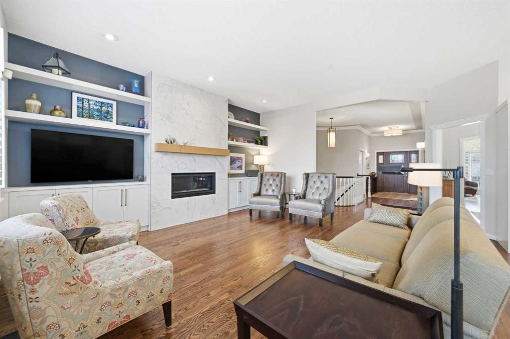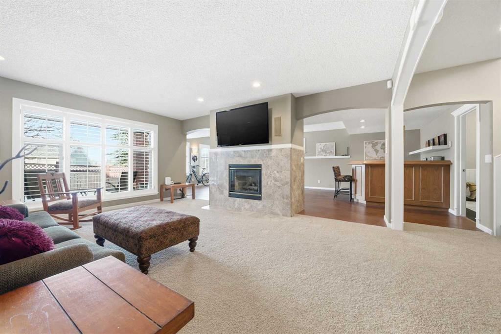 The main floor features 2 bedrooms, including a large primary suite with a 5-piece ensuite and walk-in closet. The kitchen opens to the family room with a gas fireplace and access to the back patio and yard. There is also a separate dining room and living room.