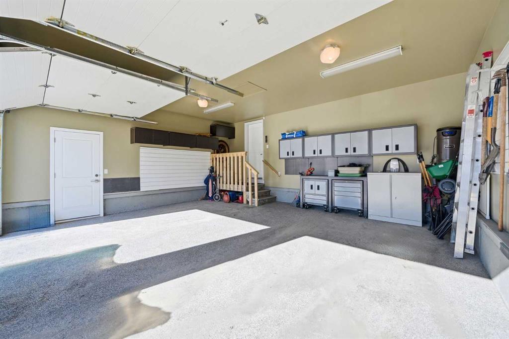 The fully finished garage includes epoxy flooring, slat wall storage systems, and two side wall-mounted LiftMaster garage door openers.