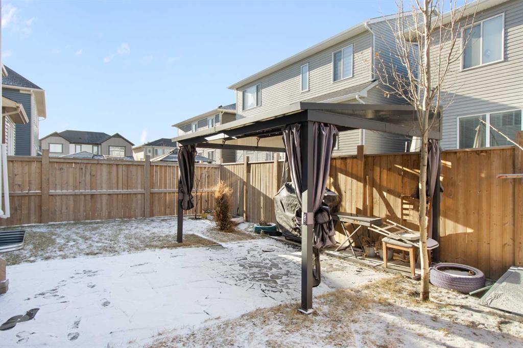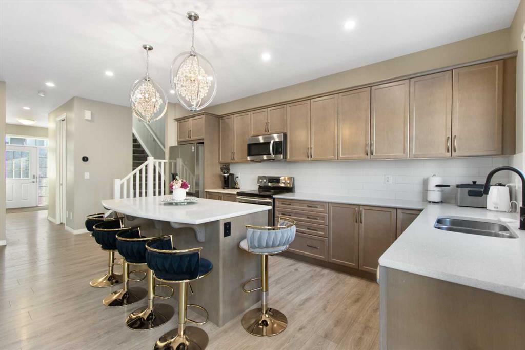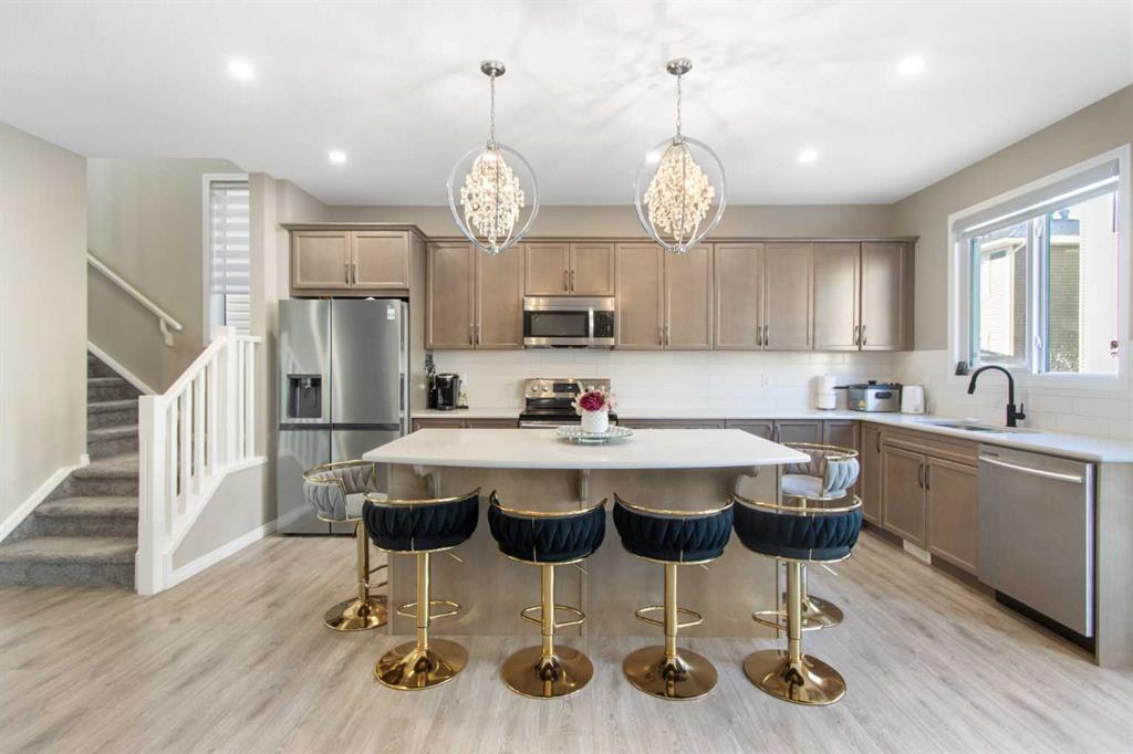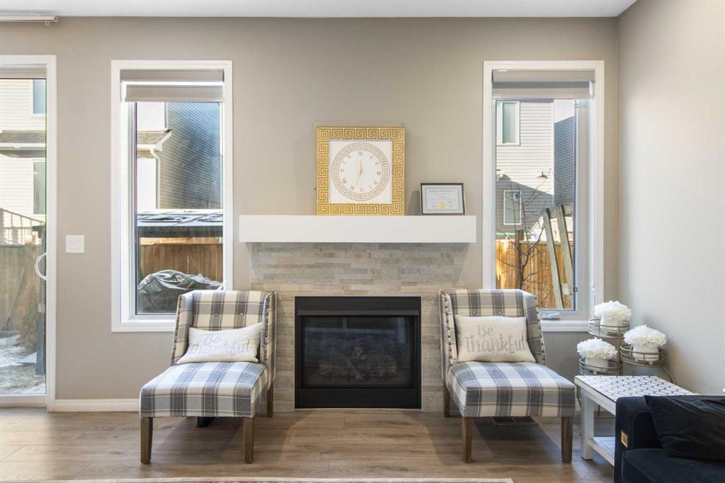 Welcome to this beautifully appointed detached home in the quiet and peaceful community of Carrington, offering over 2,600 sq ft of developed living space and quick access to Stoney Trail for an easy commute. The main level features 9’ ceilings and an open-concept layout filled with natural light. The spacious living room is anchored by a gas fireplace, while the gourmet kitchen showcases quartz countertops, a large central island, and ample cabinetry — perfect for everyday living and entertaining. The dining area opens to a west-facing backyard, ideal for enjoying evening sun. Upstairs offers three generously sized bedrooms, including a spacious primary retreat with a large walk-in closet and a luxurious 5-piece ensuite. A 5-piece main bathroom completes the upper level, providing excellent functionality for families. The fully finished basement adds valuable living space with a versatile recreation area, kitchenette, and a 3-piece bathroom, perfect for guests, a home gym, or media room. Enjoy being just minutes from a beautiful nearby pond, public transit, parks, and pathways, with a bus stop only minutes away. The double attached garage, peaceful surroundings, and convenient access to major routes make this home an outstanding opportunity in Northwest Calgary.