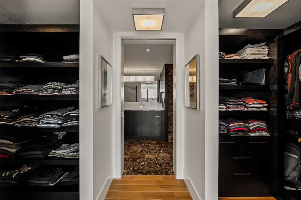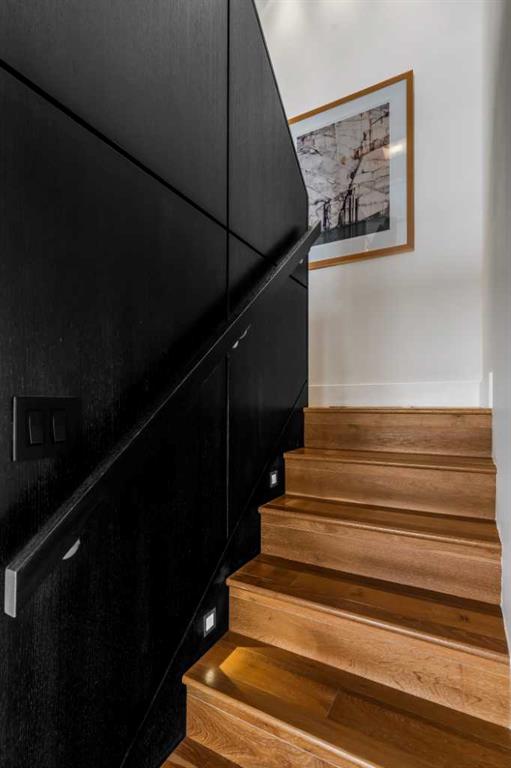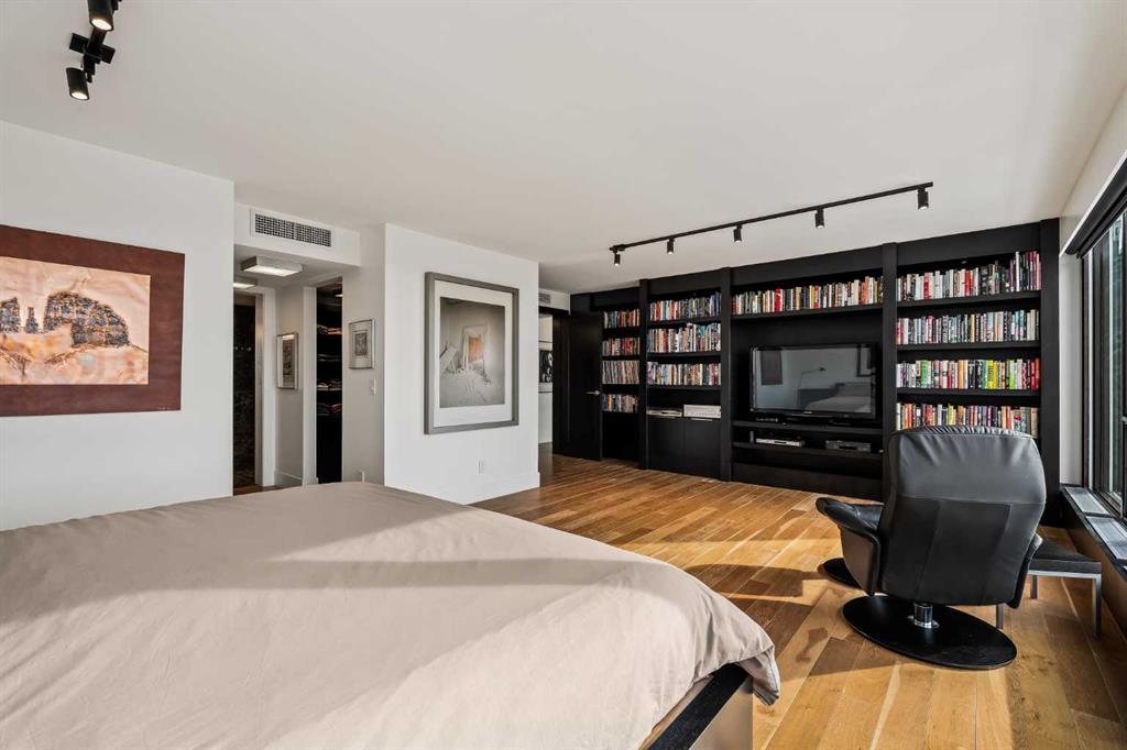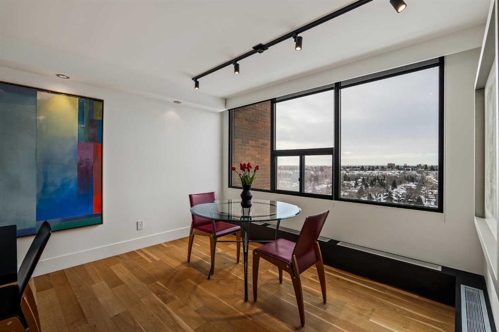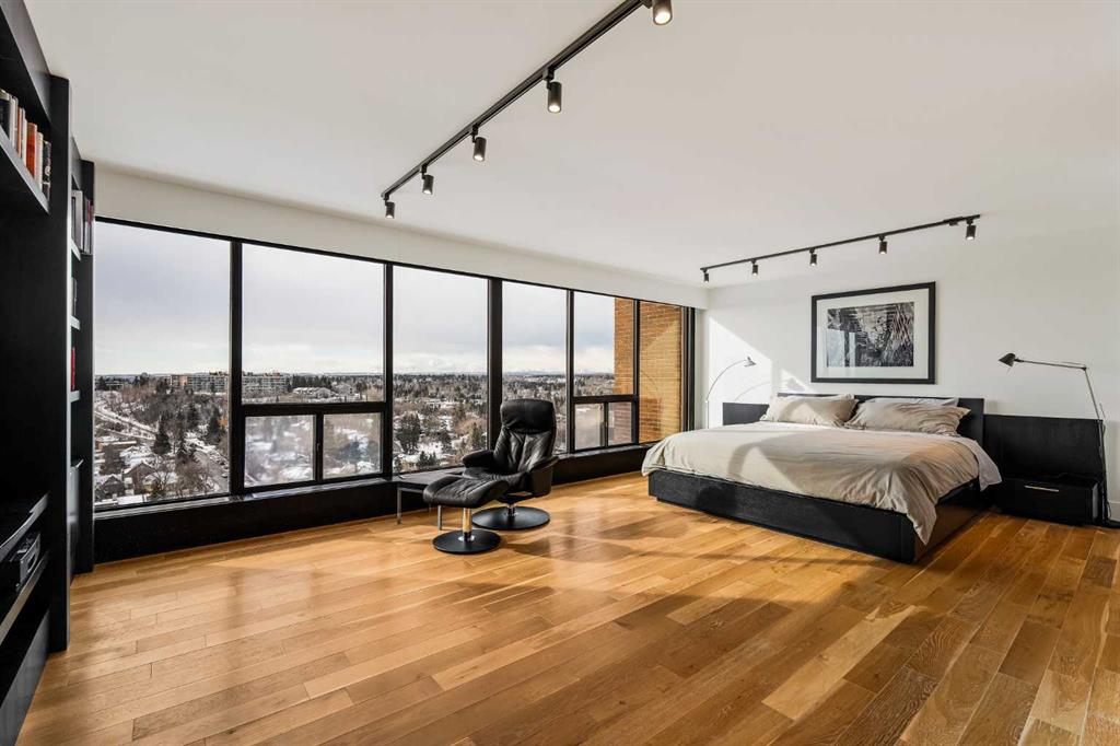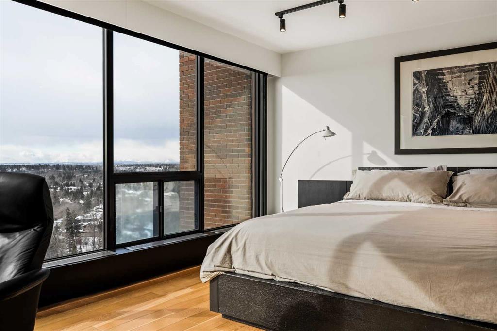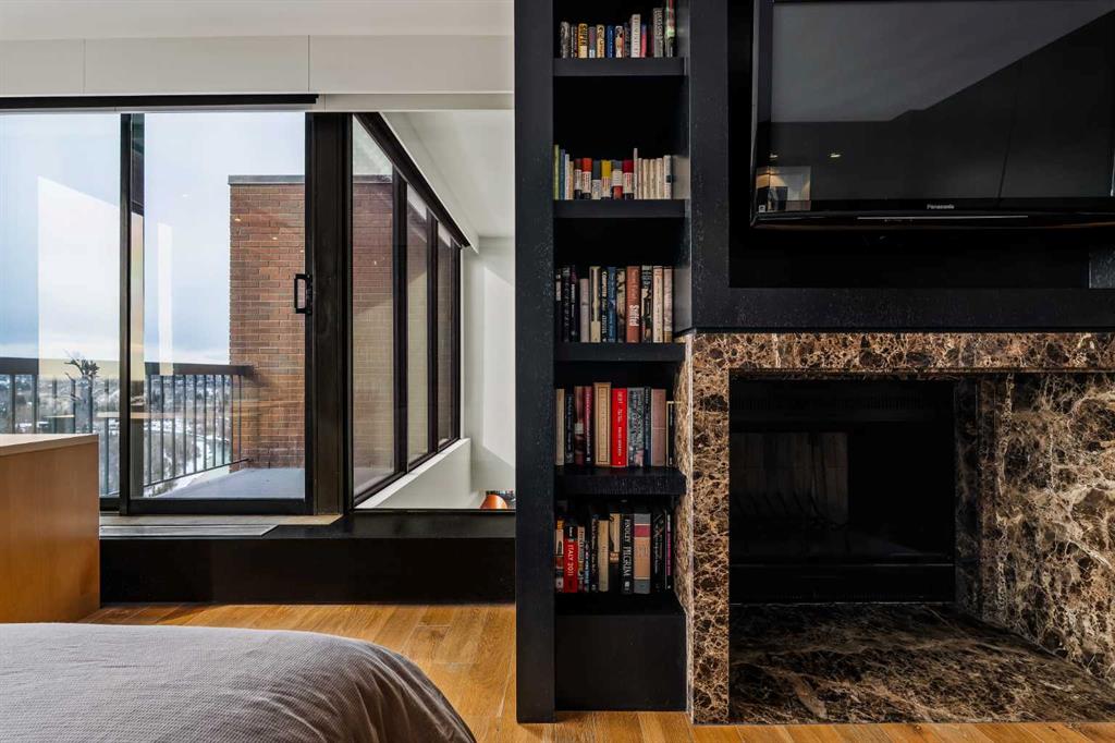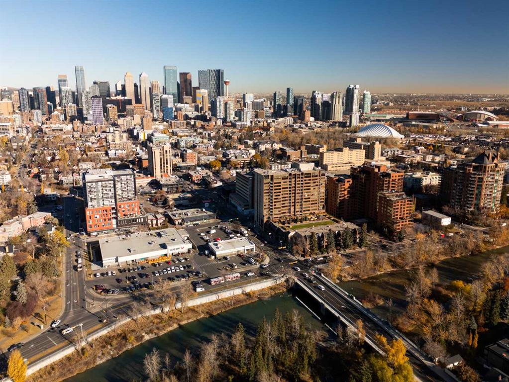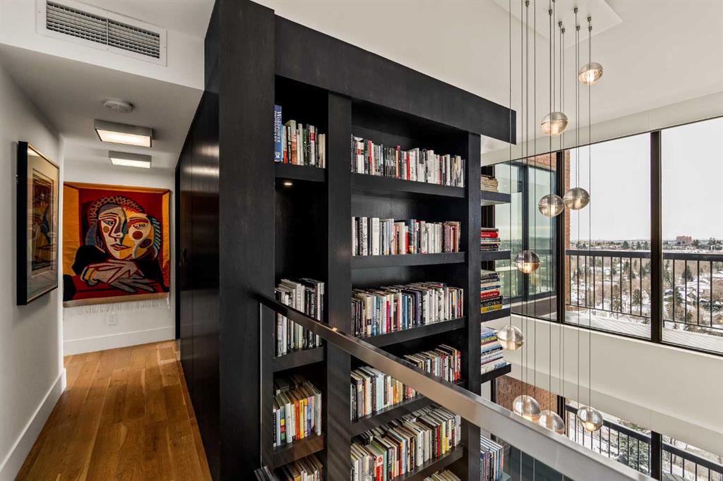 Architecturally renovated, this remarkable 2 storey penthouse delivers over 2,300 sq ft of refined living space with sweeping river valley and mountain views in the heart of Mission. Positioned within Roxboro House, one of Calgary’s most established concrete buildings, the home places river pathways, restaurants, cafés and downtown access within an easy walk while maintaining a quiet elevated setting above the city. Dramatic double height ceilings define the main living space where floor to ceiling windows frame expansive views and fill the interior with natural light throughout the day. Custom millwork and built-in library shelving introduce architectural character while a striking Bocci designer light installation creates a sculptural focal point above the living area. Marble fireplace surrounds add warmth and elegance while hardwood flooring extends throughout the home to create a cohesive and timeless finish. Entertaining flows easily between the living and dining areas where open sightlines toward the river valley form an impressive backdrop for gatherings. Quartz countertops and a full height quartz backsplash highlight the beautifully renovated kitchen where extensive custom cabinetry and a large central island support both daily routines and larger entertaining. Walk-in pantry storage keeps the space organized while built-in speaker wiring enhances the atmosphere for hosting. Adjacent bar cabinetry incorporates three wine fridges with capacity for approximately 750 bottles, creating a dedicated entertaining feature rarely found in condominium living. Upper level design introduces a flexible den retreat with its own fireplace and access to a second balcony, offering an ideal setting for a home office, lounge or private reading space overlooking the city skyline while an included Murphy bed allows the space to easily accommodate overnight guests when needed. Primary bedroom accommodations prioritize comfort and privacy through large windows, blackout blinds and extensive custom storage solutions. Heated floors in the lavish ensuite provide everyday comfort while modern fixtures enhance the spa-inspired atmosphere. Air conditioning supports year-round comfort and upper level laundry adds everyday convenience. Two private balconies extend the living space outdoors while showcasing panoramic mountain and river views. Tandem underground parking accommodates 2 vehicles and an assigned storage unit adds valuable extra space. Roxboro House residents enjoy secure entry with front desk service along with exceptional amenities including an indoor pool, hot tub, sauna, fitness room, woodworking shop, library and billiards lounge, party room and a beautifully landscaped sky terrace with BBQ areas and outdoor gathering spaces. Mission remains one of Calgary’s most vibrant inner-city neighbourhoods where river pathways, parks, restaurants and boutique shopping create an exceptional walkable lifestyle just minutes from downtown.