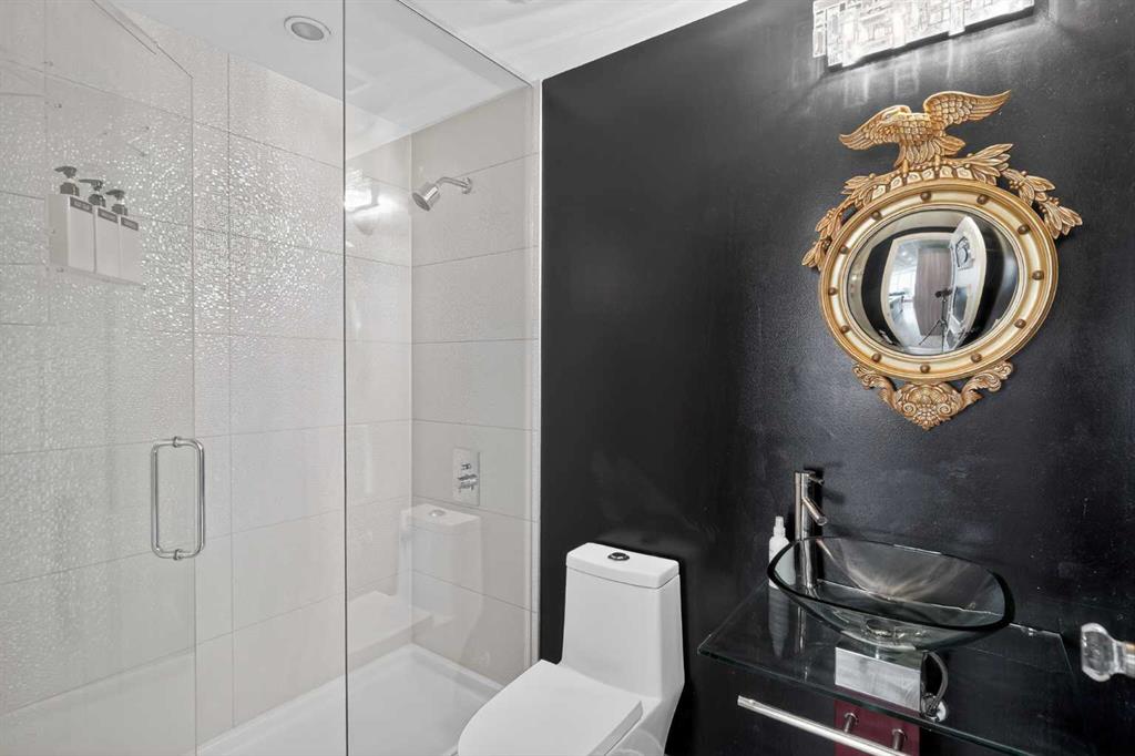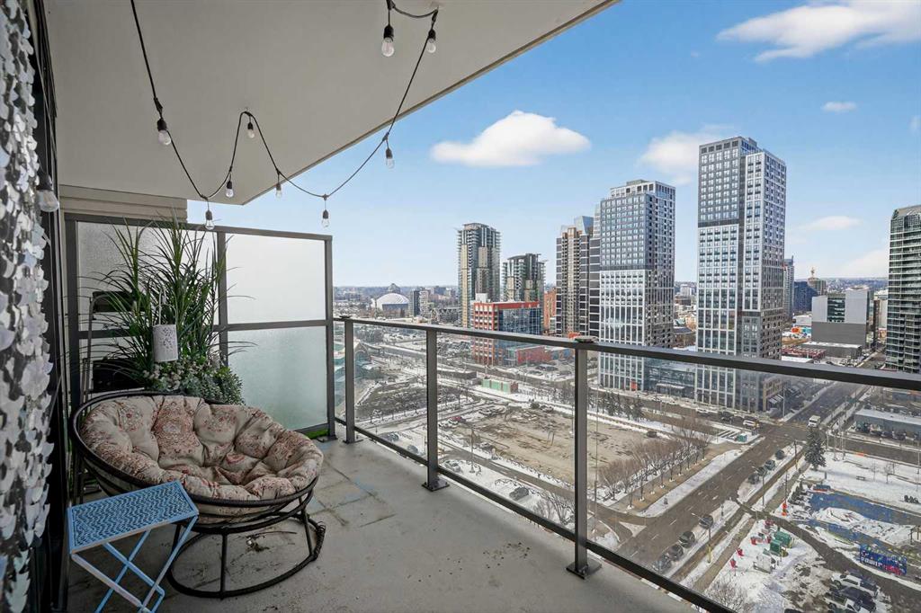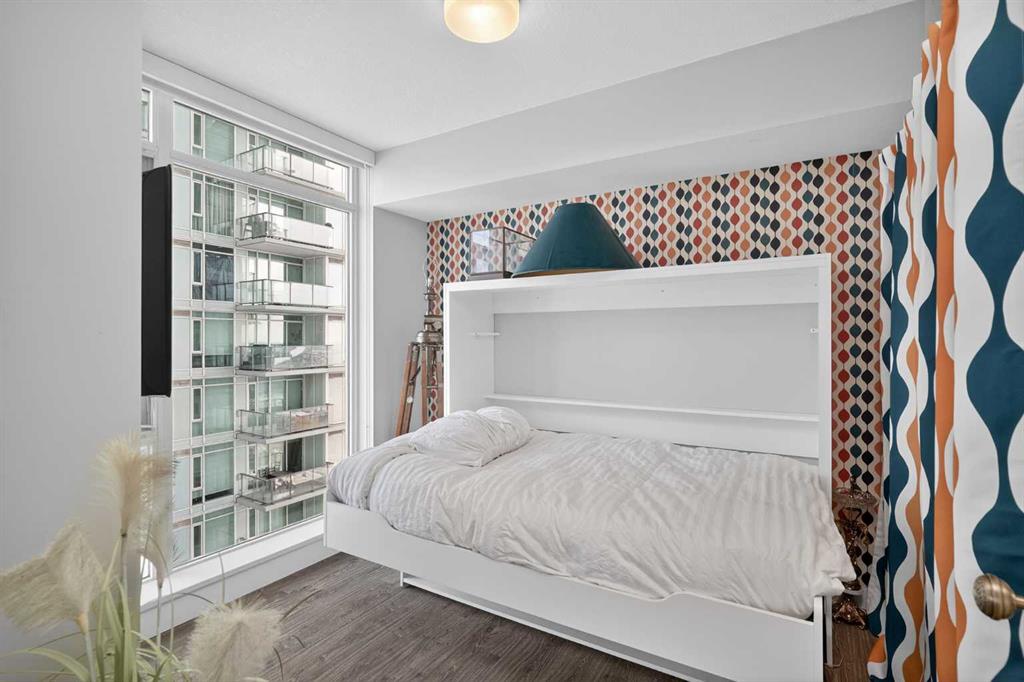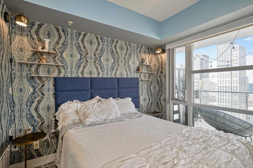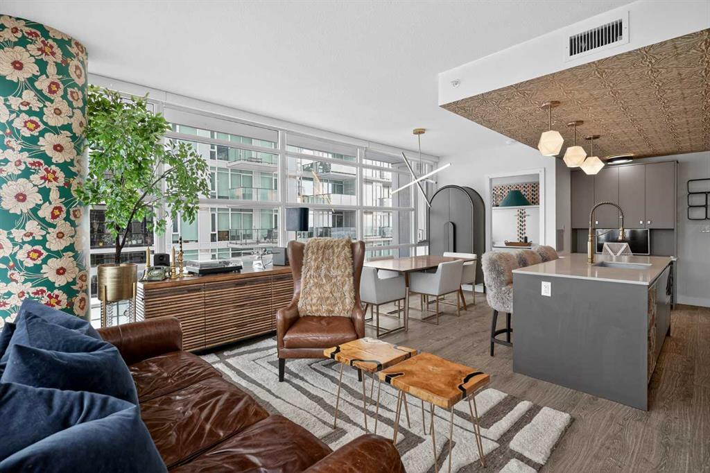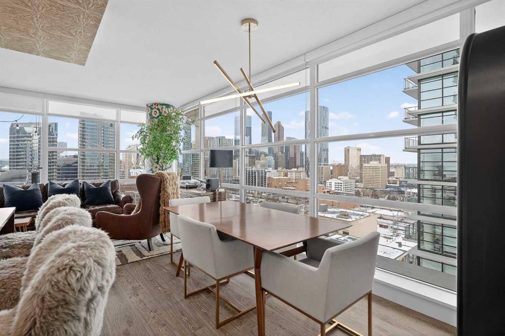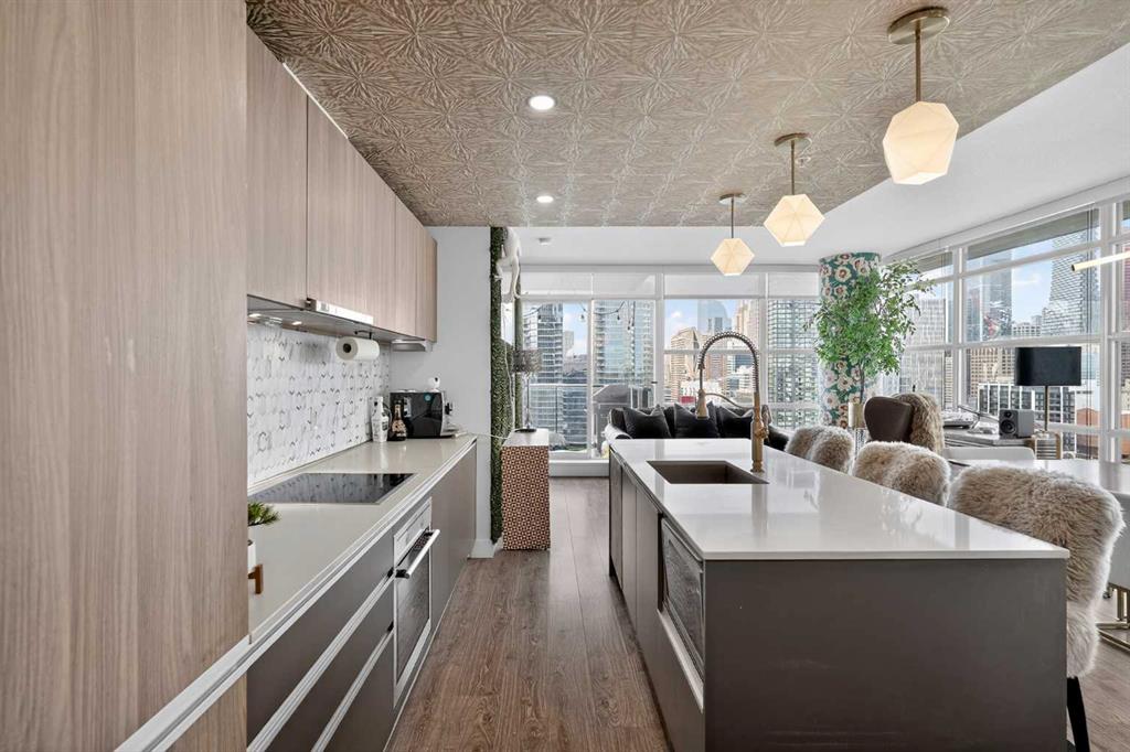 Welcome to the Gaurdian, South Tower. Truly one of Calgary’s most sought after and spectacular buildings. This 2 bedroom, 2 bathroom home is unlike any other you have seen. Walking in you are greeted with gorgeous laminate floors, a white and gold feature wall and custom light fixtures. Entering into your open floor plan starts with your chef inspired kitchen with gold fixtures, custom built-in’s in the cabinets and drawers, custom back splash, quartz counter tops and built-in stainless steel appliances. The large dining space is not something you normally find in a condo and is a great area to entertain or for quiet nights at home with the family. Your living room is a great size and offers you expansive VIEWS of DOWNTOWN, THE CALGARY TOWER, the MOUNTAINS, and connects to you west facing balcony. With this home being a corner unit you have amazing floor to ceiling windows offering views from every room. The primary bedroom is large enough for a king size bed as well as additional bedroom furniture and has a beautiful ensuite bathroom. The second bedroom is also a great size and has a custom MURPHY BED that was designed for the space and doubles as a home office. The second bathroom is custom designed and has a huge walk-in shower. The unit INCLUDES ALL TV’S AND MOUNTS as well as 2 TITLED SIDE BY SIDE UNDERGROUND PARKING SPACES!!!!! The Gaurdian has great amenities including a massive gym, social room, garden terrace, workshop, and is steps from the stampede grounds, great restaurants, shopping, bus and train routes giving you the best of downtown living. Do not miss out on your opportunity to own the most unique home in one of Calgary’s most desired luxury buildings.