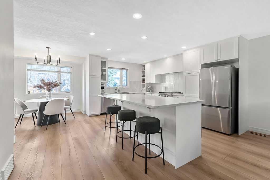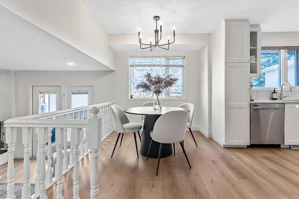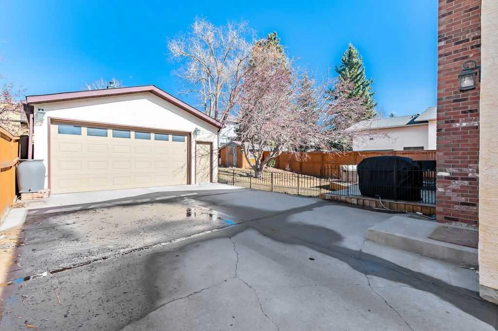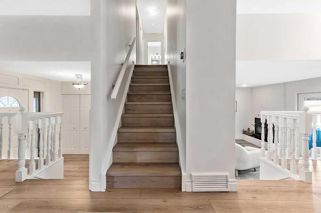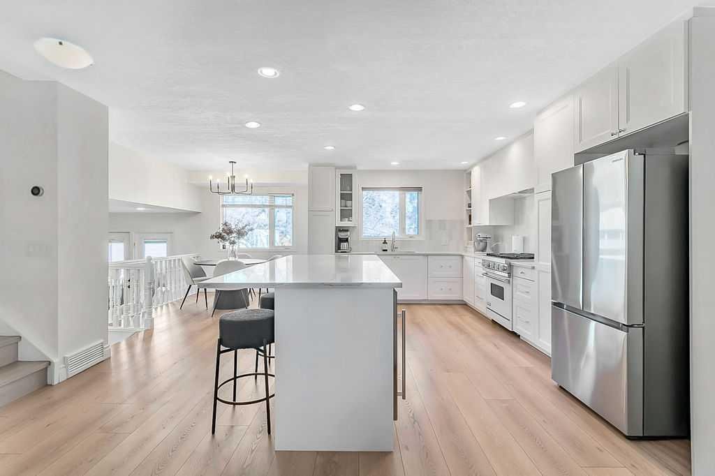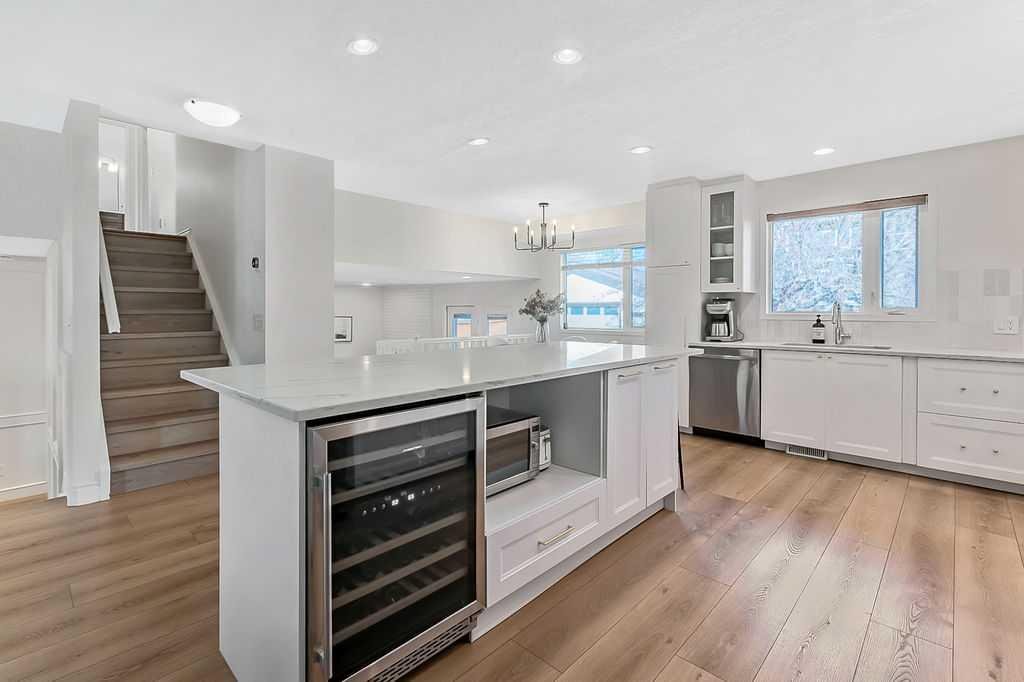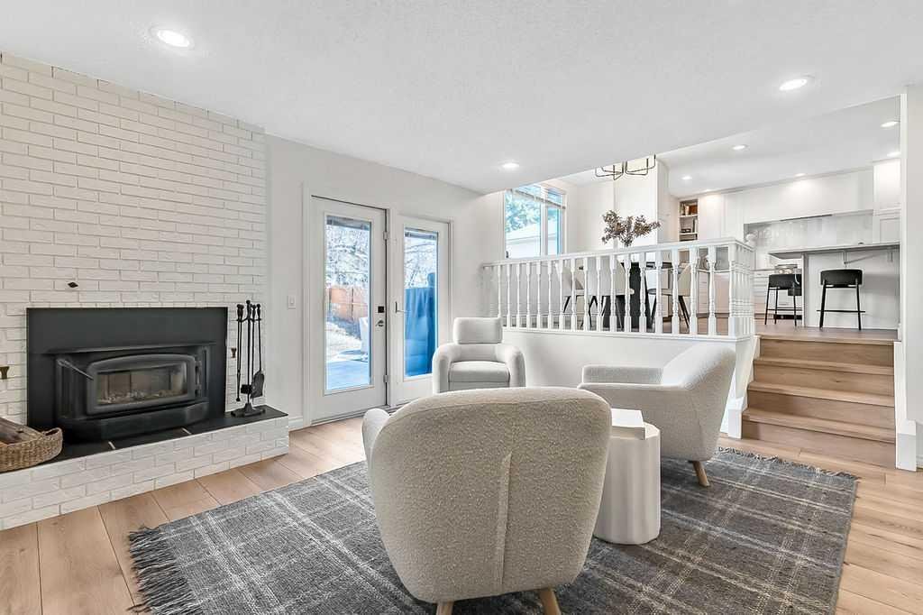 BEAUTIFULLY RENOVATED, WELL MAINTAINED 2 storey split on a quiet cul-de-sac in a premier spot in desirable Woodlands! Situated on a large, private lot (over 6300 sq ft) this home is located in a fantastic location – just a short walk down a path to Fish Creek Park, close to schools, shopping, transit and the ring road. The home offers over 2300 sq ft of developed living space with 4 bedrooms (one on the main floor that could be used as an office or den), 2 four piece bathrooms on the upper level and a two piece bathroom on the main level. The main floor was tastefully upgraded in 2023 with luxury vinyl plank flooring and a gorgeous spacious kitchen featuring a massive island, new refrigerator, new beverage fridge, new dishwasher & a classic Viking gas range. A well thought out floor plan provides perfect spaces for entertaining in either the kitchen, expansive main living room or in the cozy lower family room complete with a wood fireplace (which has a heatilator insert with an optional fan that can heat the home) & garden doors opening up onto the spacious deck & lovely back garden. A mudroom/laundry room which holds the stacked washer and dryer completes this level. The second level has hardwood throughout its 3 bedrooms. The primary bedroom has lots of storage with closet organizers and has a 4 piece ensuite. The other 2 bedrooms are spacious with one having a murphy bed for flexibility. The lower level offers an expansive recreation room and a separate storage area. There is a new hot water tank (2022), hook up for a Kinetico system, humidifier and water softner. The oversized heated double garage (with work bench!) is situated facing the street and is at the end of a side driveway that can accommodate extra vehicles. New shingles for the garage were installed in 2024. This home is a perfect blend of style, space and functionality and is move in ready. Rarely do homes with renovations of this kind come on the market in this desired community!