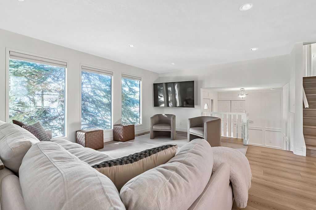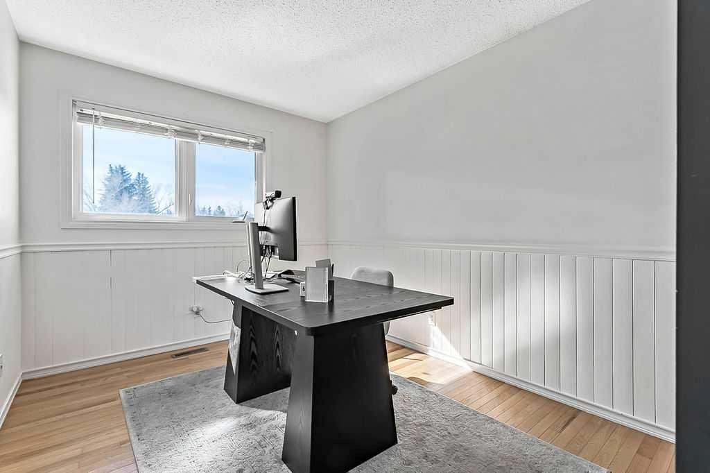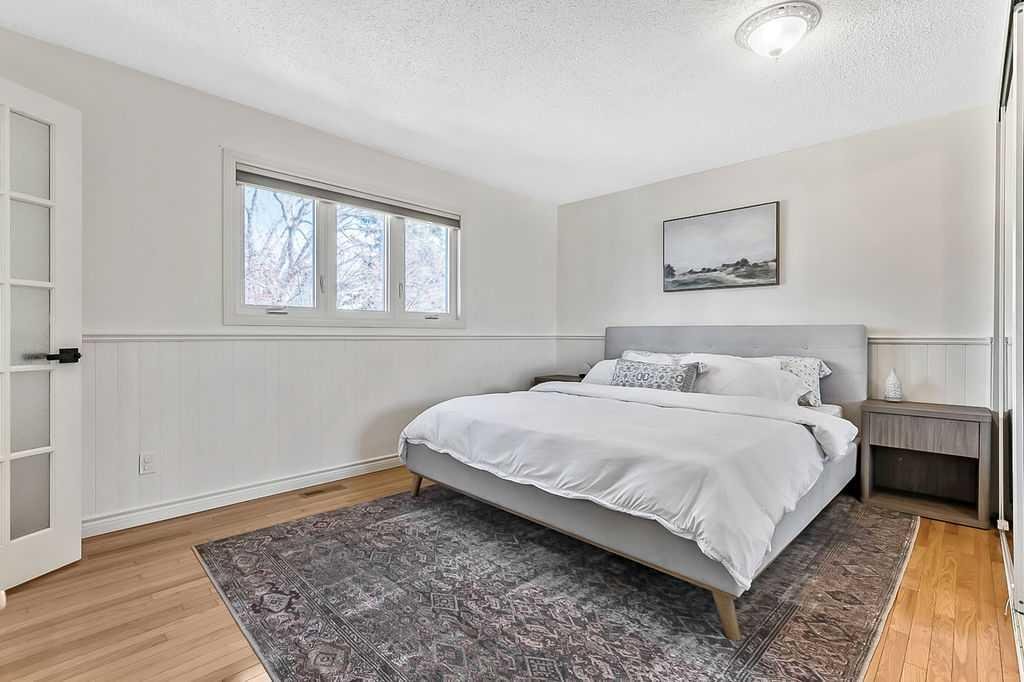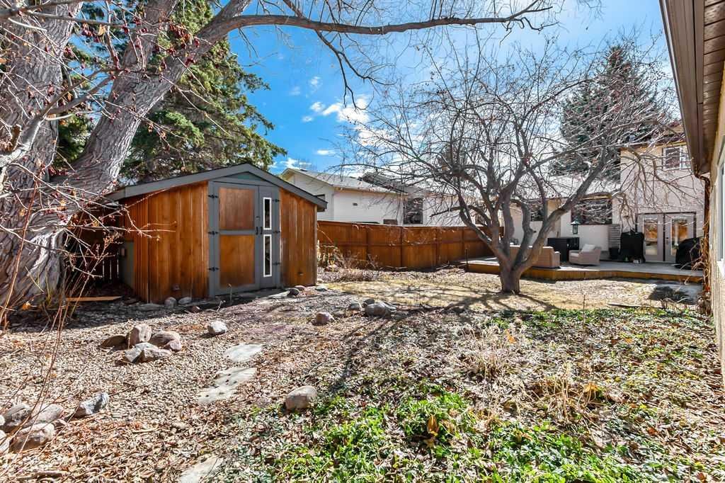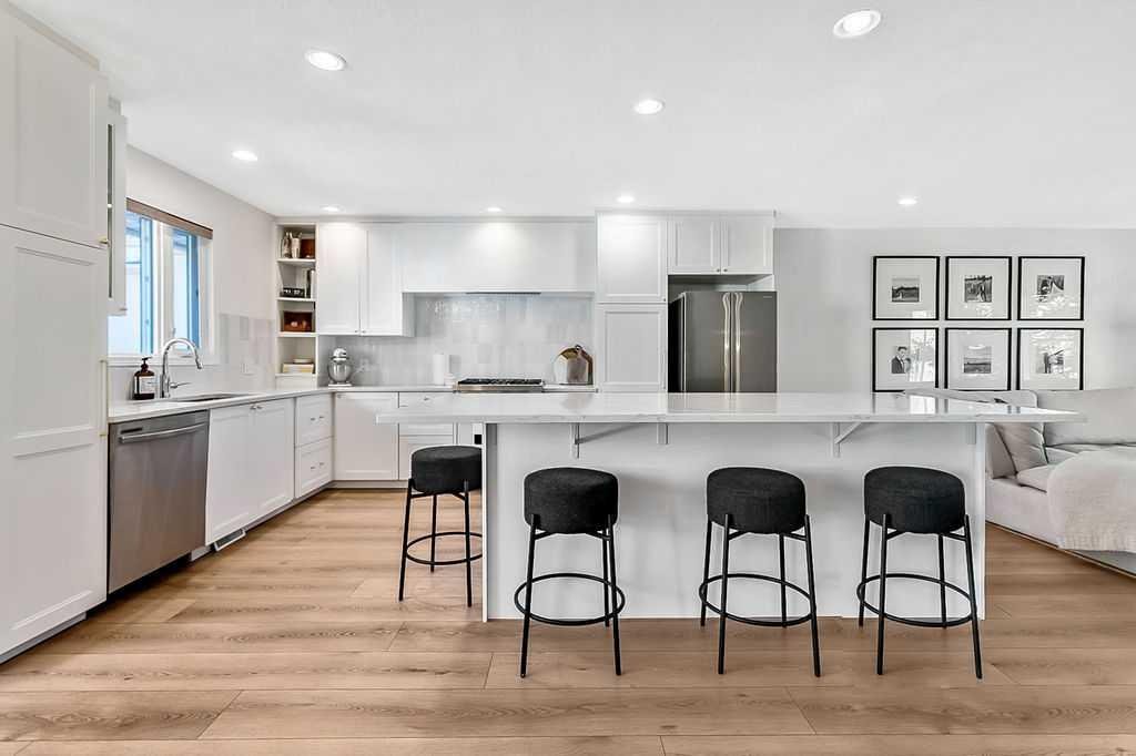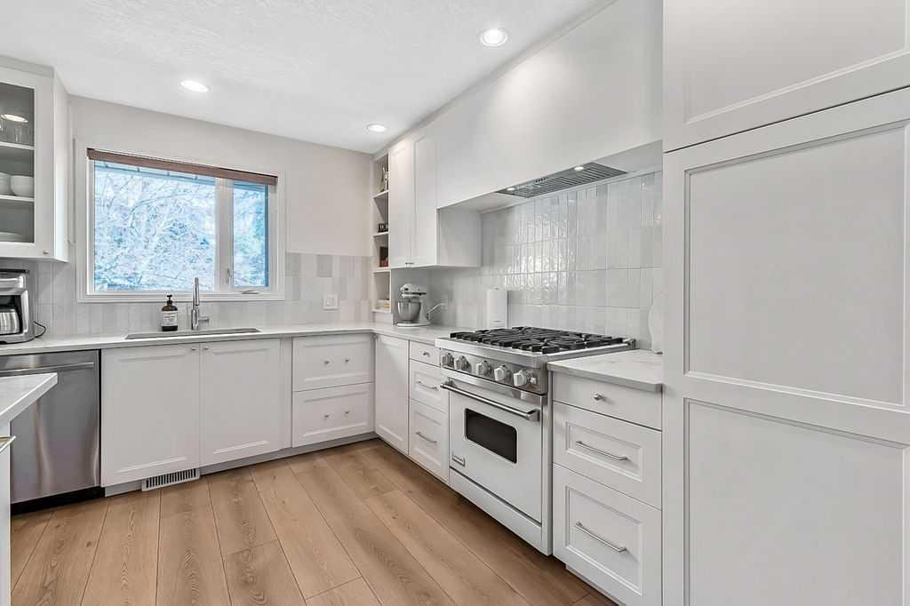 BEAUTIFULLY RENOVATED, WELL MAINTAINED 2 storey split on a quiet cul-de-sac in a premier spot in desirable Woodlands! Situated on a large, private lot (over 6300 sq ft) this home is located in a fantastic location – just a short walk down a path to Fish Creek Park, close to schools, shopping, transit and the ring road. The home offers over 2300 sq ft of developed living space with 4 bedrooms (one on the main floor that could be used as an office or den), 2 four piece bathrooms on the upper level and a two piece bathroom on the main level. The main floor was tastefully upgraded in 2023 with luxury vinyl plank flooring and a gorgeous spacious kitchen featuring a massive island, new refrigerator, new beverage fridge, new dishwasher & a classic Viking gas range. A well thought out floor plan provides perfect spaces for entertaining in either the kitchen, expansive main living room or in the cozy lower family room complete with a wood fireplace (which has a heatilator insert with an optional fan that can heat the home) & garden doors opening up onto the spacious deck & lovely back garden. A mudroom/laundry room which holds the stacked washer and dryer completes this level. The second level has hardwood throughout its 3 bedrooms. The primary bedroom has lots of storage with closet organizers and has a 4 piece ensuite. The other 2 bedrooms are spacious with one having a murphy bed for flexibility. The lower level offers an expansive recreation room and a separate storage area. There is a new hot water tank (2022), hook up for a Kinetico system, humidifier and water softner. The oversized heated double garage (with work bench!) is situated facing the street and is at the end of a side driveway that can accommodate extra vehicles. New shingles for the garage were installed in 2024. This home is a perfect blend of style, space and functionality and is move in ready. Rarely do homes with renovations of this kind come on the market in this desired community!