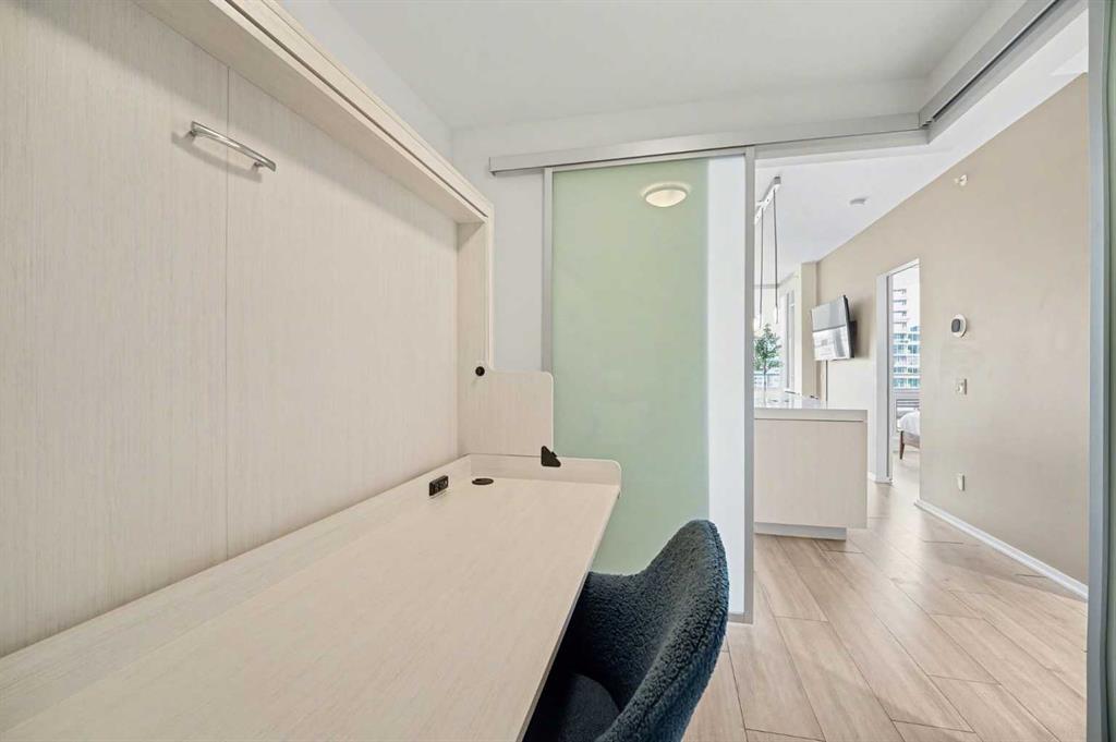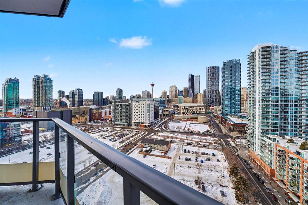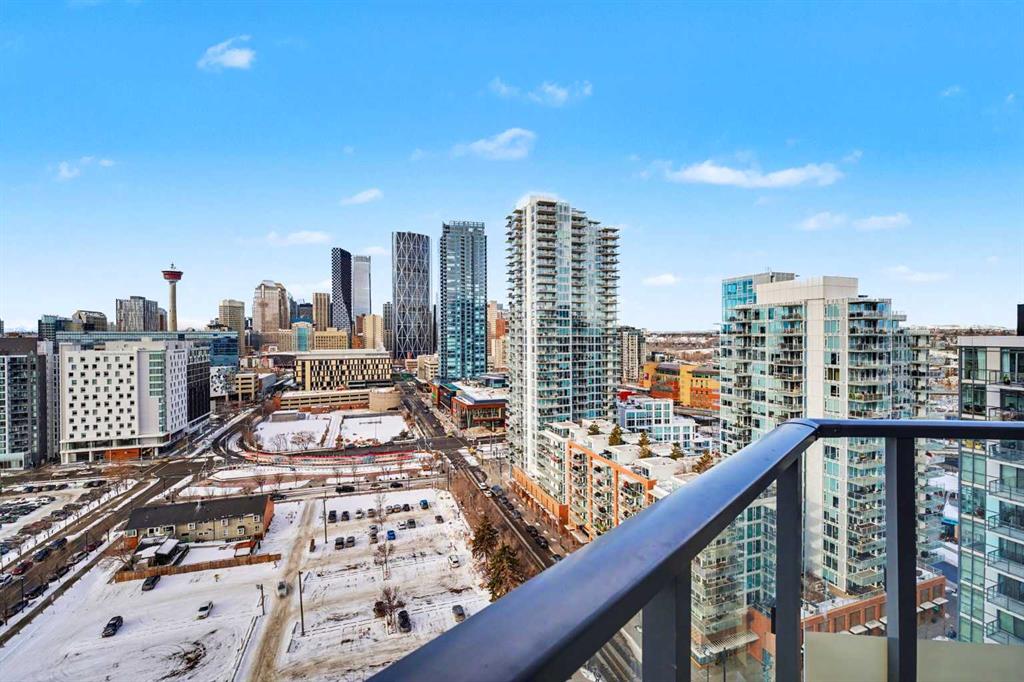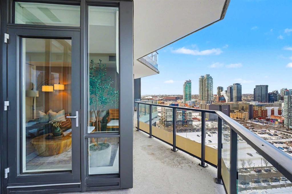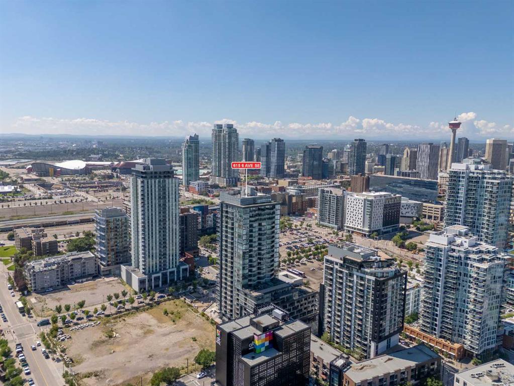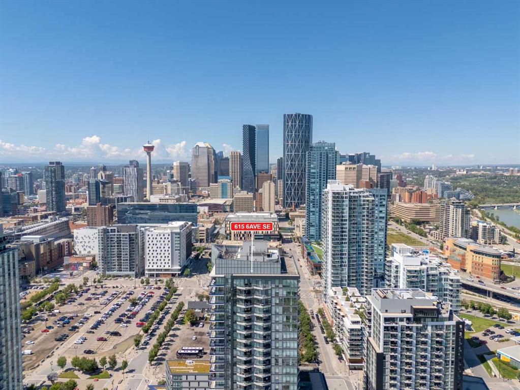 Experience refined inner city living from the 17th floor of Verve, a contemporary and secure high rise in the heart of East Village offering full concierge service and impressive resident amenities. This thoughtfully designed one bedroom, one bathroom plus den residence delivers both functionality and style, with expansive windows that frame beautiful views and flood the home with natural light. The primary bedroom is spacious and inviting, while the versatile den features a built in Murphy bed, making it ideal for overnight guests, a home office, or a flexible second sleeping area. The well appointed three piece bathroom includes a deep soaker tub and a practical layout that complements everyday living. The open concept design flows seamlessly through the kitchen, dining, and living areas, finished with sleek modern touches, in suite laundry, and air conditioning for year round comfort. Step outside to the covered balcony and enjoy elevated city views in every season. Living at Verve means having the best of East Village right outside your door. RiverWalk pathways, the CTrain, Superstore, cafes, restaurants, fitness studios, nail salons, Winners, and more are all just steps away, making this one of Calgary’s most walkable and energetic neighbourhoods. Residents enjoy access to exceptional amenities across two levels. The sixth floor features a fully equipped fitness centre, owners lounge with a full kitchen, library, ping pong tables, BBQs, and an inviting outdoor social space. The twenty fifth floor rooftop terrace is a true highlight, offering breathtaking panoramic views of the city skyline, Bow River, and surrounding mountains. This home includes titled underground parking, a separate storage locker, secure underground visitor parking, and ample street parking for guests. Pet friendly and approved for mid term rentals, this is an excellent opportunity for professionals, investors, or anyone seeking a stylish urban home in one of Calgary’s fastest growing communities.