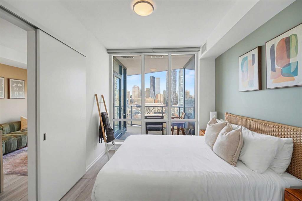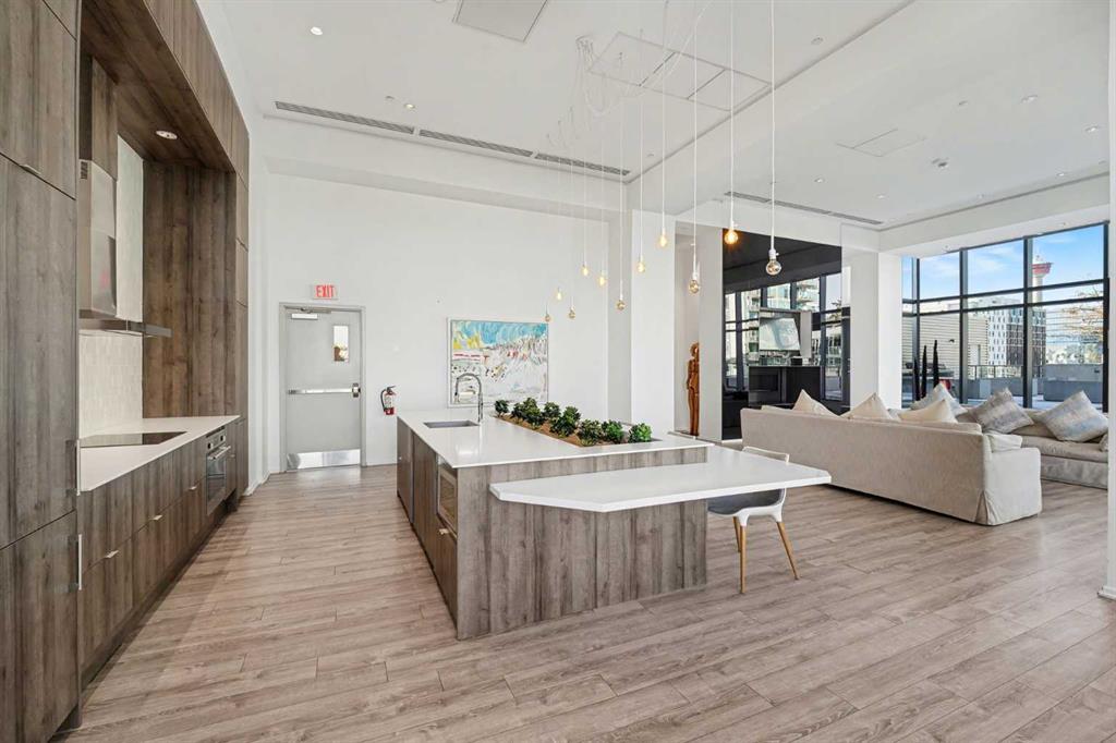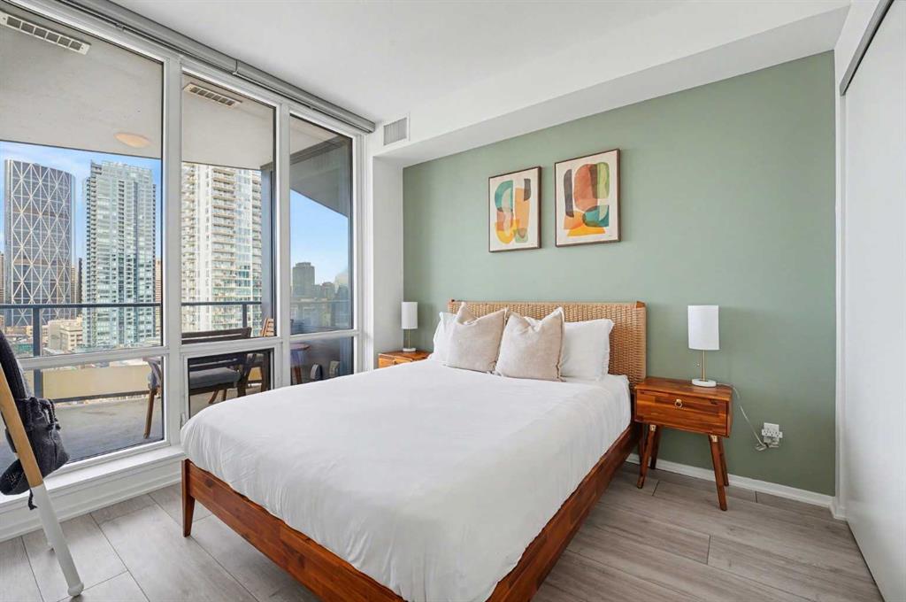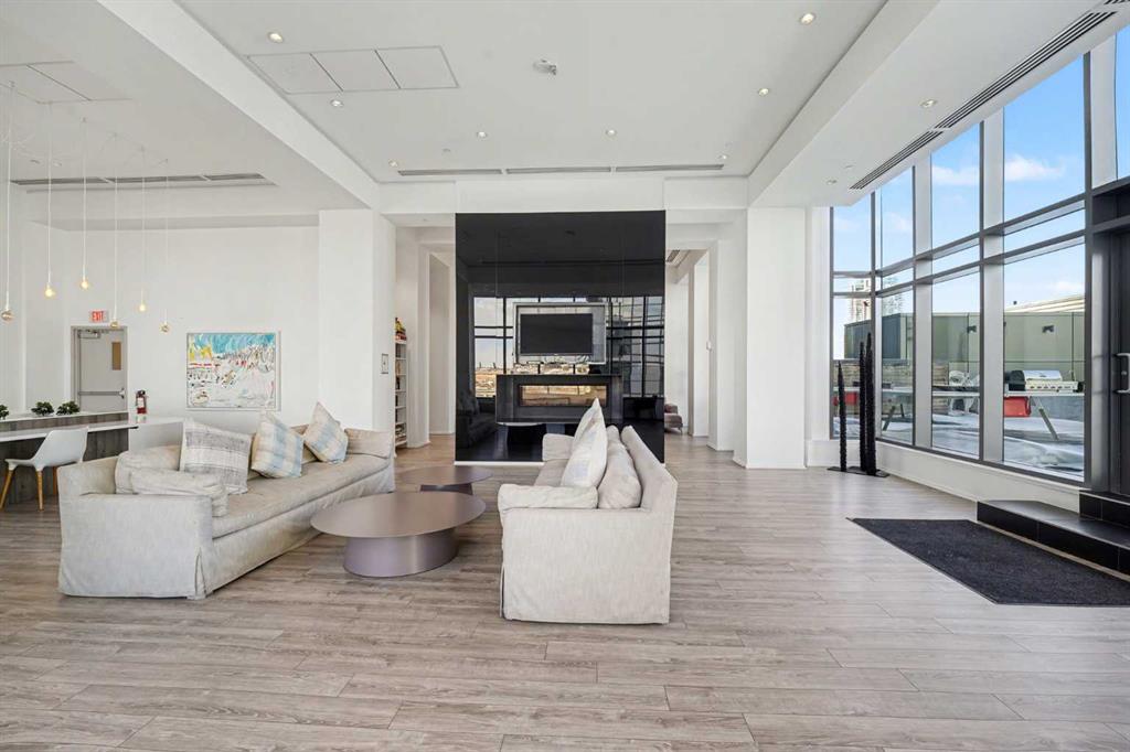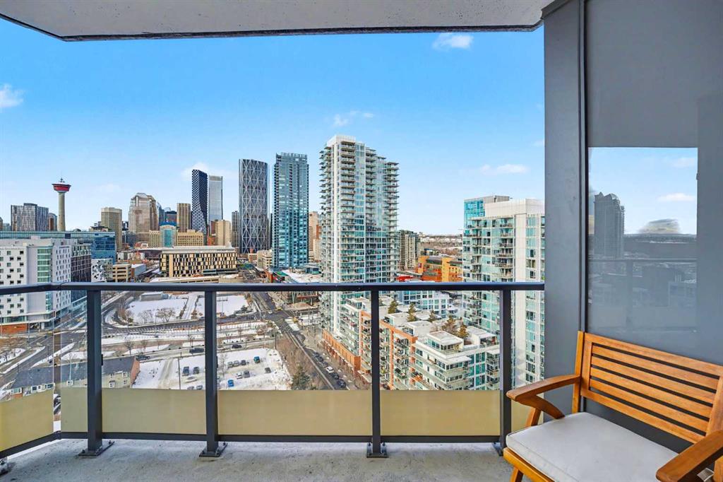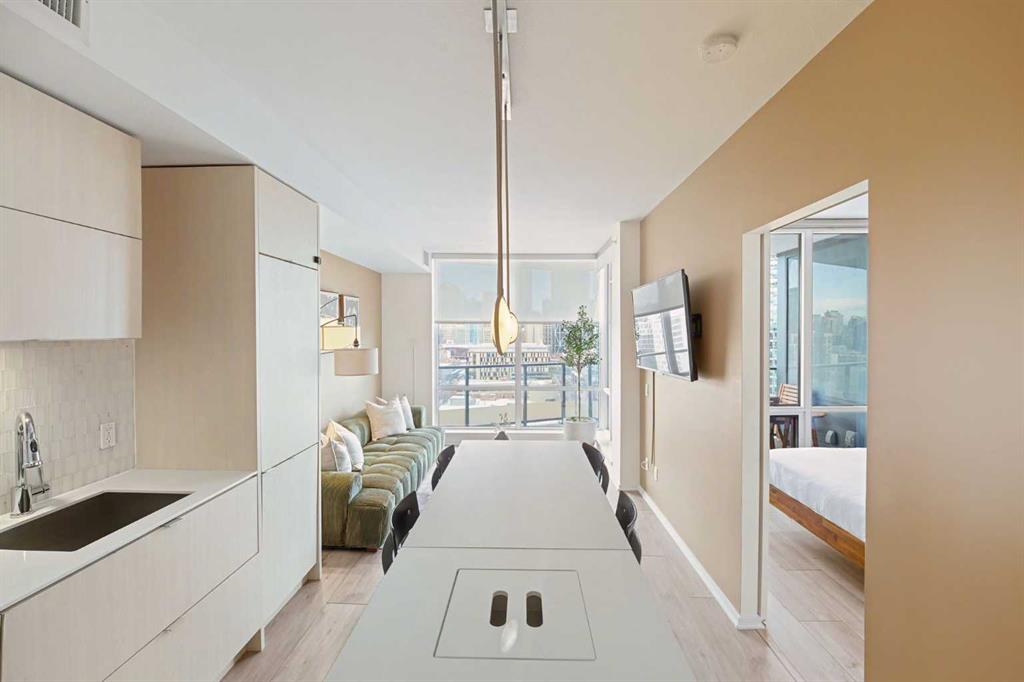 Experience refined inner city living from the 17th floor of Verve, a contemporary and secure high rise in the heart of East Village offering full concierge service and impressive resident amenities. This thoughtfully designed one bedroom, one bathroom plus den residence delivers both functionality and style, with expansive windows that frame beautiful views and flood the home with natural light. The primary bedroom is spacious and inviting, while the versatile den features a built in Murphy bed, making it ideal for overnight guests, a home office, or a flexible second sleeping area. The well appointed three piece bathroom includes a deep soaker tub and a practical layout that complements everyday living. The open concept design flows seamlessly through the kitchen, dining, and living areas, finished with sleek modern touches, in suite laundry, and air conditioning for year round comfort. Step outside to the covered balcony and enjoy elevated city views in every season. Living at Verve means having the best of East Village right outside your door. RiverWalk pathways, the CTrain, Superstore, cafes, restaurants, fitness studios, nail salons, Winners, and more are all just steps away, making this one of Calgary’s most walkable and energetic neighbourhoods. Residents enjoy access to exceptional amenities across two levels. The sixth floor features a fully equipped fitness centre, owners lounge with a full kitchen, library, ping pong tables, BBQs, and an inviting outdoor social space. The twenty fifth floor rooftop terrace is a true highlight, offering breathtaking panoramic views of the city skyline, Bow River, and surrounding mountains. This home includes titled underground parking, a separate storage locker, secure underground visitor parking, and ample street parking for guests. Pet friendly and approved for mid term rentals, this is an excellent opportunity for professionals, investors, or anyone seeking a stylish urban home in one of Calgary’s fastest growing communities.