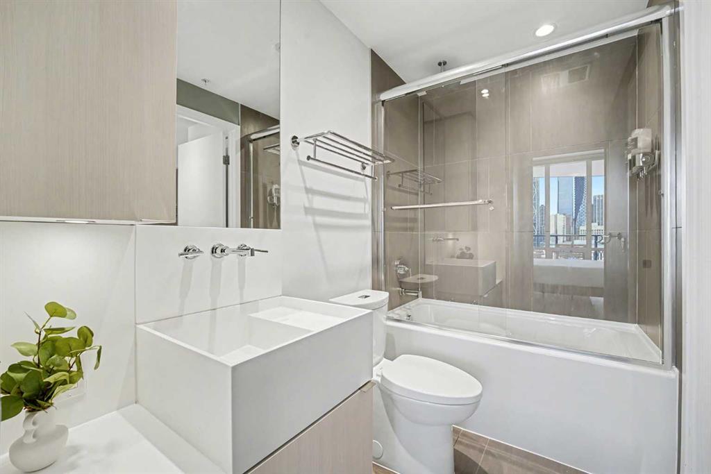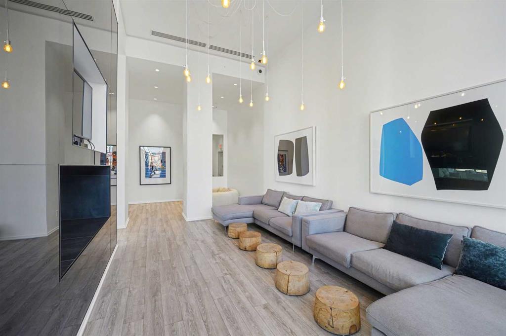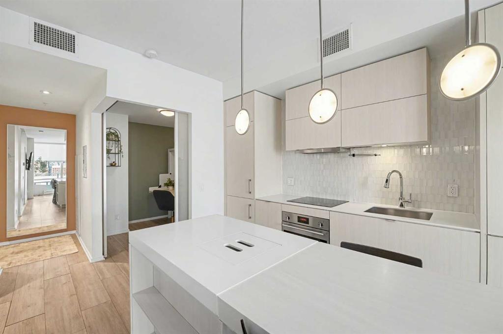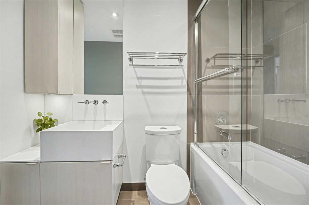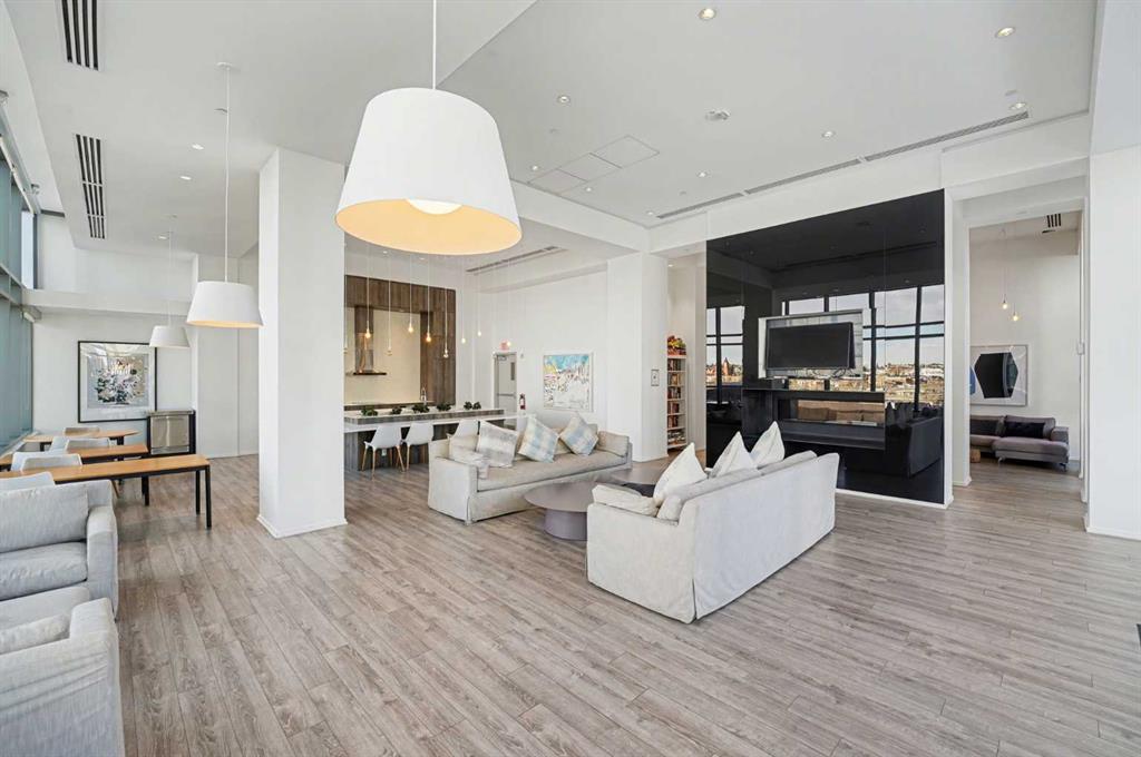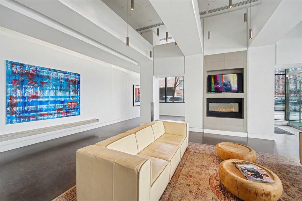 Experience refined inner city living from the 17th floor of Verve, a contemporary and secure high rise in the heart of East Village offering full concierge service and impressive resident amenities. This thoughtfully designed one bedroom, one bathroom plus den residence delivers both functionality and style, with expansive windows that frame beautiful views and flood the home with natural light. The primary bedroom is spacious and inviting, while the versatile den features a built in Murphy bed, making it ideal for overnight guests, a home office, or a flexible second sleeping area. The well appointed three piece bathroom includes a deep soaker tub and a practical layout that complements everyday living. The open concept design flows seamlessly through the kitchen, dining, and living areas, finished with sleek modern touches, in suite laundry, and air conditioning for year round comfort. Step outside to the covered balcony and enjoy elevated city views in every season. Living at Verve means having the best of East Village right outside your door. RiverWalk pathways, the CTrain, Superstore, cafes, restaurants, fitness studios, nail salons, Winners, and more are all just steps away, making this one of Calgary’s most walkable and energetic neighbourhoods. Residents enjoy access to exceptional amenities across two levels. The sixth floor features a fully equipped fitness centre, owners lounge with a full kitchen, library, ping pong tables, BBQs, and an inviting outdoor social space. The twenty fifth floor rooftop terrace is a true highlight, offering breathtaking panoramic views of the city skyline, Bow River, and surrounding mountains. This home includes titled underground parking, a separate storage locker, secure underground visitor parking, and ample street parking for guests. Pet friendly and approved for mid term rentals, this is an excellent opportunity for professionals, investors, or anyone seeking a stylish urban home in one of Calgary’s fastest growing communities.