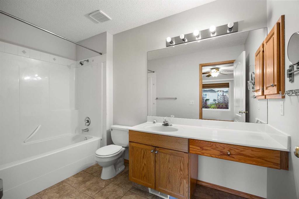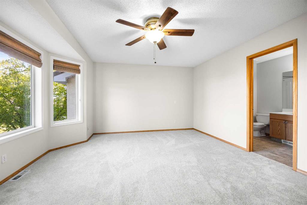 Upstairs offers a generous primary bedroom with ceiling fan, dual closets, and a 4-piece ensuite bath. Two additional well-sized bedrooms share another full 4-piece bath.