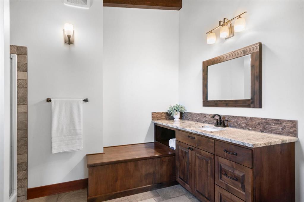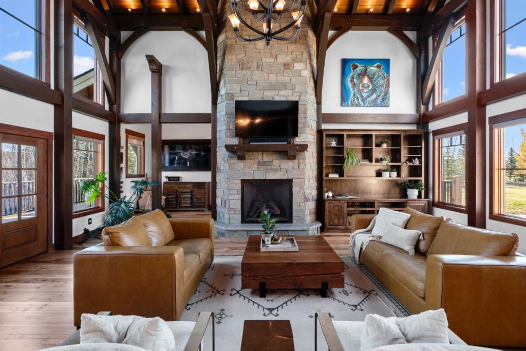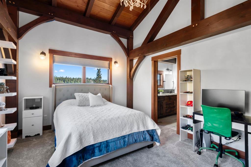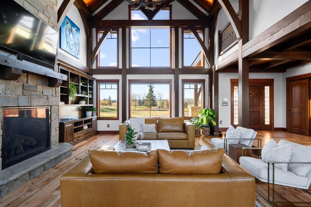 Timeless Quality in a Country Setting-CLOSE TO CALGARY! Land was originally hand chosen & 5 bed/5 bath home was lovingly crafted by existing owners! Built by Canadian Timberframes, this home reflects the enduring beauty & craftsmanship that define TRUE country living. Exposed timber beams create a sense of warmth & character, blending seamlessly w/open spaces PLUS VAULTED ceilings & expansive windows that frame the surrounding landscape. The exquisite outdoor views-become part of the interior! Designed for both comfort & efficiency, the home’s precision-engineered construction delivers exceptional insulation & energy performance. Every detail showcases quality, strength & natural elegance—making this a home that feels as solid & welcoming-as the land it sits on. Drive home on paved roads the entire way! Lovely quiet cul-de-sac enclave w/amazing neighbours. Mountain views! Long winding, PAVED driveway leads you thru manicured landscaping, fully fenced-directly to this majestic home. Home has a rustic WOW factor. Wood & Stone accents. Solid wood raised panel door. Enter to large foyer, great room w/vaulted ceilings & NATURAL LIGHT flooding in thru windows everywhere! Wood floors complement the style & are EASY to keep clean. This home is large but feels cozy at the same time. Open concept allows owners to enjoy floor to ceiling STONE fireplace-while relaxing, watching a show, dining or cooking! Plus transition directly outside to enjoy massive deck. Expands your living space! Primary bedroom located on this level w/ANOTHER fireplace, dual doors out to front deck, spa like 5 piece ensuite, walk in closet & direct access to HOT TUB on back deck! Your dining area is perfect for everyday OR special occasions. This kitchen is meant to be enjoyed! So much counter space, eat up area, High end SS appliances, gas stove, copper farm sink, special pot drawer! Convenient access to BBQ w/gas line OUTSIDE in covered area, 2 pc bath, HUGE mud room, mn floor laundry & ATTACHED/HEATED/OVERSIZED/TRIPLE garage w/epoxy floors. Head up solid WOOD floating stairs to upper level. Barnwood accents. Bonus room at front of home has its own deck! Use as extra living, bedroom, OFFICE-whatever suits your needs. 4 pc bath close by-allows it to operate as a separate wing. Imagine your guests enjoying those WEST views?! Office space overlooking great room, 2 more large bedrooms connected w/Jack & Jill 4 pc bath complete this level. Head down to fully finished WALKOUT basement. Wine rm, custom bar area, open space for cozy movie nights or future game tournaments! 2 more bedrooms, storage & full bath. Enjoy PAVED lower patio area. Moyie Rust Iron Stone imported to protect this space & add to visual enjoyment! Fenced garden, AC, Vacuflo, Boiler w/holding tank=infloor heat in garage & basement. 14 mins to groceries, amenities, services etc. in Clgr. 15 mins to Costco. 30 min drive to downtown Calgary! 15 mins to Bragg Creek & just over an hr to enjoy the mountains!!