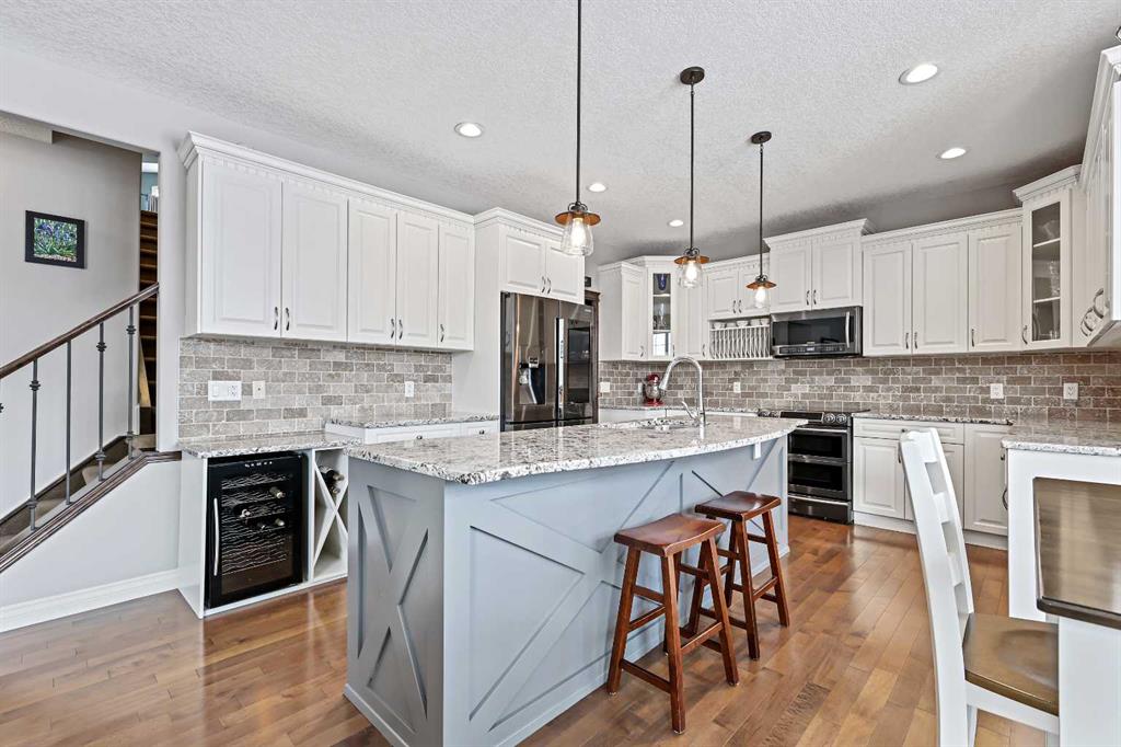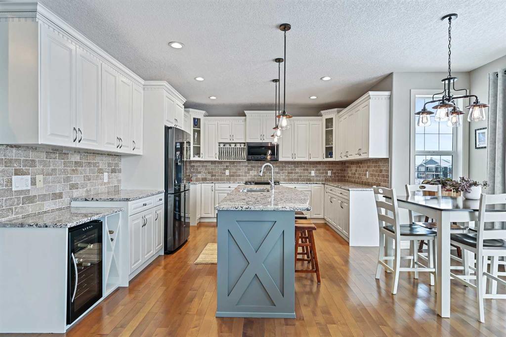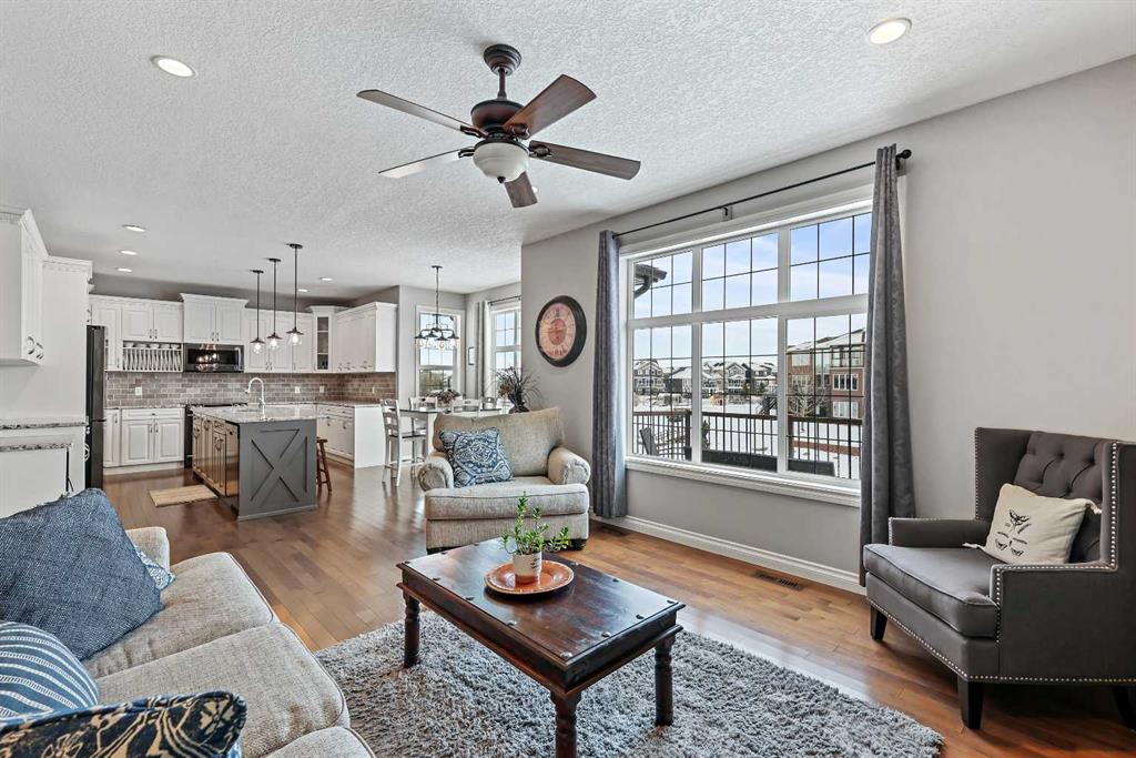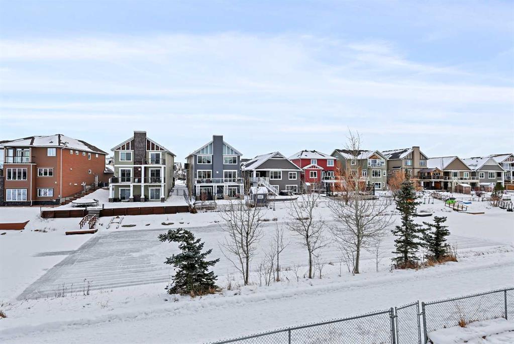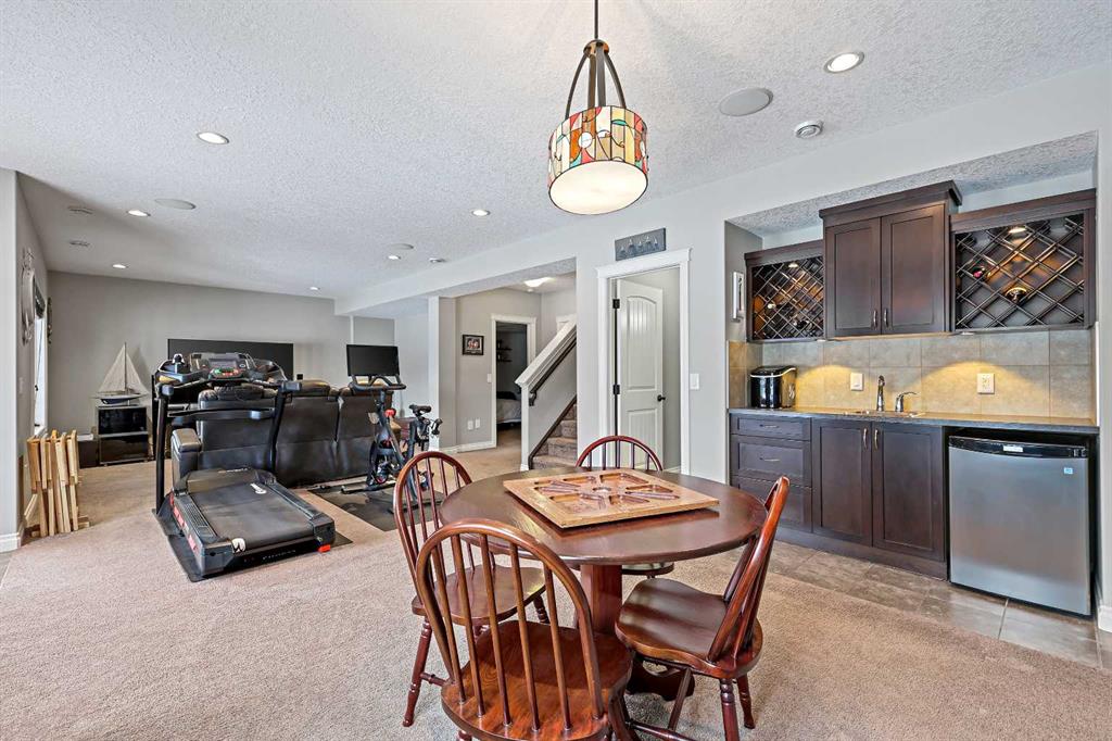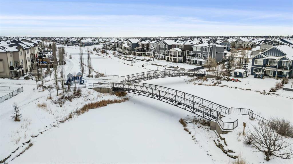 Welcome to Bayside, where a true village atmosphere defines everyday living and community comes first. Here, neighbours gather, children play freely, and winter ice rinks become a shared tradition for all to enjoy. In the summer enjoy paddle boarding and kayaking in your own back yard. This beautifully maintained, air conditioned home has been thoughtfully cared for and is ready to welcome its next family. With 4 beds, 3.5 baths, and more than 3,500 sq ft of developed living space, this home has space for everyone. The main floor offers an exceptional open-concept layout featuring a stunning kitchen, living area, and breakfast nook designed for both daily living and effortless entertaining. Granite countertops, upgraded stainless steel appliances, an abundance of cabinetry, an oversized island with seating space, and an included wine fridge create a space that is as functional as it is inviting. Soaring ceilings and expansive windows overlooking the canal are perfectly complemented by a gas fireplace, creating a warm and elegant backdrop. This level also includes a formal dining room, a spacious den, a convenient half bath, and a mudroom with walk-through pantry access, ideal for seamless organization. Upstairs, the home continues to impress with an oversized bonus room perfect for movie nights or relaxing gatherings. The large primary retreat, accessed through French doors, features a spa-inspired five-piece ensuite with jetted tub and separate shower, along with a spacious walk-in closet. Two additional generously sized bedrooms and a four-piece bath complete this level. Originally designed with four bedrooms up and main-floor laundry, one upper bedroom has been converted into an exceptional laundry room, with the option to easily revert back to a five-bedroom layout as original hookups remain. The professionally developed lower level offers a private bedroom for guests or teens, a three-piece bath, ample storage, a wet bar, and a show-stopping recreation room with Dolby 7.1 wiring and built in ceiling speakers. This level has walk-out access to a concrete patio overlooking the canal. An additional poured concrete pad with cedar pergola and hot tub rough-in adds even more outdoor potential. Additional highlights include central air conditioning, refreshed paint throughout the main and upper levels, and evident pride of ownership throughout. Backing onto the canal and facing greenspace, soccer fields, and ball diamonds, the home also benefits from additional parking options and endless family-friendly recreation. Nose Creek Elementary is just steps from the front door, with parks, pathways, shopping, and amenities close at hand. Bayside remains one of Airdrie’s most sought-after communities—this is a move-in-ready home offering exceptional lifestyle and value.