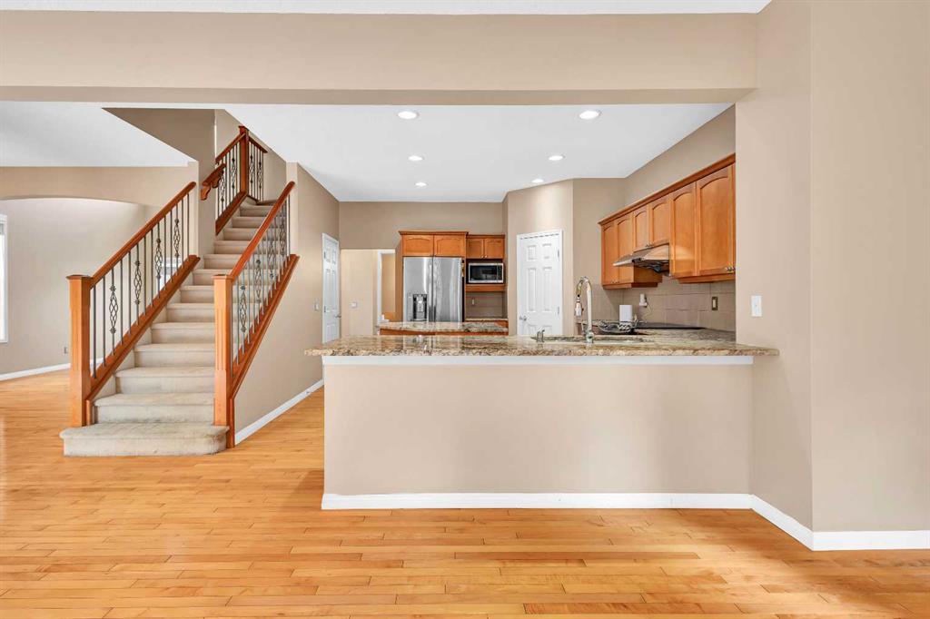 NEW PRICE FOR YOUR NEW HOME. A Rare Find: Elegant Family Home Across from the Park Nestled on a quiet crescent in one of the city’s most desirable neighborhoods, this fully developed residence combines timeless design with thoughtful updates. Facing a wide stretch of green space and offering a west-facing backyard, the home captures both natural beauty and everyday convenience. From the moment you step inside, the meticulous care of this property is evident. Maple hardwood floors flow through the main level, complemented by soaring 9-foot and vaulted ceilings in the living room. A wall of maple cabinetry anchors the bright, open kitchen, enhanced by generous pot lighting, a central island with a sit-up counter, and a corner pantry. The maple and iron railings lend a refined architectural detail, while two fireplaces—each equipped with thermostats and fans—add warmth and comfort. Upstairs, three generously sized bedrooms await. The primary suite offers a tranquil retreat, complete with a ceiling fan and a spa-like five-piece ensuite featuring a jetted soaker tub. The lower level extends the living space with a large family room, fully wired for home theatre, along with a fourth bedroom and full bath—perfect for guests or teenagers seeking their own corner of the home. Every detail has been thoughtfully considered. Custom window coverings remain with the property, and even the storage shelving has been designed to stay. Outdoors, the backyard is a private haven: a cedar deck with pergola, a stamped concrete patio, and mature trees framed by a cedar fence. Two exterior water faucets make garden care effortless. Recent upgrades bring peace of mind, including a new roof (2020), siding (2021), and fencing (2019). Granite countertops were added to the kitchen in 2010, tile flooring refreshed the living room in 2018, and the entire house has been freshly painted and professionally cleaned. Air conditioning is included in as-is condition. With its exceptional location, elegant features, and list of upgrades, this home represents a rare opportunity to enjoy both comfort and community—just steps from the park and surrounded by the beauty of mature landscaping.