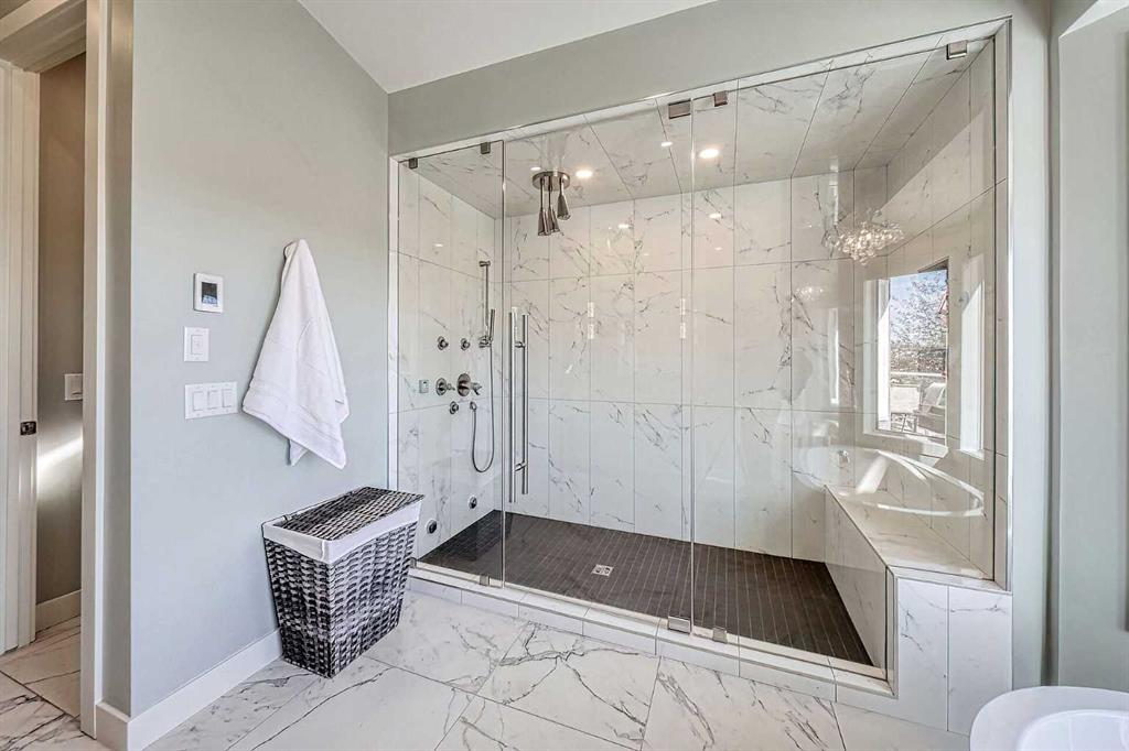 The large primary suite feels like a private retreat with mountain views, a walk-in closet, and a luxurious 5-piece ensuite finished with Carrara marble tile, a deep jetted soaker tub, dual sinks, and a steam shower. A bright main floor office provides the perfect work-from-home space.