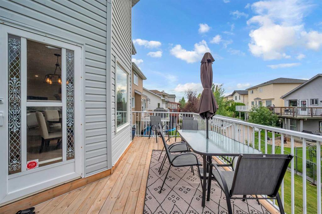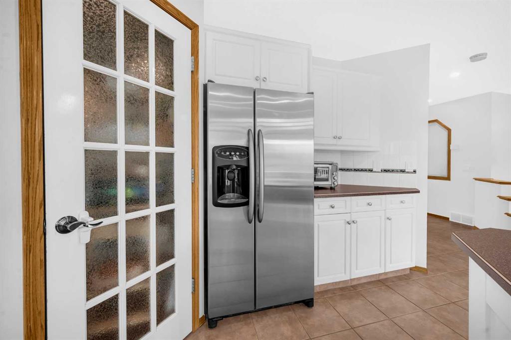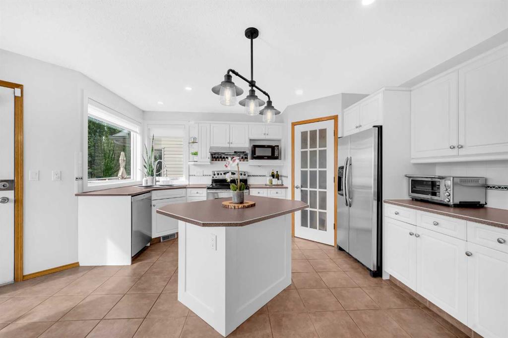 The timeless brick exterior and classic two storey with basement layout create instant curb appeal. Inside, you’re greeted by soaring cathedral ceilings, rich hardwood flooring, a stunning entry chandelier, and large windows that bathe the main floor in natural light. The open concept kitchen features stainless steel appliances, tile backsplash, corner pantry, and generous counter space, perfect for everything from family breakfasts to holiday baking. The adjacent breakfast nook opens onto a sunny west facing deck, ideal for outdoor dining or unwinding at the end of the day.