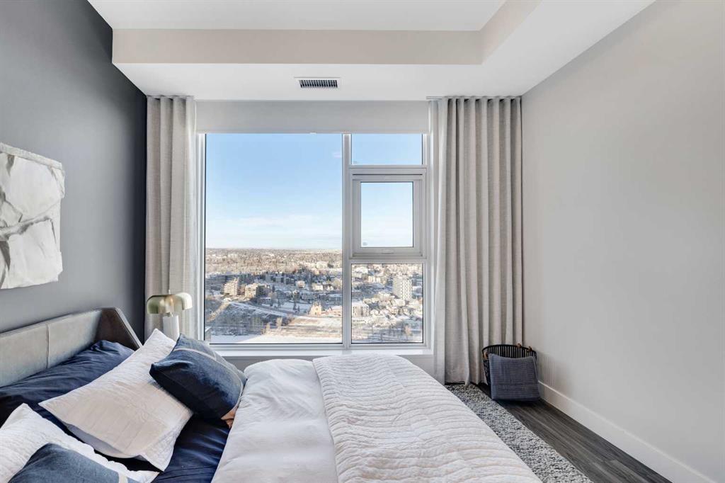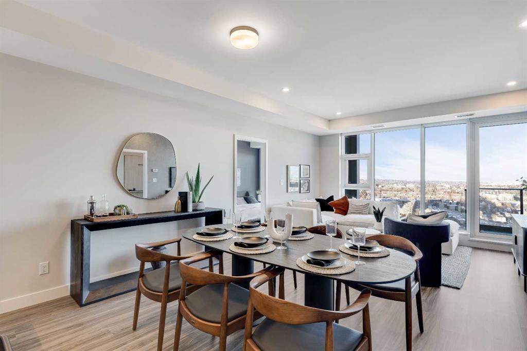 As you step through the entrance, a welcoming foyer ushers you in, providing easy access to your front closet and in-suite laundry. Moving into the expansive main living area, you’re greeted by floor-to-ceiling windows that reveal a panoramic spectacle. The open-concept layout seamlessly merges the kitchen, dining, and living spaces, all adorned with premium finishes, including abundant pot lights and wide plank flooring.