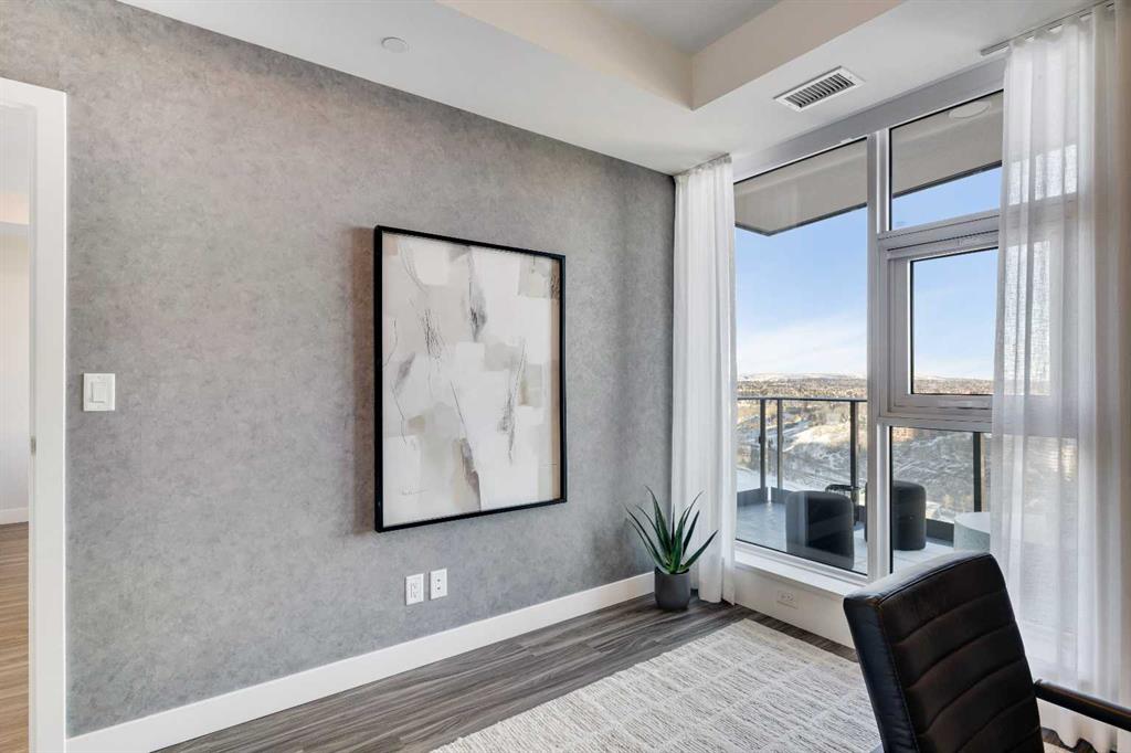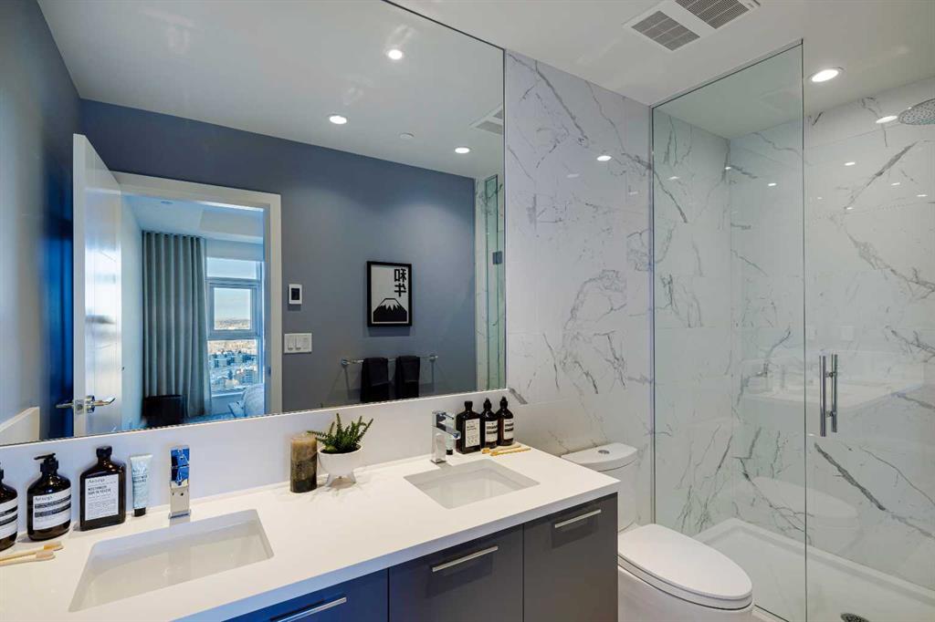 The primary bedroom boasts ample space and a generously sized closet. Mornings are a delight in the 4-piece ensuite, which features double sinks, vanity drawers, and a spacious step-in shower enclosed by a glass door. The second bedroom, currently used as an office, offers versatility, and serves as an ideal workspace or guest retreat. To top it all off, this unit includes an underground parking stall and a storage locker. EV parking options available.
