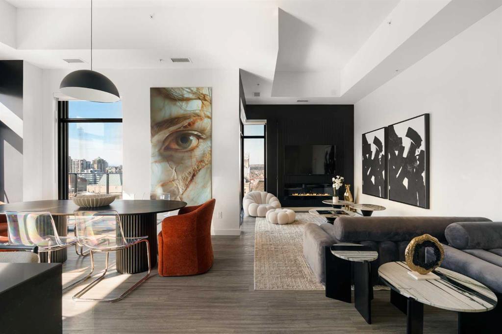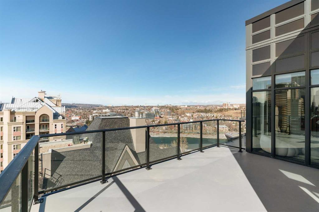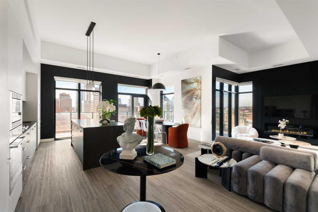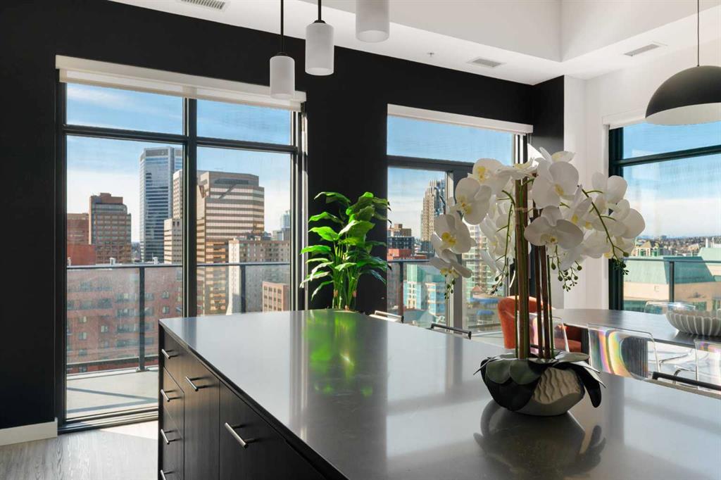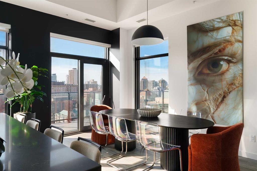 Experience elevated urban living in this luxury penthouse in Downtown Calgary, offering a rare combination of breathtaking views, modern design, and premium finishes. This exceptional 2 bedroom + den, 2 bathroom condo is thoughtfully designed with a seamless open-concept layout that connects the living, dining, and kitchen spaces—perfect for both entertaining and everyday living. The contemporary kitchen features sleek finishes and flows effortlessly into a bright and spacious living area, all framed by expansive windows that capture panoramic views of the Rocky Mountains, Bow River, and Calgary skyline. Step outside onto the expansive wrap-around balcony with west exposure, ideal for enjoying stunning sunsets and outdoor living at its finest. The primary bedroom retreat offers both comfort and sophistication, complete with a spa-inspired 5-piece ensuite featuring a soaker tub, dual vanity, and walk-in shower. A second bedroom and versatile den provide flexibility for guests, a home office, or additional living or storage space. Additional features include titled underground parking, and a dedicated storage locker. Located in the heart of Downtown Calgary, this penthouse offers unmatched access to river pathways, dining, shopping, and urban amenities—making it an ideal opportunity for buyers seeking luxury condo living in one of Calgary’s most desirable locations. A rare penthouse offering with unmatched views, location, and lifestyle—don’t miss your opportunity.