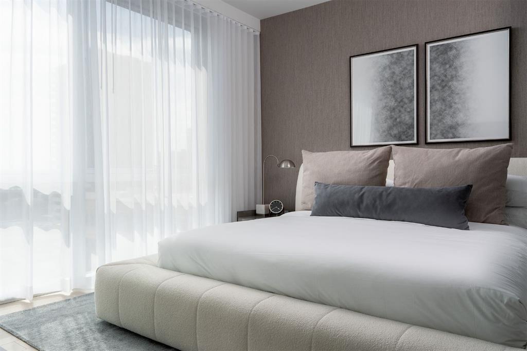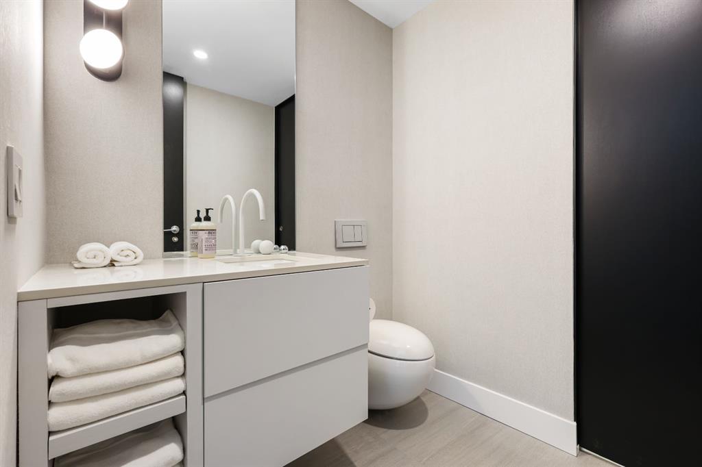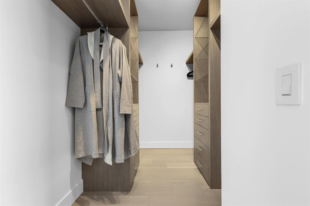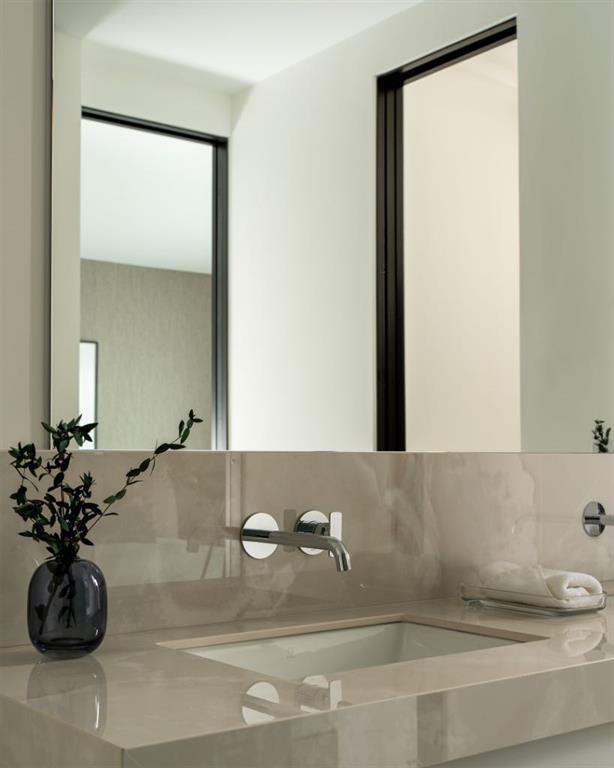 The primary suite creats a sense of separation and retreat. Framed by expansive views, it features a custom walk-in closet and a spa-inspired ensuite with dual vanities, a frees standing soaking tub, and a glass-enclosed shower—every detail considered, every finish elevated. The secondary bedroom, located on the opposite end of the residence for complete privacy, offers its own walk-in closet and elegant ensuite, making it ideal for guests or an executive workspace.