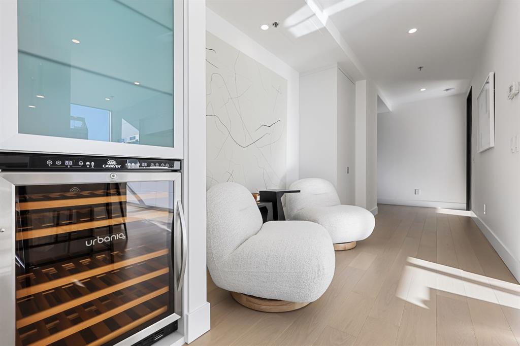 A private balcony extends the living space into the skyline with south western exposure—an outdoor lounge where Calgary’s vibrant energy becomes part of the experience.