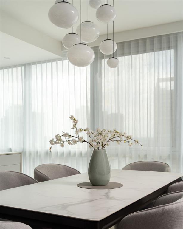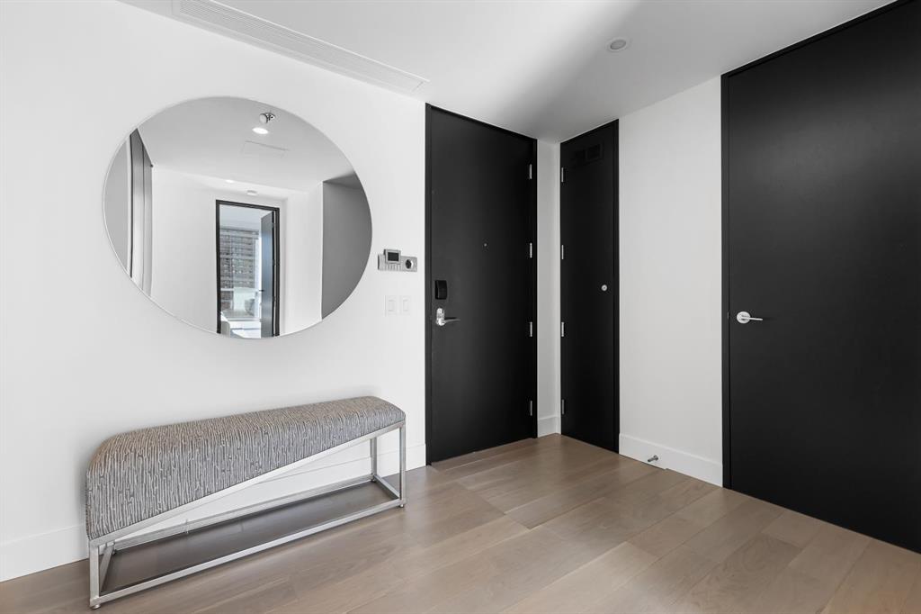 A serene foyer unfolds with custom integrated millwork offering refined storage solutions complete with a package/dry-cleaning locker. A sculptural powder room and dedicated laundry space are discreetly positioned to maintain architectural flow. Moving further into the home, the space opens dramatically—floor-to-ceiling windows wrap the living, kitchen, and dining areas in uninterrupted skyline views, enhanced by automated window treatments that adjust with just a touch, effortlessly setting the mood from dawn to dusk.