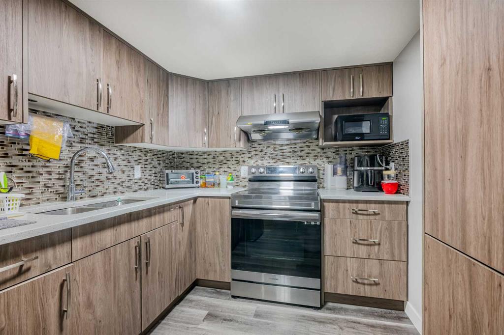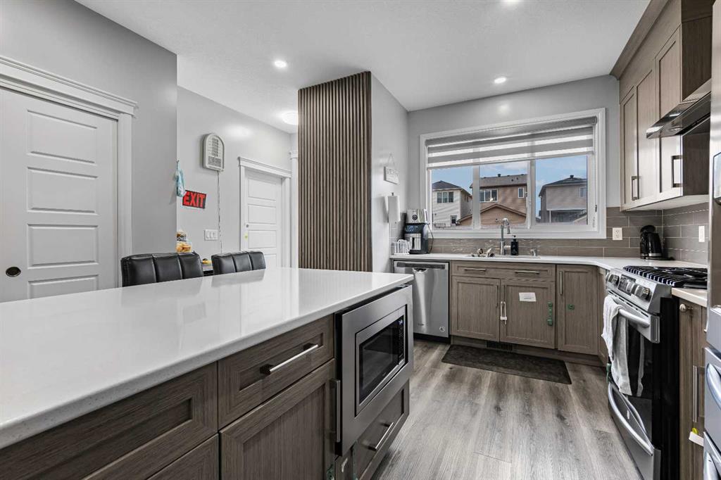 The home boasts vinyl plank flooring on the main level and in the basement, while the upstairs is carpeted. The kitchen showcases quartz countertops, a gas stove, and a built-in microwave in the island. Other desirable features include a 9-foot ceiling on the main floor, an electric fireplace surrounded by shiny tiles, and post-purchase wall decorations with some additional wallpaper.