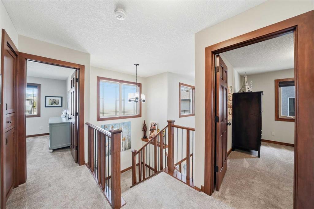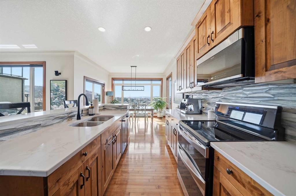 INCREDIBLE MOUNTAIN VIEWS! The coveted ridge location of 185 Sunset Circle will truly take your breath away, offering a daily panorama of the Rockies across all three levels of this exceptional 4 bedroom/3.5 bathroom WALKOUT home. Backing directly onto a walking path leading to Cochrane’s expansive trail system, this fully finished and AIR CONDITIONED two-storey residence sits on a QUIET, LOW TRAFFIC STREET just around the corner from a playground and with all levels of schools nearby. Immaculately clean and move-in ready – just bring your suitcases! The pride of ownership is evident in all of the upgrades and renovations, including FULLY PAID SOLAR PANELS that significantly reduce utility bills, TWO NEW HOT WATER TANKS installed in 2022, and PREMIUM SMART BLINDS with dual blackout and solar shades. Every detail has been meticulously updated, from the FRESH PAINT and NEW PREMIUM CARPETING to the replacement of every light fixture. The build quality is evident in the solid wood doors, refinished trim and banisters, and wood shelving in all the closets and pantry. With an open plan concept, the main floor offers 9-foot ceilings and beautiful HARDWOOD with inlay detailing, leading to a large KITCHEN RECENTLY RENOVATED with elegant QUARTZ COUNTERTOPS, a new tile backsplash, premium appliances including a double oven, a new KitchenAid dishwasher, and custom drawer pull-outs. Relax on the deck overlooking the backyard, BBQ and enjoy the mountain views and frequent wildlife sightings. There is also an awning for shelter on hot days! Completing the main floor is a laundry room/mud room with a utility sink and powder room – also renovated to match the kitchen. Upstairs, the primary retreat remains a standout, strategically positioned to capture the mountain view, complete with a spa-like ensuite and walk-in closet. Completing the upper level are two generously sized additional bedrooms. The bright walkout level features IN FLOOR HEATING, a fourth bedroom, family room, a storage/hobby room, and a radon mitigation system for total peace of mind. Outside, the professionally landscaped backyard with NEWLY INSTALLED TURF, connects you directly to recreation along the ravine pathways. Enjoy your private backyard space by the fire pit or barbecuing with friends on the patio. The cherry on top of this remarkable property is the FULLY INSULATED, HEATED, OVERSIZED GARAGE! This is truly a once in a lifetime home offering a laid-back Cochrane lifestyle with MILLION DOLLAR VIEWS for only $889,900. Call your Realtor for a private viewing!