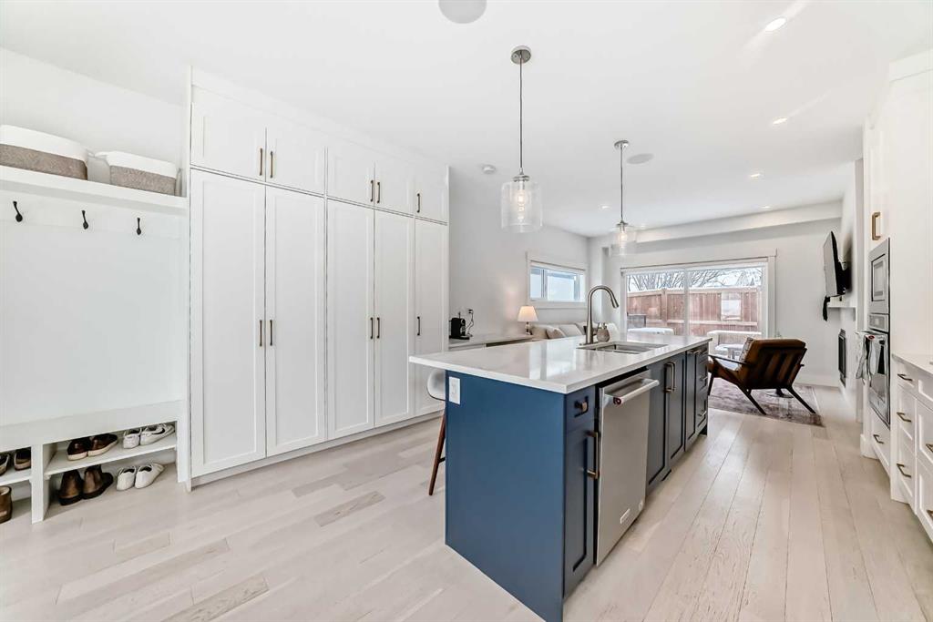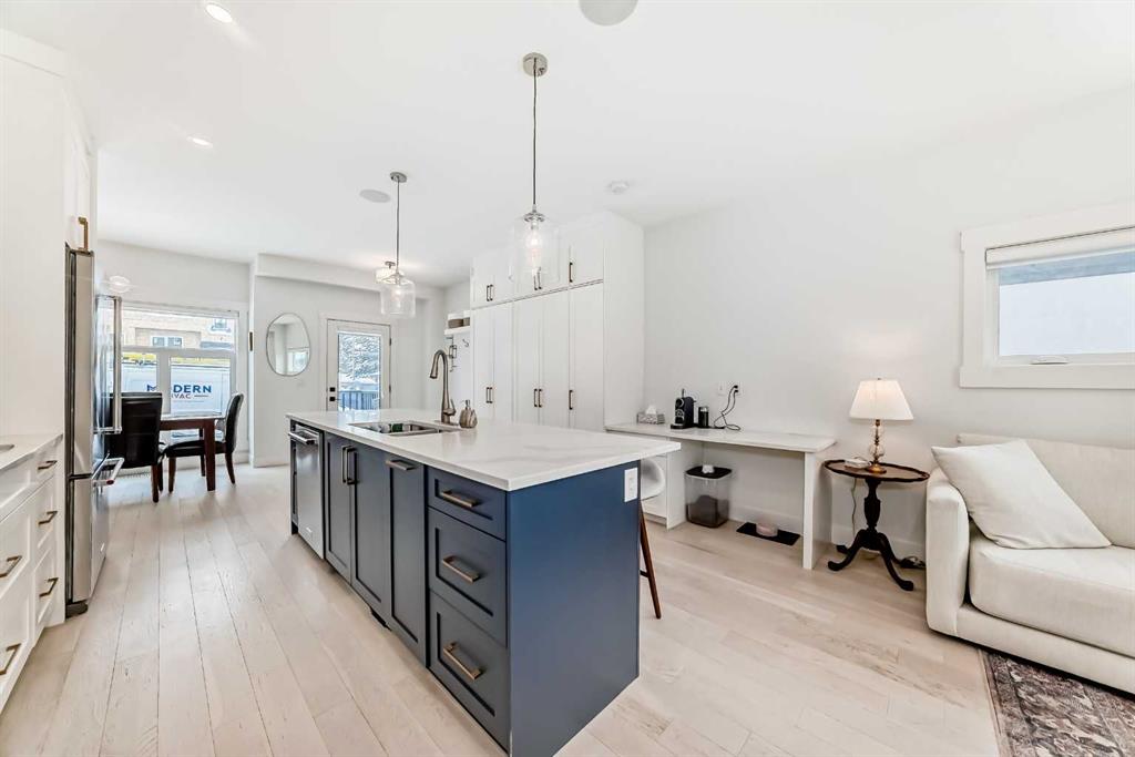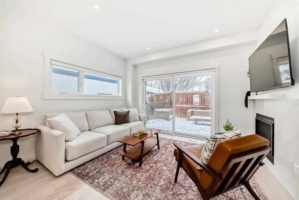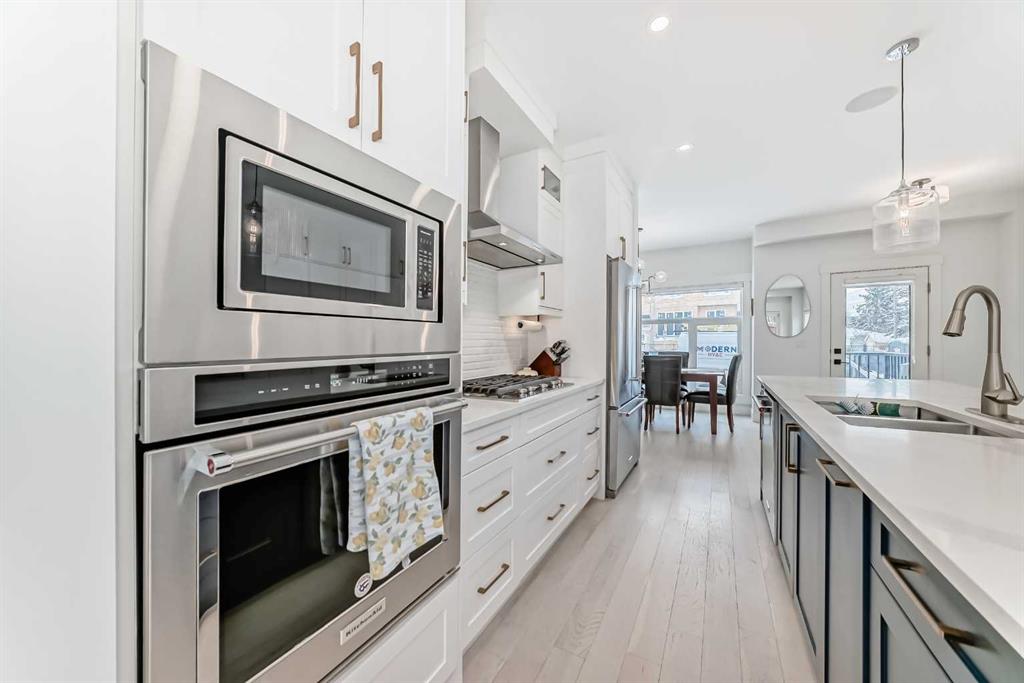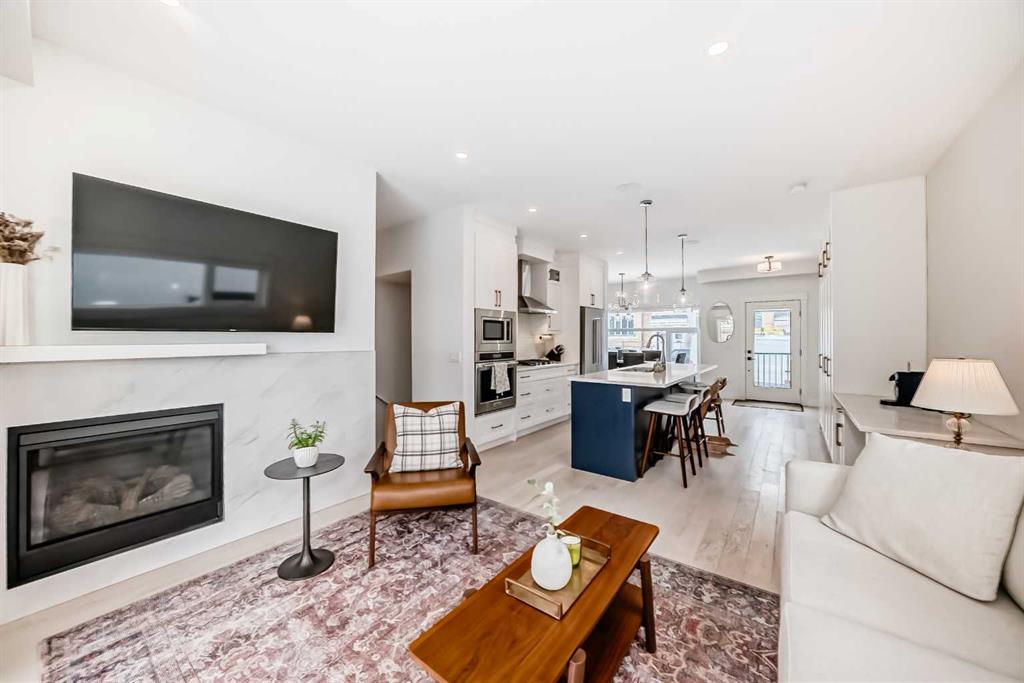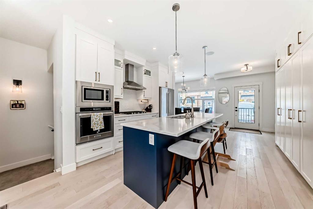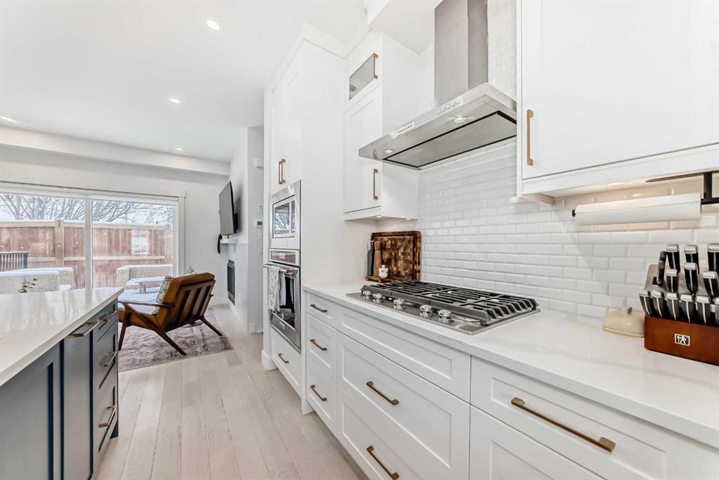 Main floor features an open concept design with hardwood flooring, large windows, and a well-appointed kitchen with quartz counters, gas range, full-height pantry, and breakfast bar. Living room with gas fireplace and direct access to the back deck with natural gas hookup.