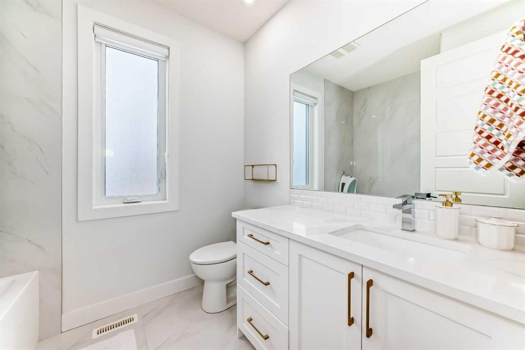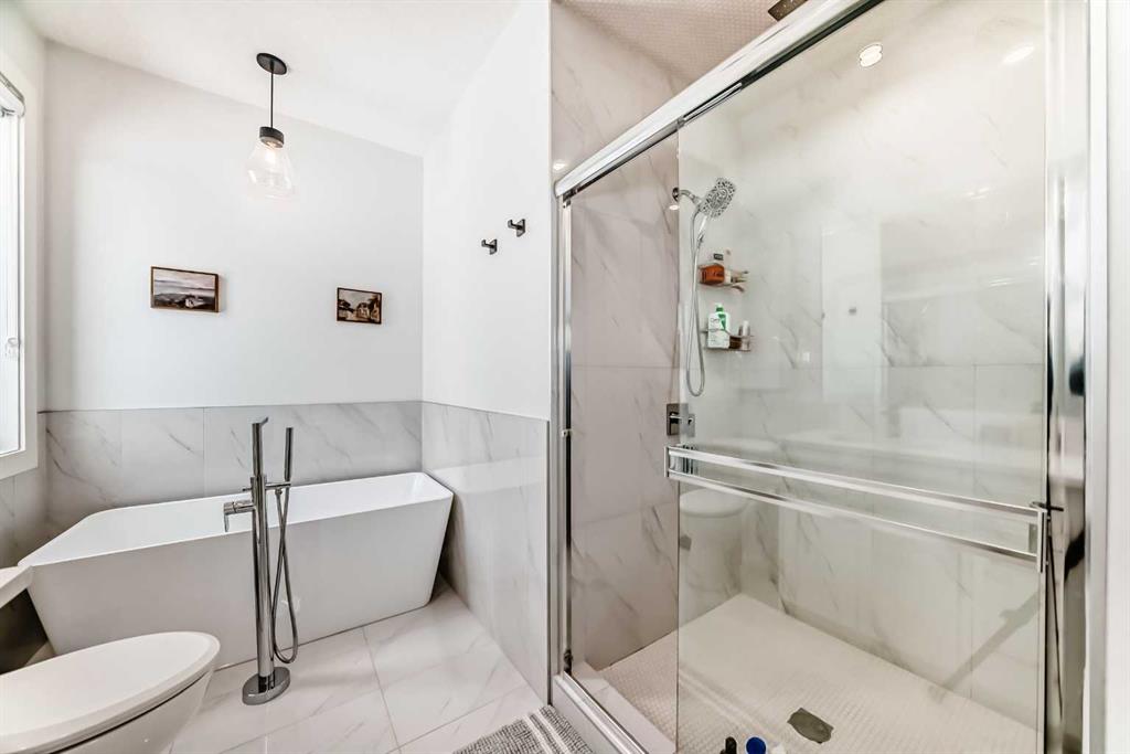 Upstairs includes two primary bedrooms. The main suite offers a huge walk-in closet and 5-piece ensuite with soaker tub and separate shower. Second bedroom also includes a walk-through closet and 4-piece ensuite. Stacking laundry in upper hallway.