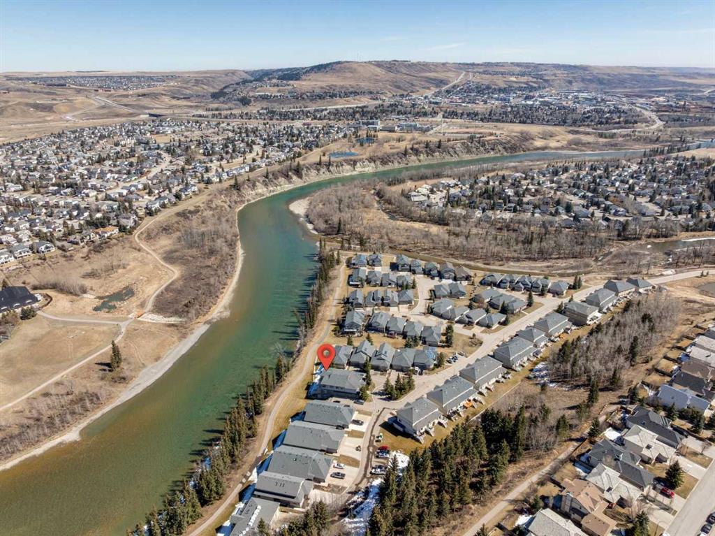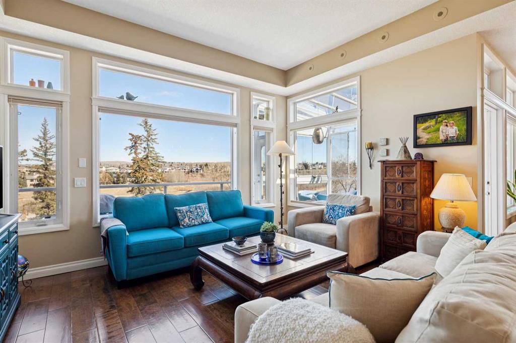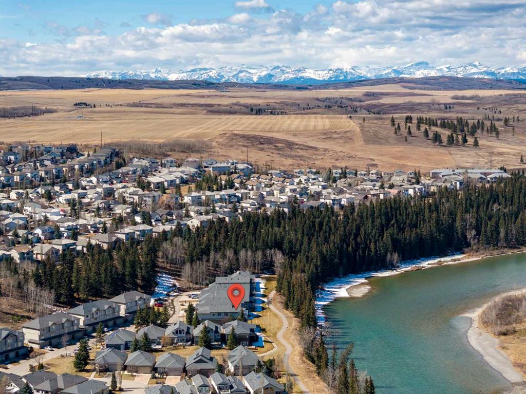 WOW! Prepare to be impressed by this stunning, ultra-stylish, recently updated TOP FLOOR condo offering breathtaking, UNOBSTRUCTED VIEWS of the Bow River, River valley and ROCKY MOUNTAINS! This exceptional home delivers a truly unique lifestyle, featuring a PRIVATE ELEVATOR with direct access to your unit and a HEATED DOUBLE GARAGE with additional storage. Nestled along the Bow River and Jumping Pound Creek, this tranquil setting is surrounded by scenic pathways, creating the perfect backdrop for relaxing, entertaining, and enjoying the outdoors year-round. Inside, the home is flooded with natural light, showcasing soaring 10-foot ceilings and beautiful engineered flooring throughout. The open-concept main living area is both elegant and functional, highlighted by a modern kitchen complete with a gas stove, stainless steel appliances, and granite countertops—ideal for hosting or everyday living. To the front of the unit, you’ll find two spacious bedrooms, including a large primary retreat with a luxurious 4-piece ensuite featuring a soaker tub. A second 4-piece bathroom also offers granite countertops. A bright and spacious office provides an ideal work-from-home space. This home is loaded with premium features, including AIR CONDITIONING and convenient ATTIC STORAGE for seasonal items. Recent upgrades elevate both comfort and style, including a STUNNING 3 SEASON SUNROOM ($34,000 ), new sliding doors and designer lighting throughout the entire home. Additional updates include LG washer and dryer (Nov 2023), Whirlpool refrigerator (2022), and Bosch dishwasher (2025). With unparalleled views, upscale finishes, and a serene natural setting, this is a rare opportunity to enjoy refined riverside living at its finest. Book your showing today!!